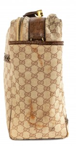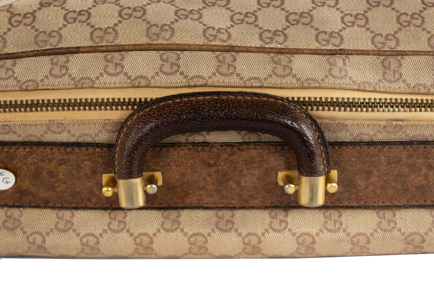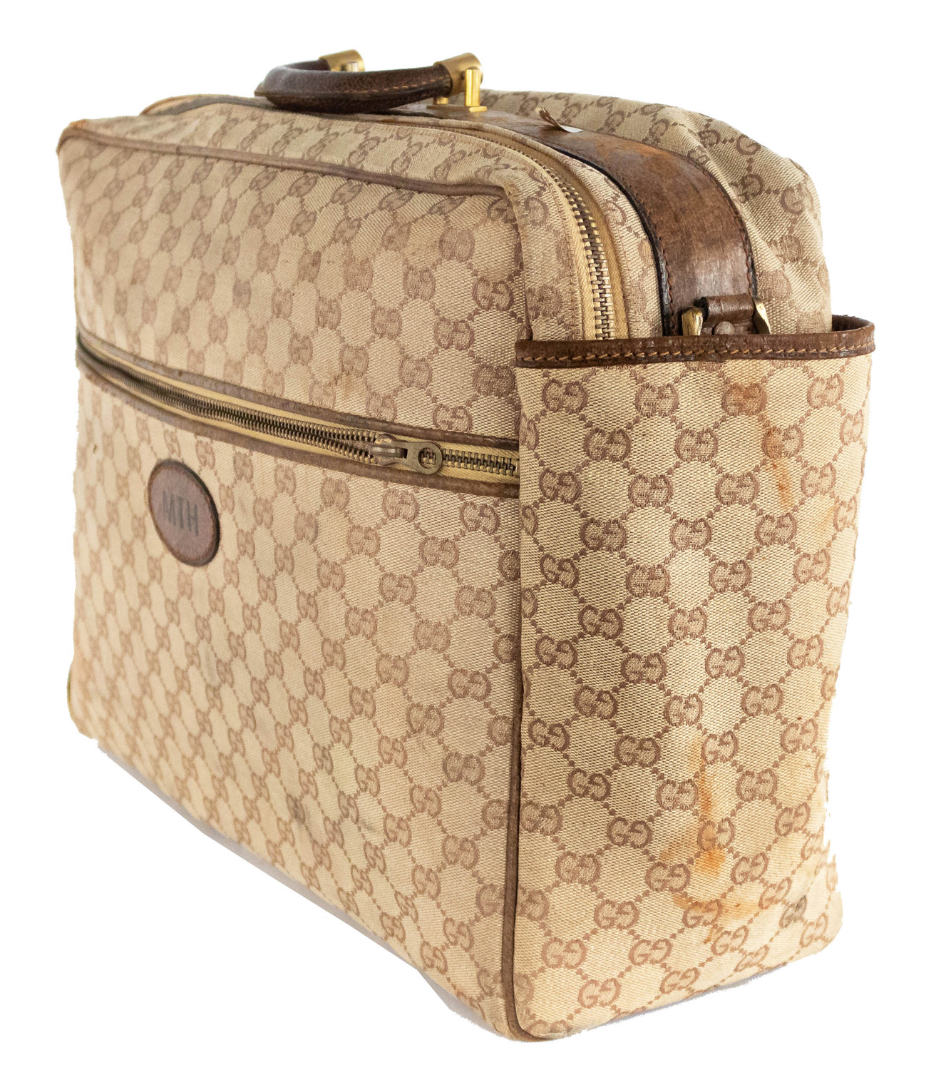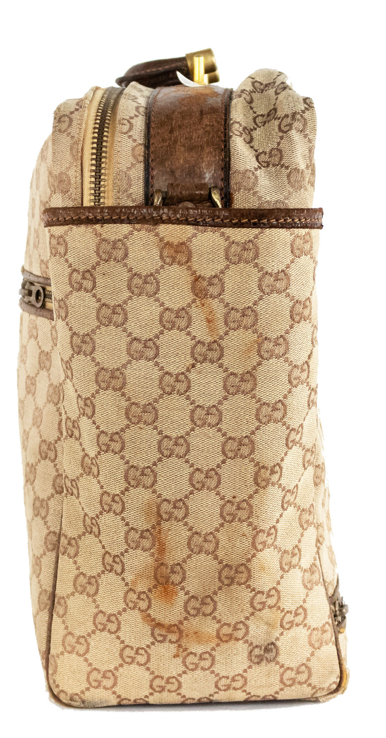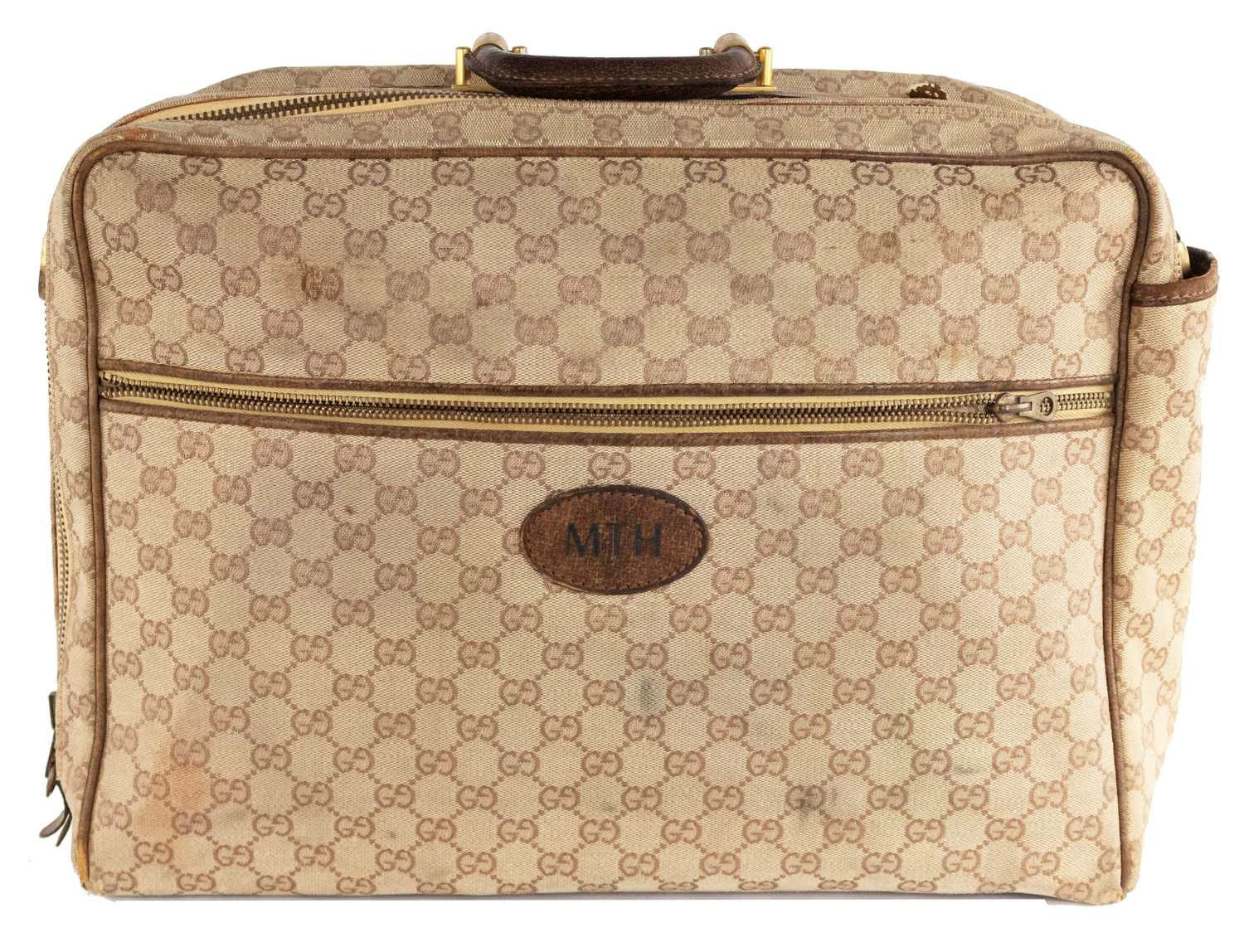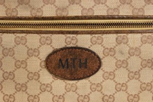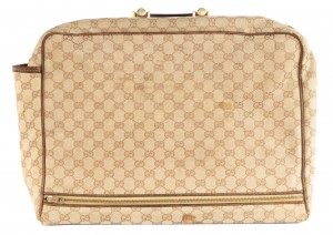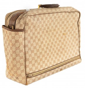 American Mid-Century (1960s) GUCCI design beige fabric upholstered small suitcase valise / luggage with brown leather trim and handles (with initials ACH) (Related item: MP1416F)