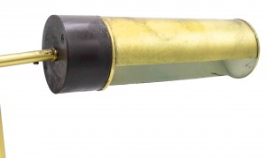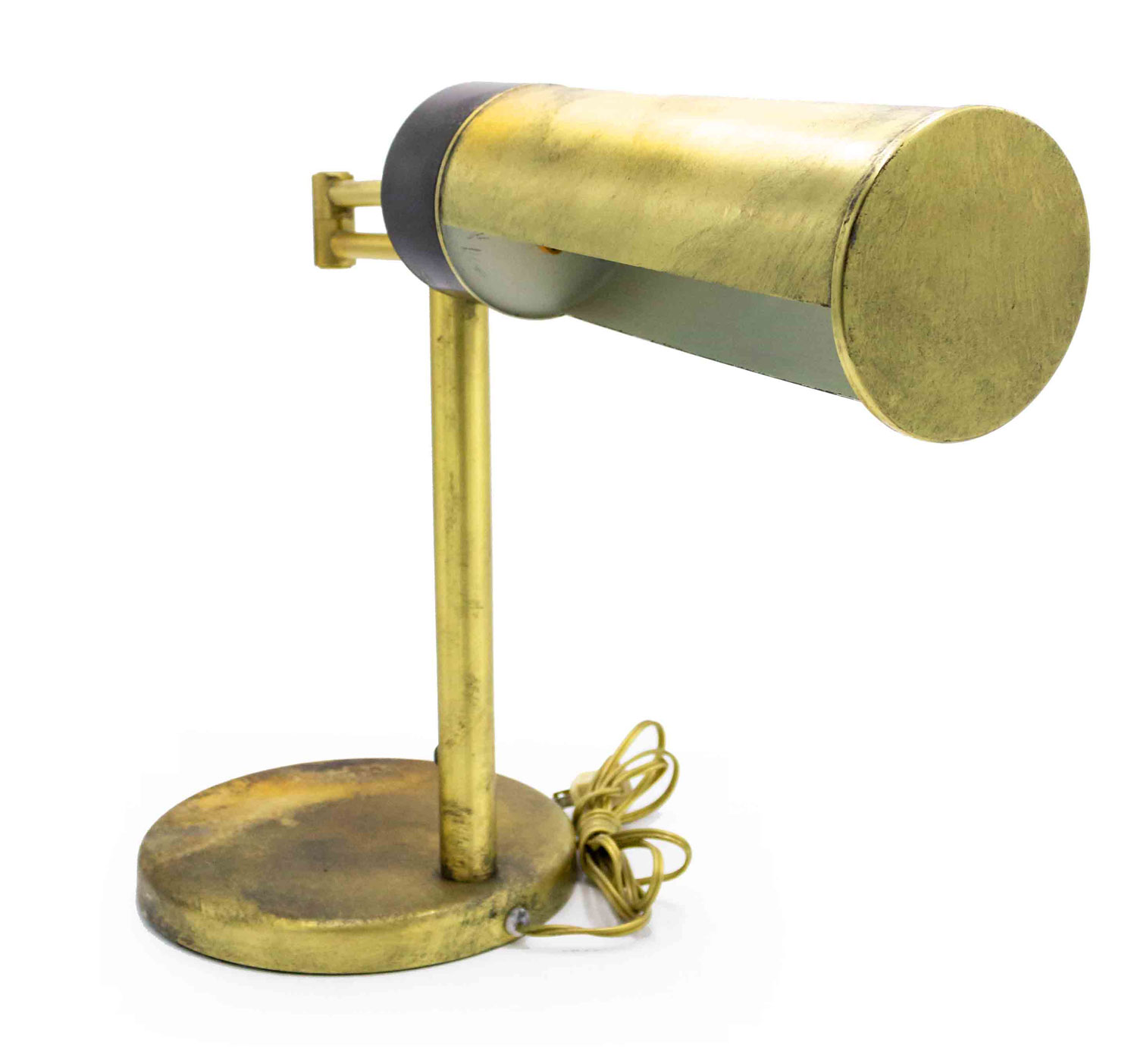 Mid-Century brass desk lamp with swivel arm and cylindrical brass shade. Round base with attached wiring (attributed to NESSON)