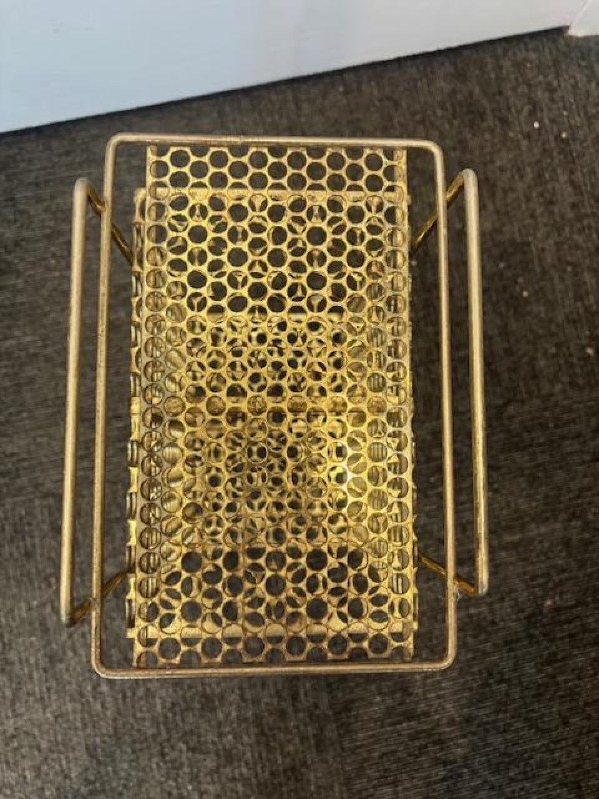 Mid-Century (1950s) American brass mesh magazine rack / telephone table having 2 top handles and a shelf resting on 4 thin tubular legs