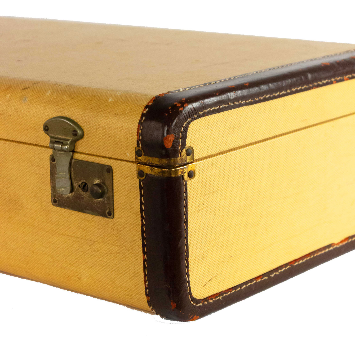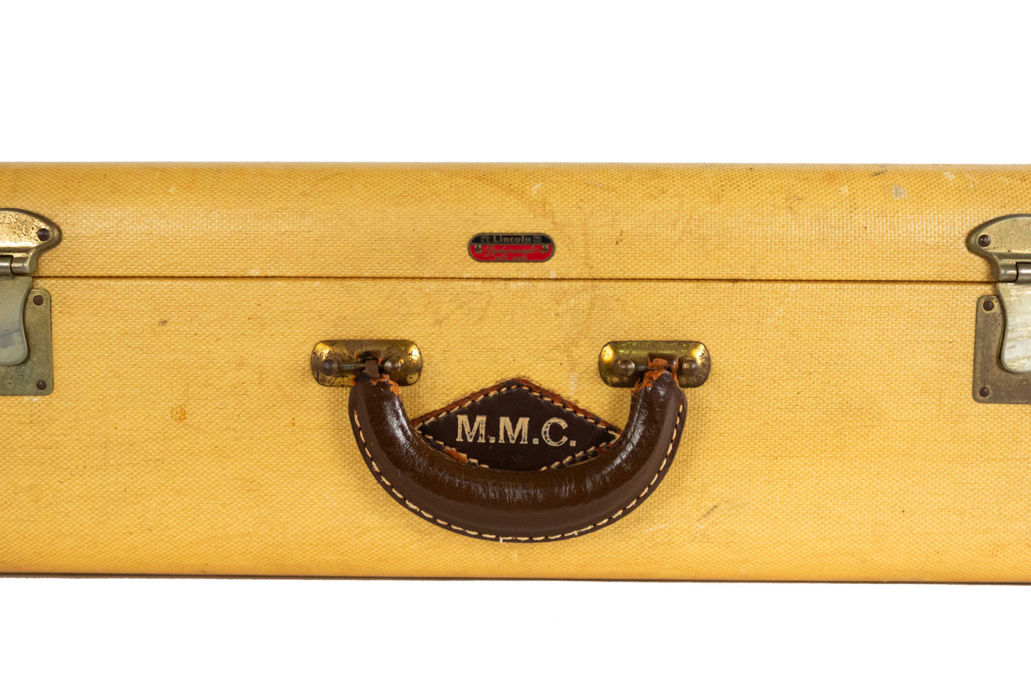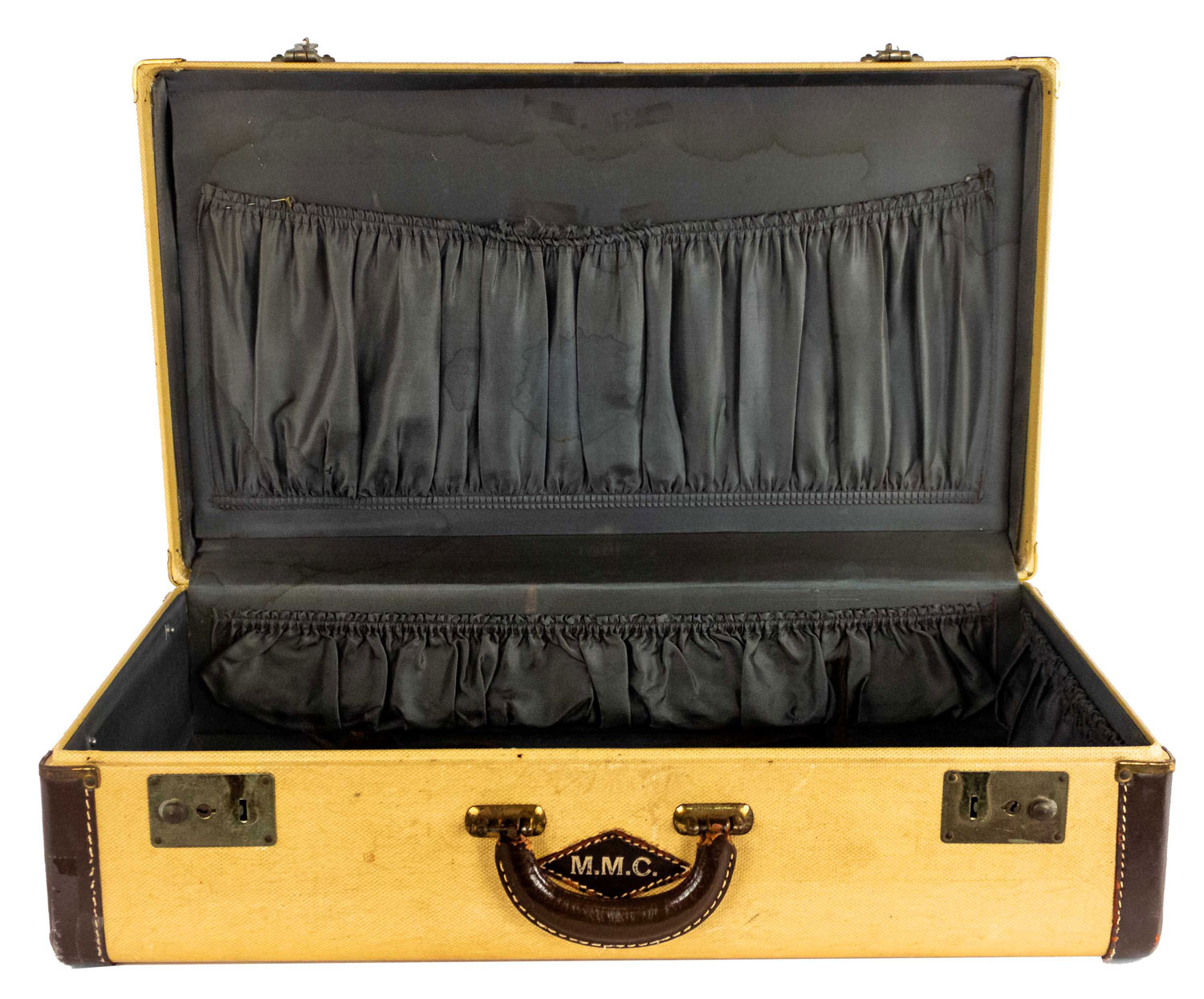 American Mid-century cream woven and dark brown leather trim suitcase (LINCLON) (valise) with initials: "M.M.C.