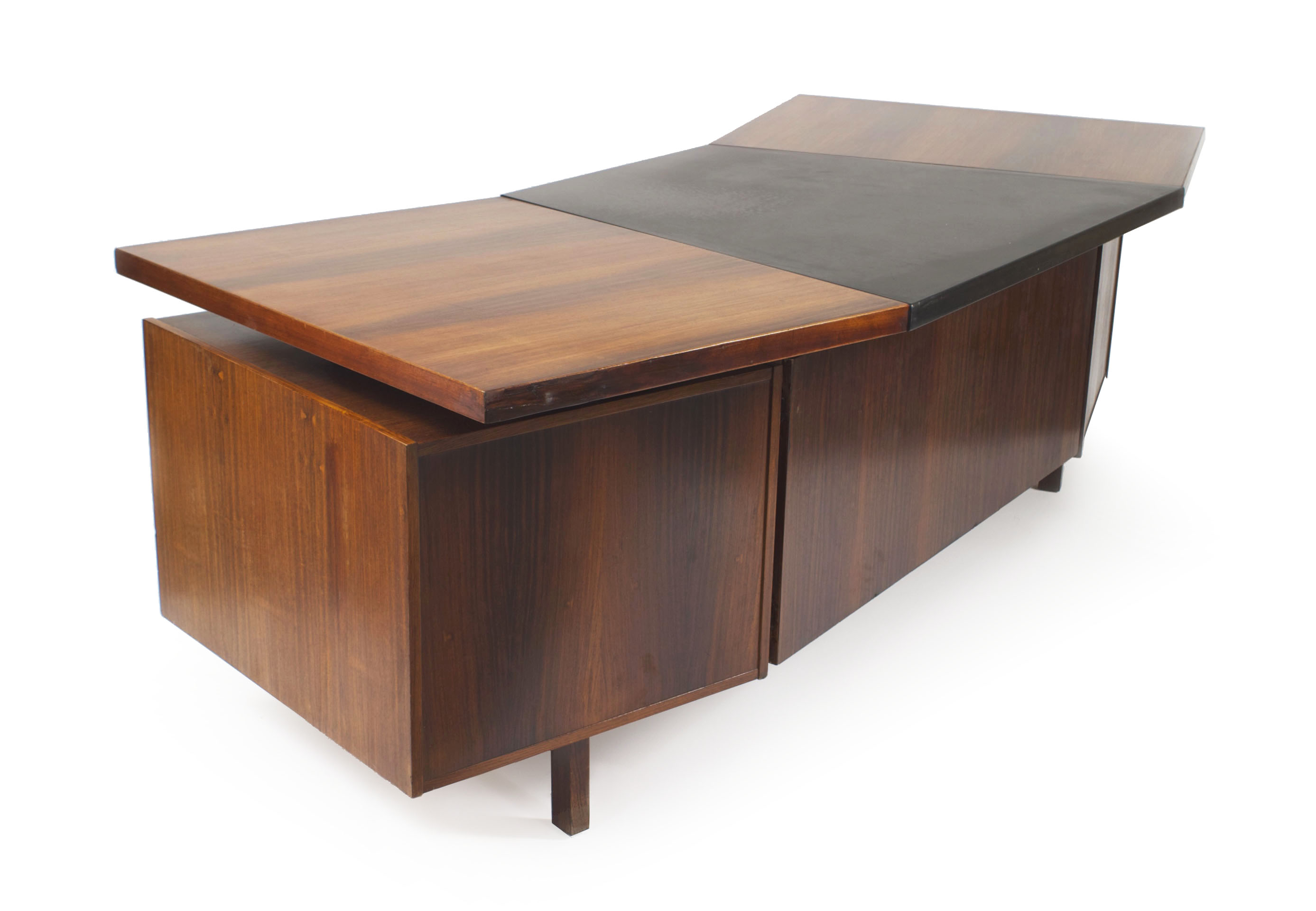 Mid-Century (1960's) Dutch rosewood executive desk with a cantered 3 section shape having a centered vanity panel and set of 3 & 2 drawers with chrome bar handles over a raised top having a centered leather section
