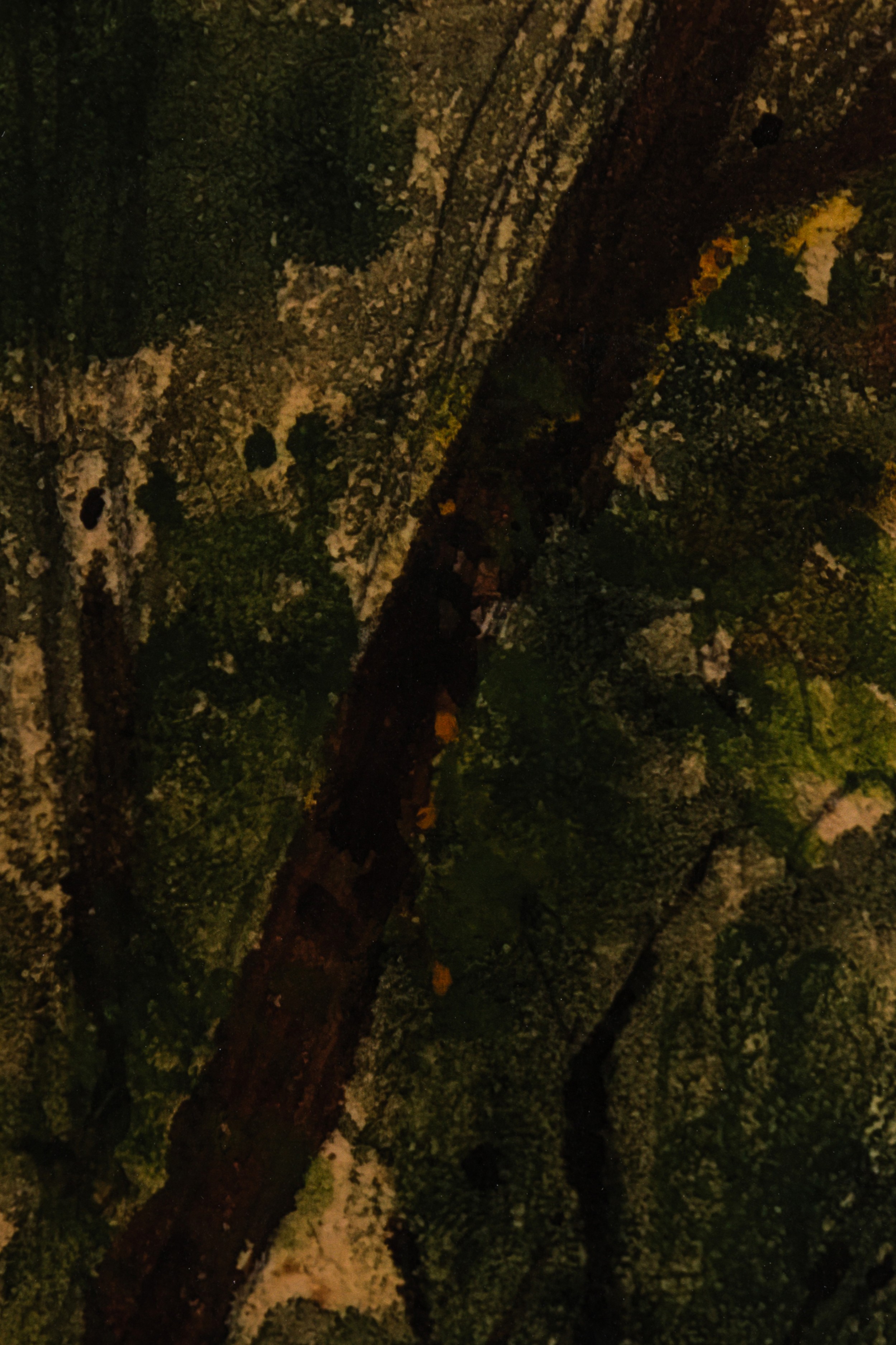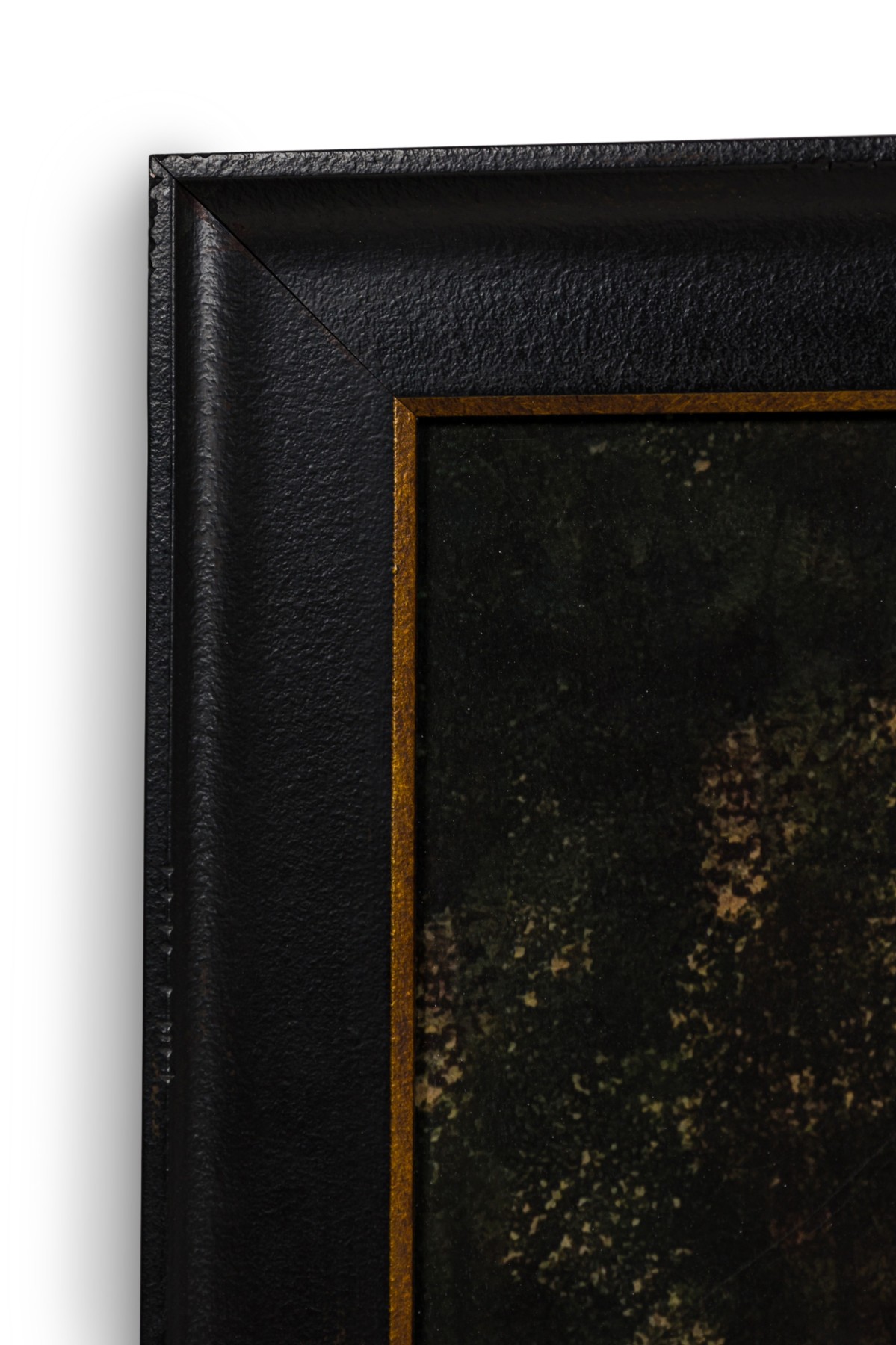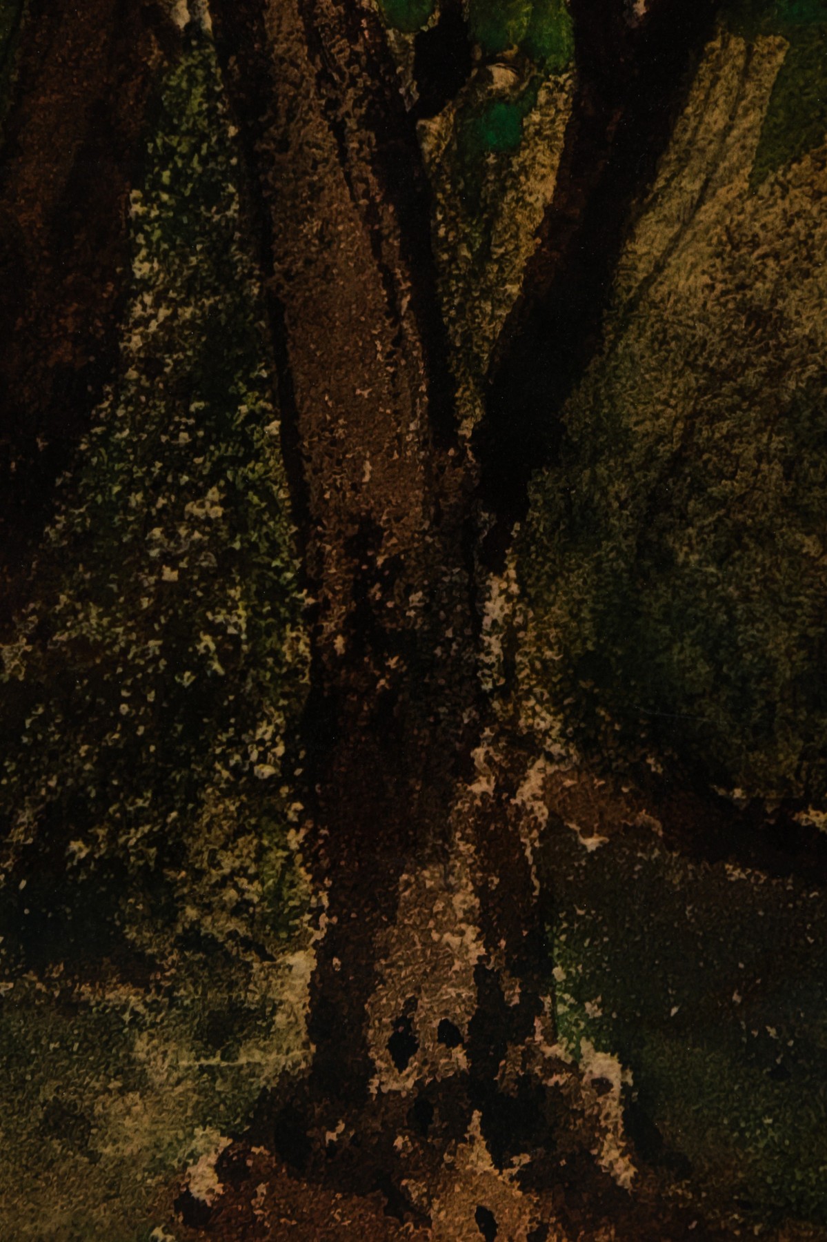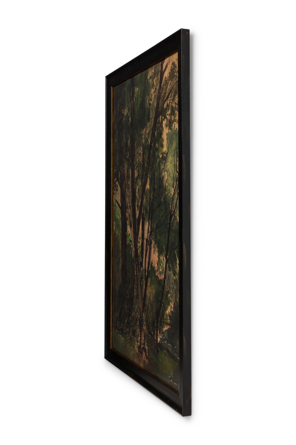 Mid-Century landscape print of a watercolor depicting a dense forest scene in deep green and brown tones. Framed in a black wood frame with a gold inner edge.