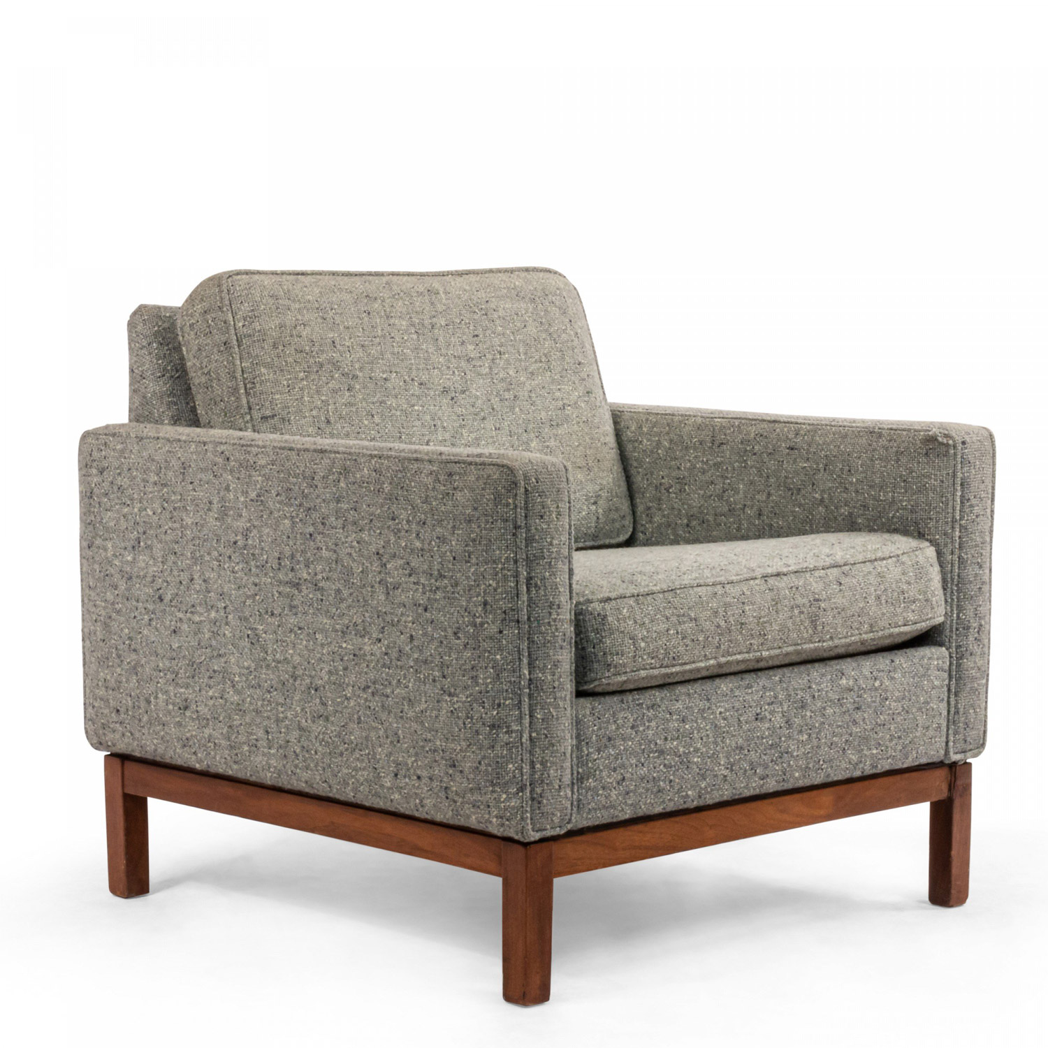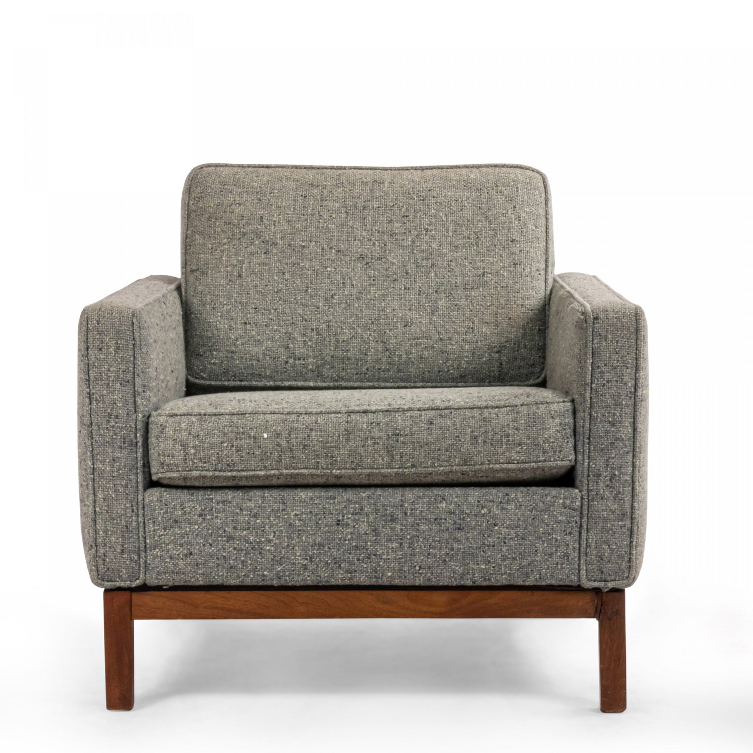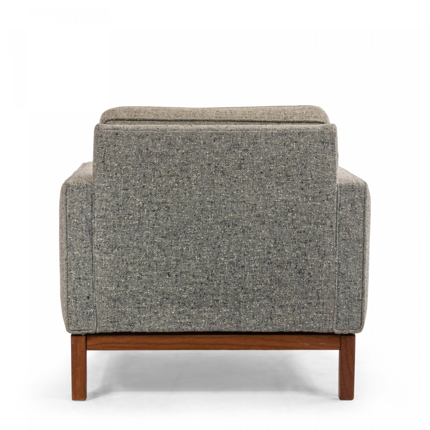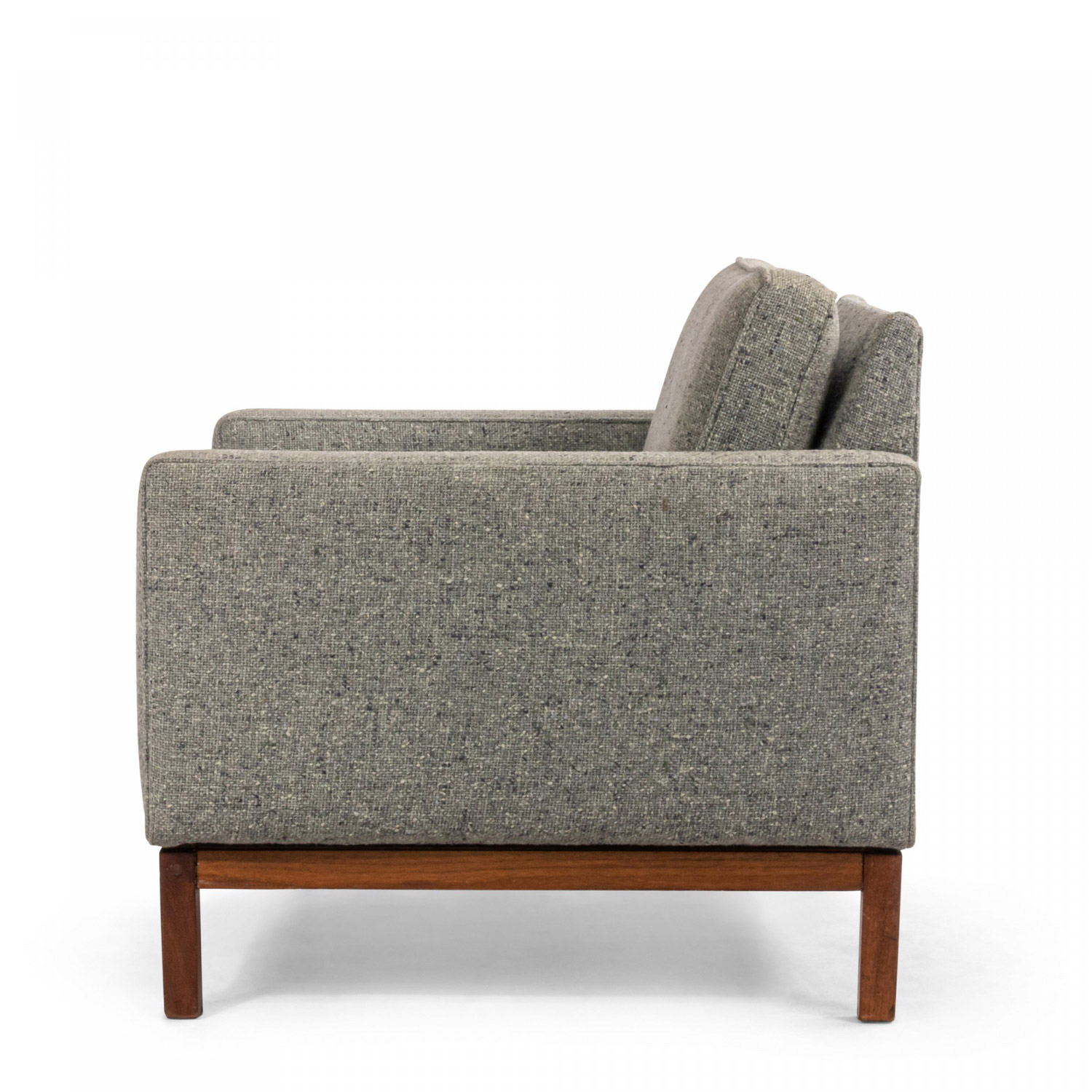 3 American Mid-20th Century gray upholstered club chairs resting on teak legs & base with seat & back cushions (PRICED EACH) (See also: matching loveseat: MP0065A) Contemporary