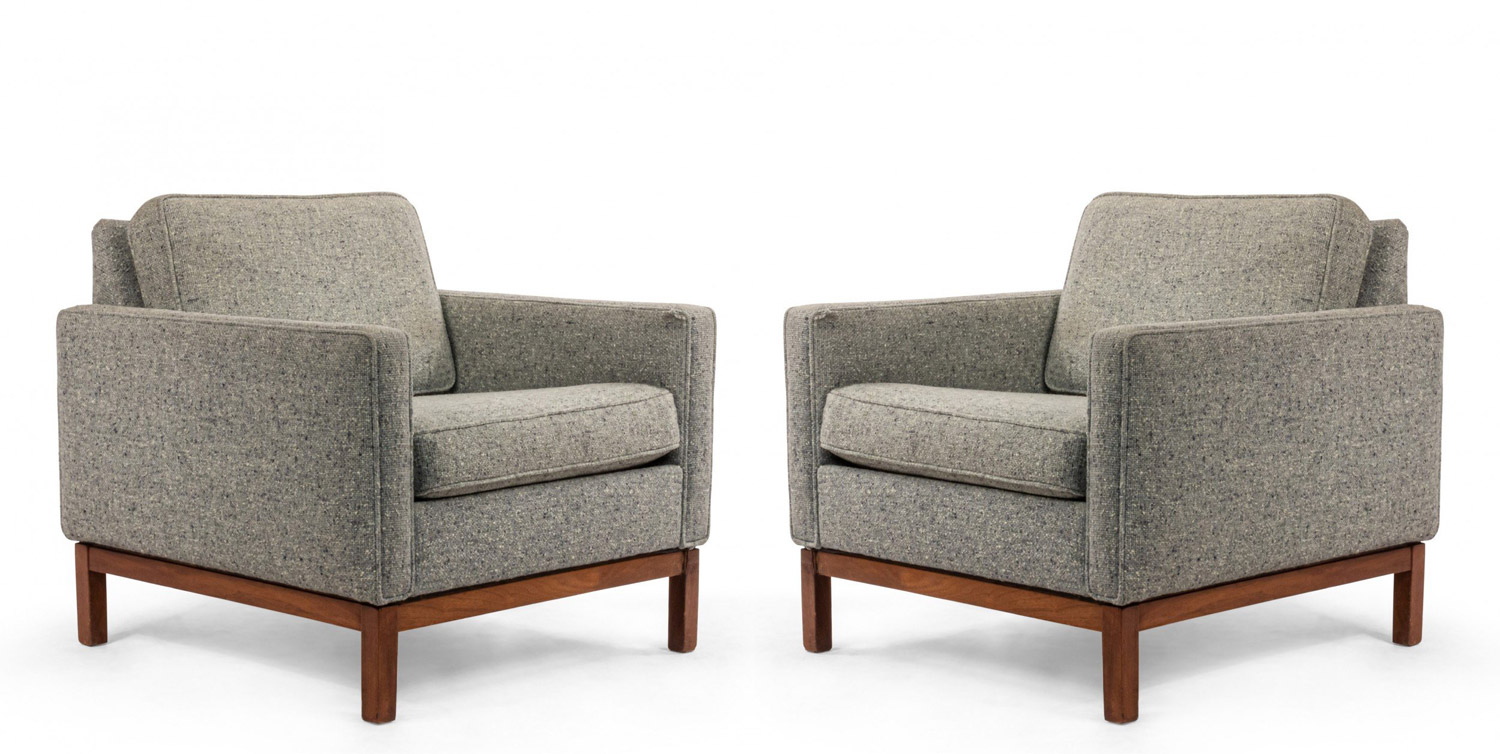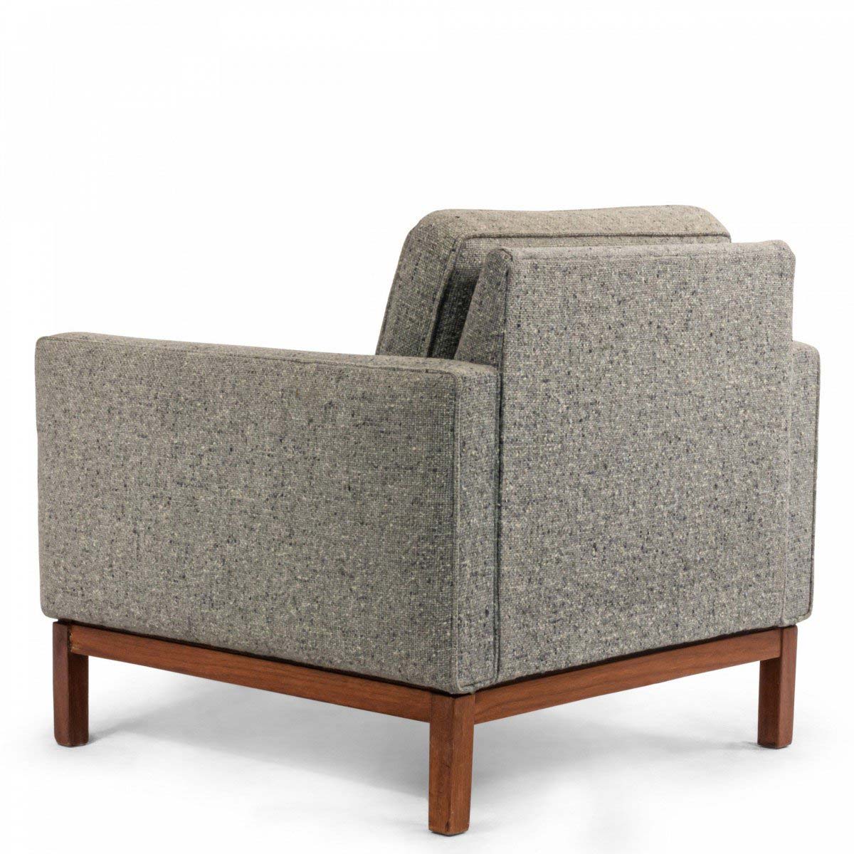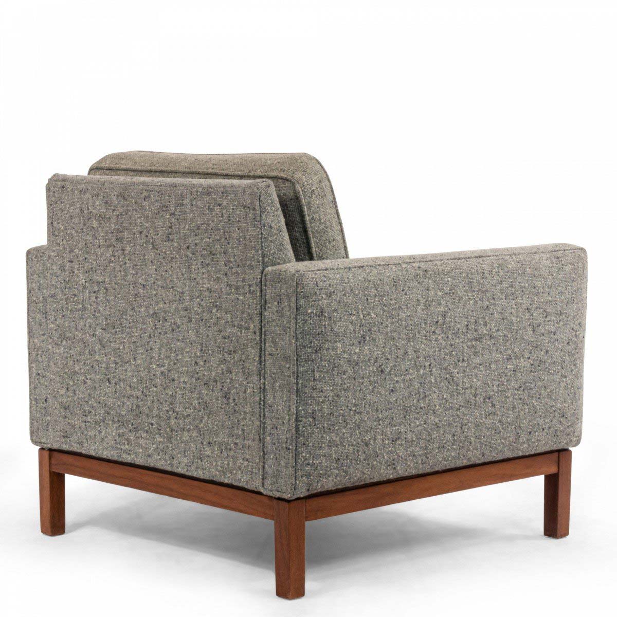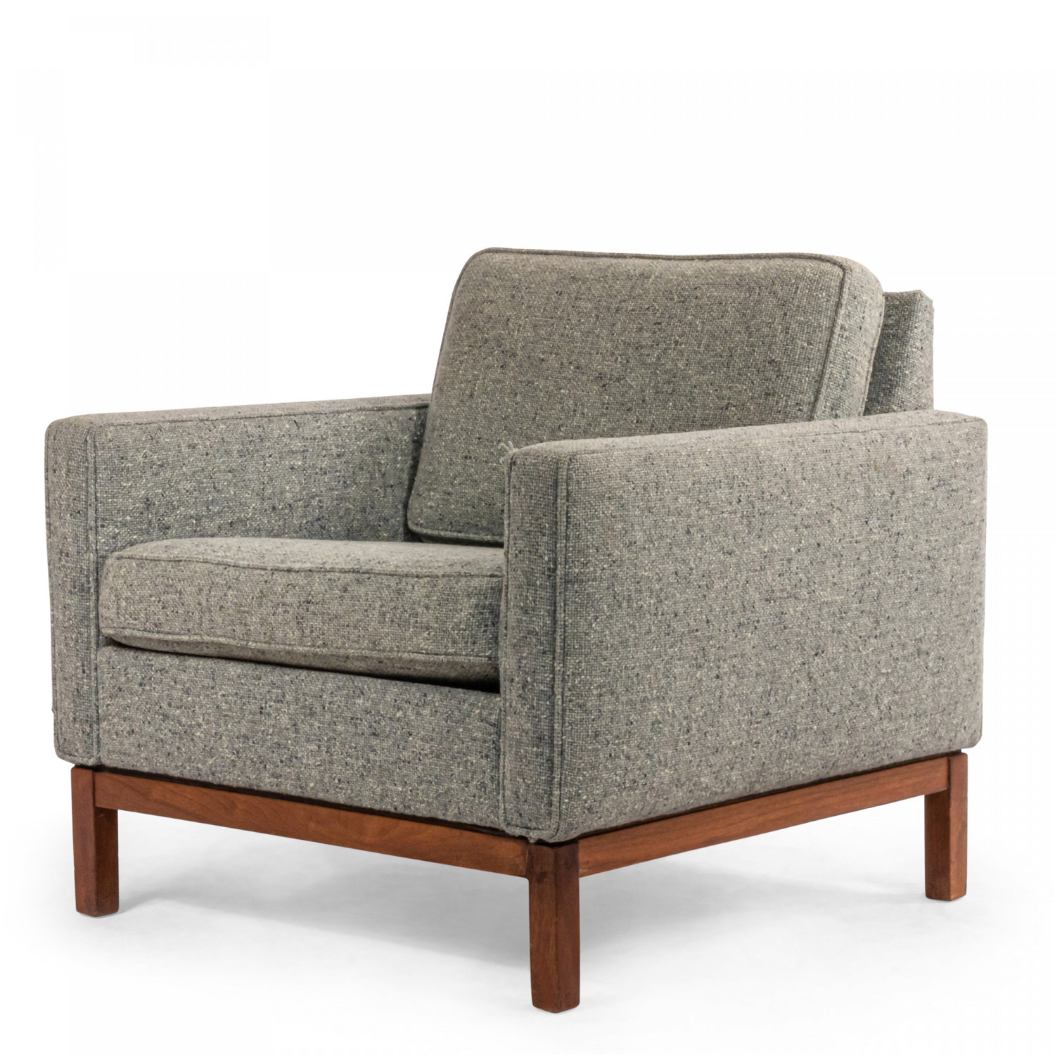 3 American Mid-20th Century gray upholstered club chairs resting on teak legs & base with seat & back cushions (PRICED EACH) (See also: matching loveseat: MP0065A) Contemporary