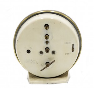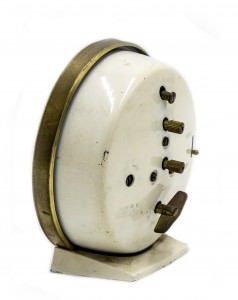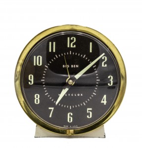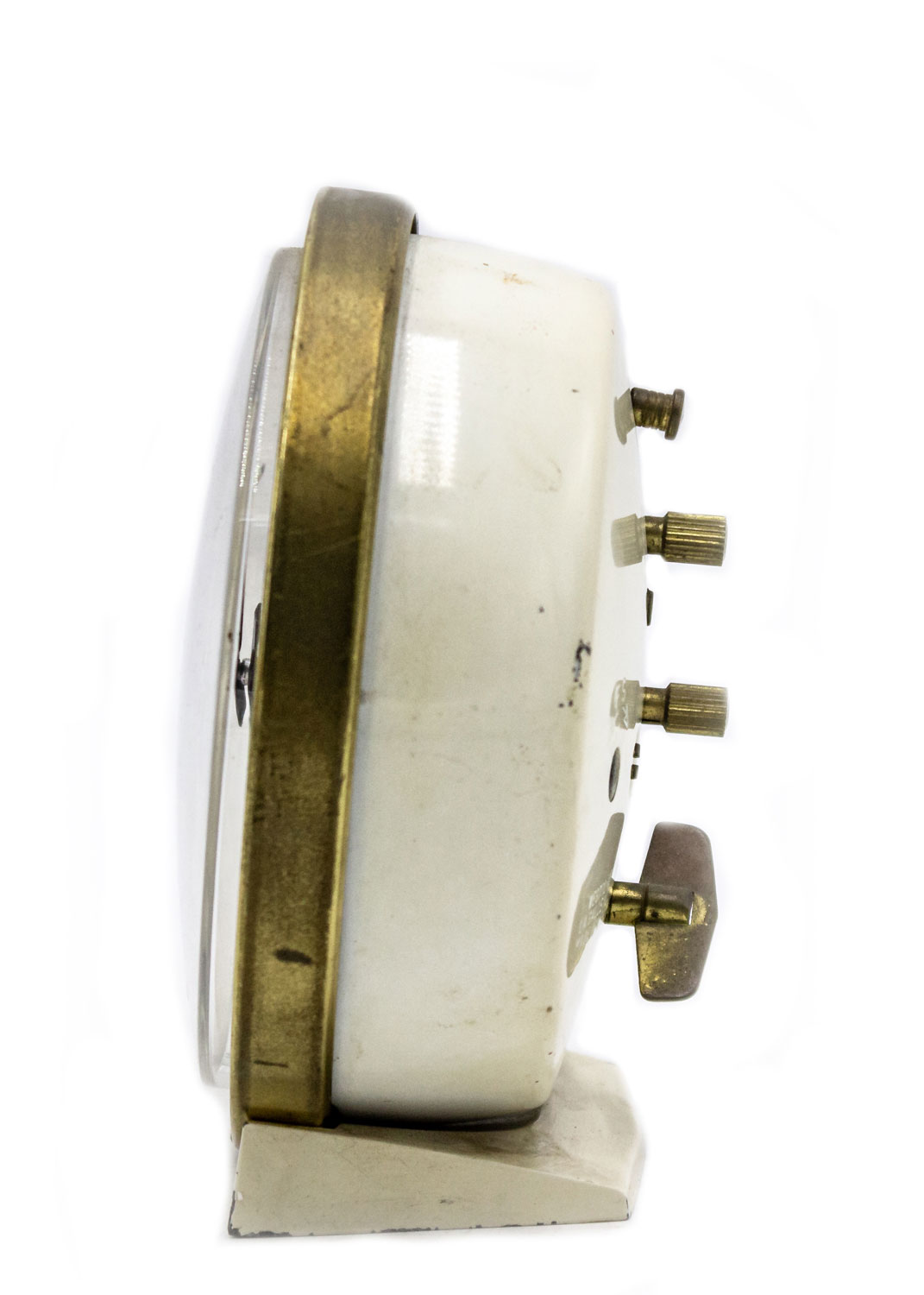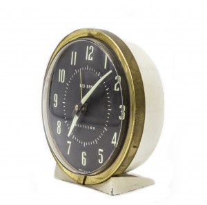 Mid-century round platform based cream metal alarm clock with a black face, gold rim and white numbers