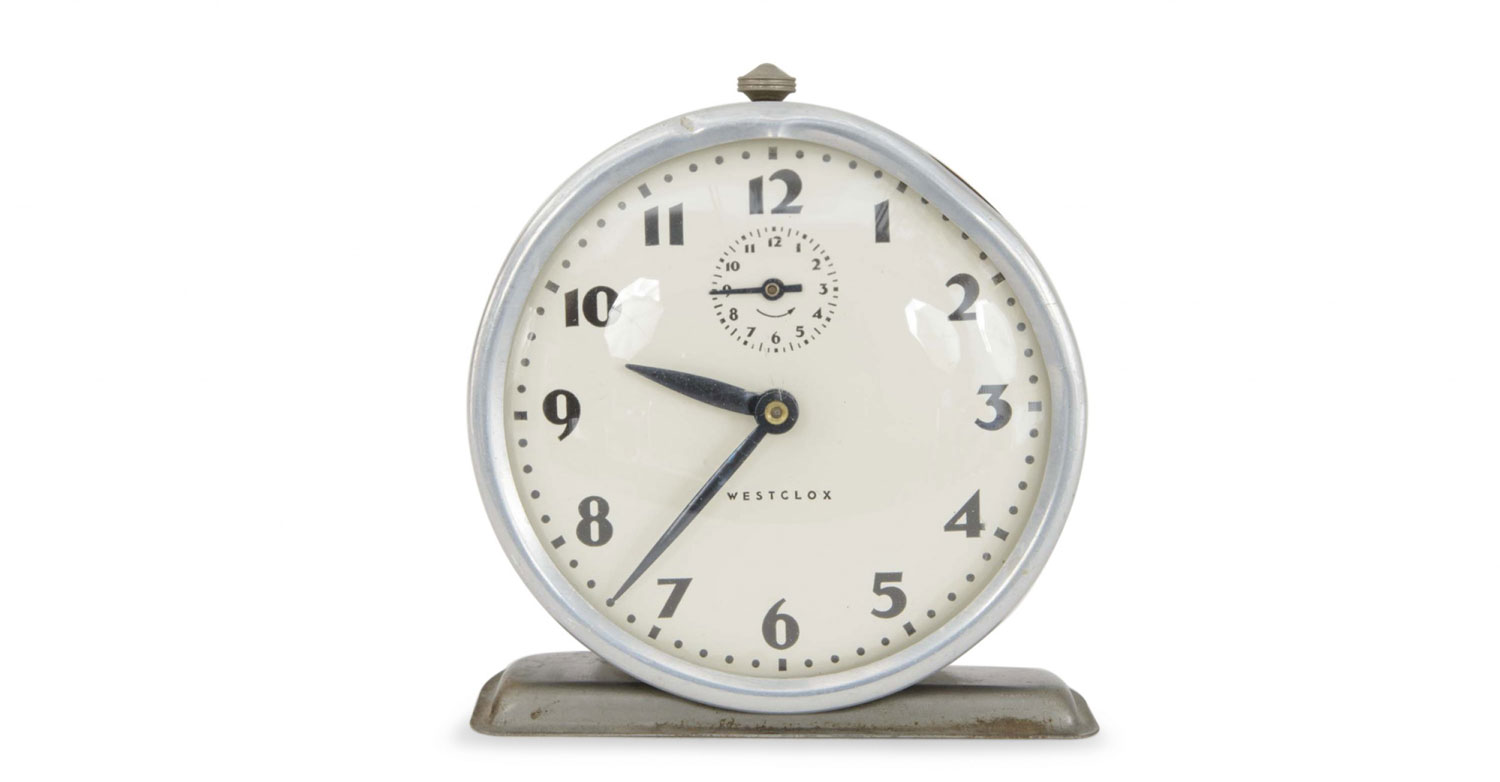 Mid-Century round platform based metal alarm clock with a white face and black numbers