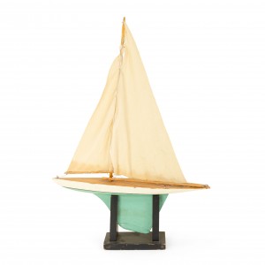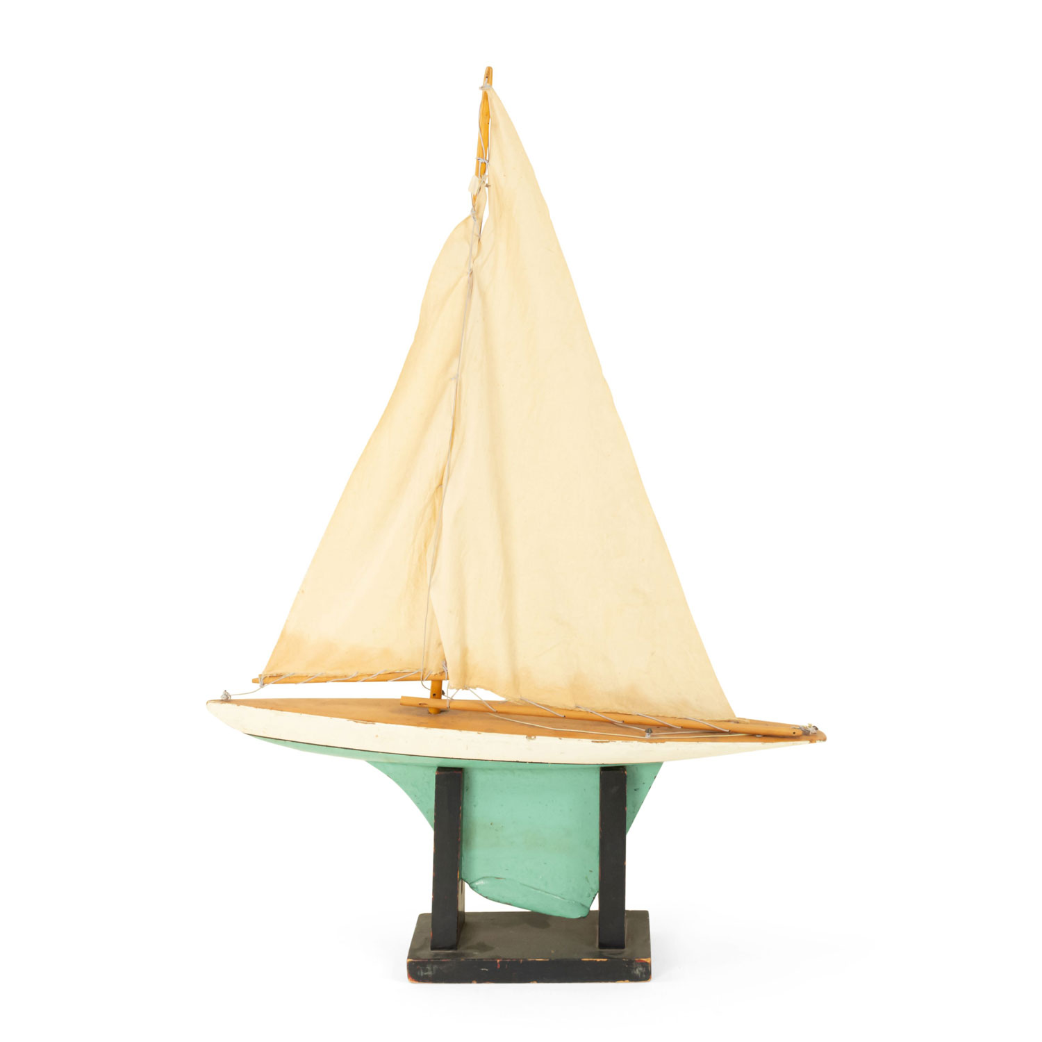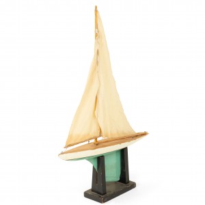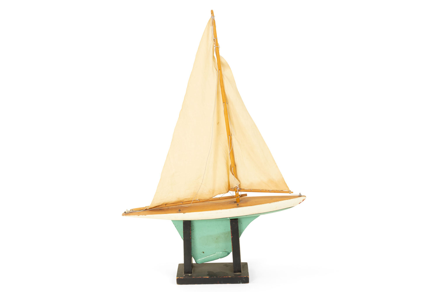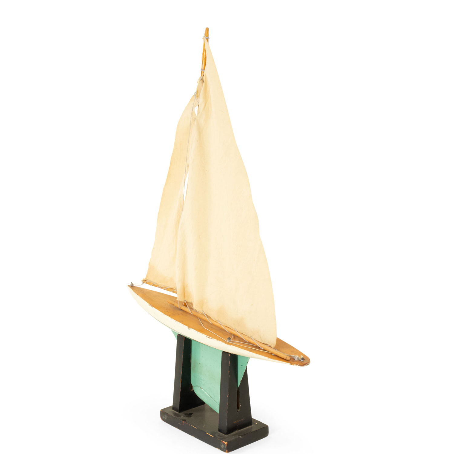 American Country style Mid-Century white painted wood model of a pond sailboat on black stand with a turquoise painted hull