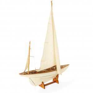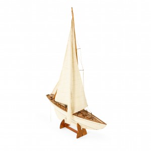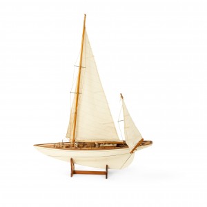 American Country style Mid-Century white painted wood model of a pond sailboat with deck items on a stand