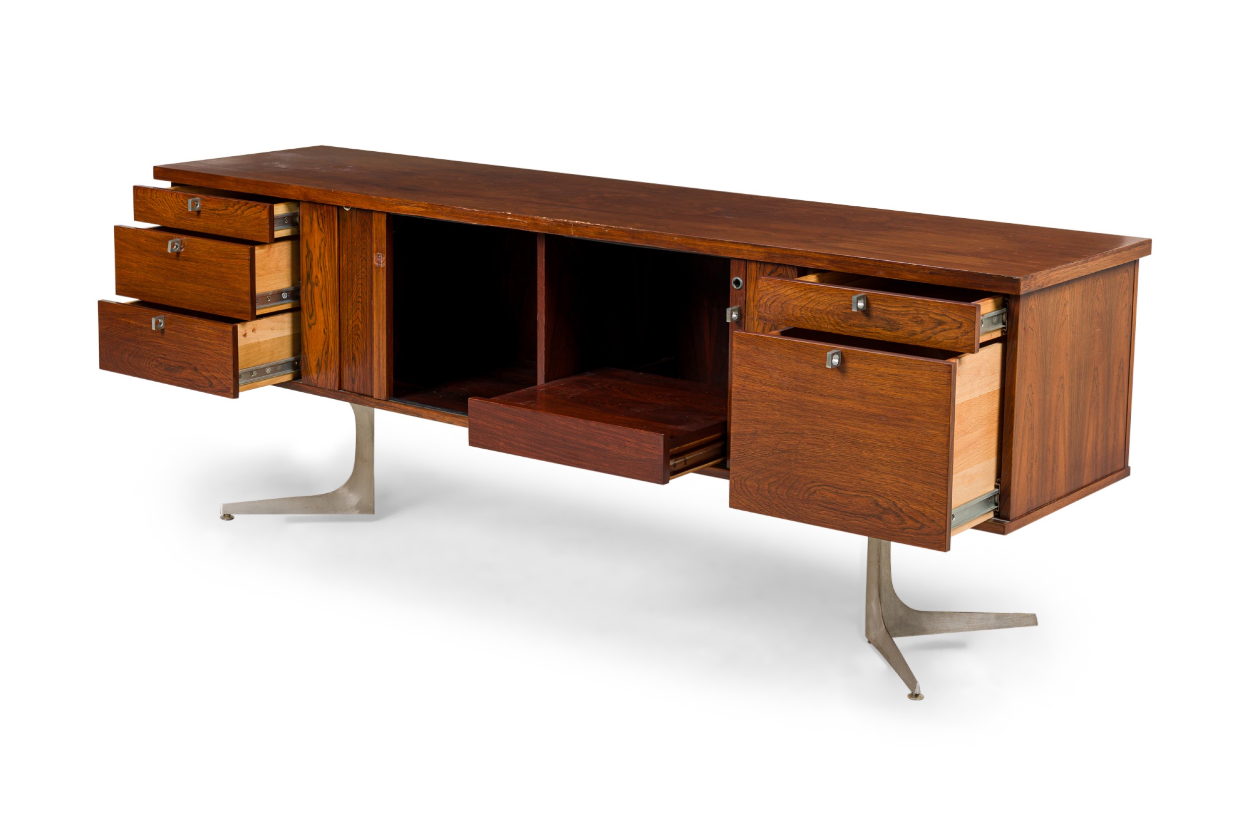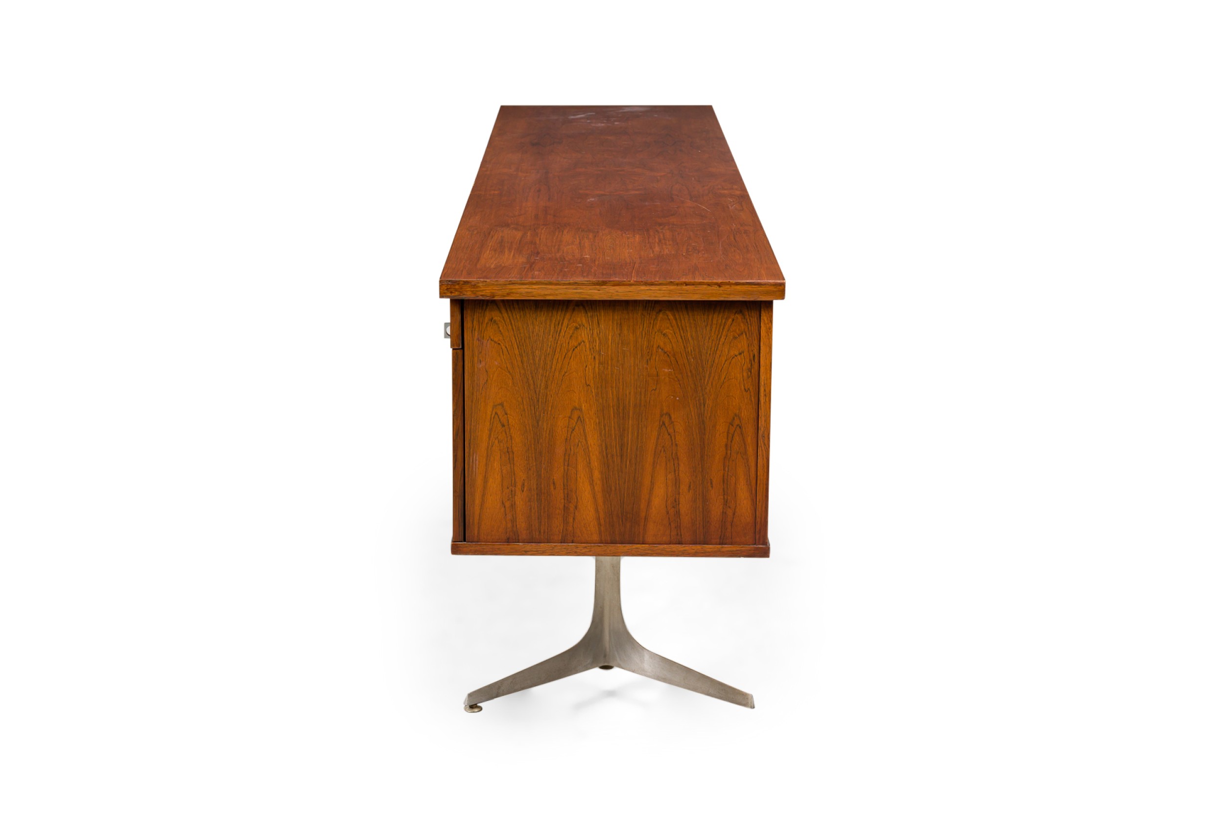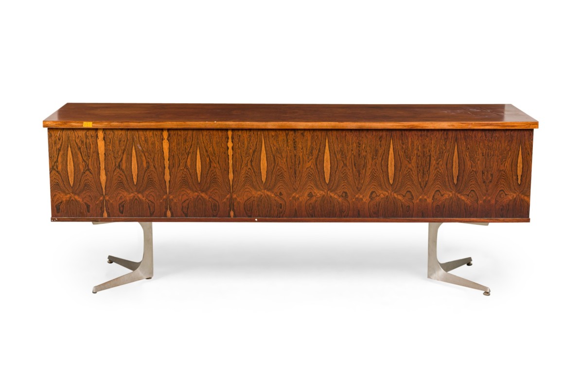 Mid-Century rosewood sideboard having 5 draws centering two door in the middle and resting on a pair of aluminum pedestal bases (HERBERT HIRCHE-Christian Holzäpfel KG Germany, 1967) (matching office executive desk NWL7018)