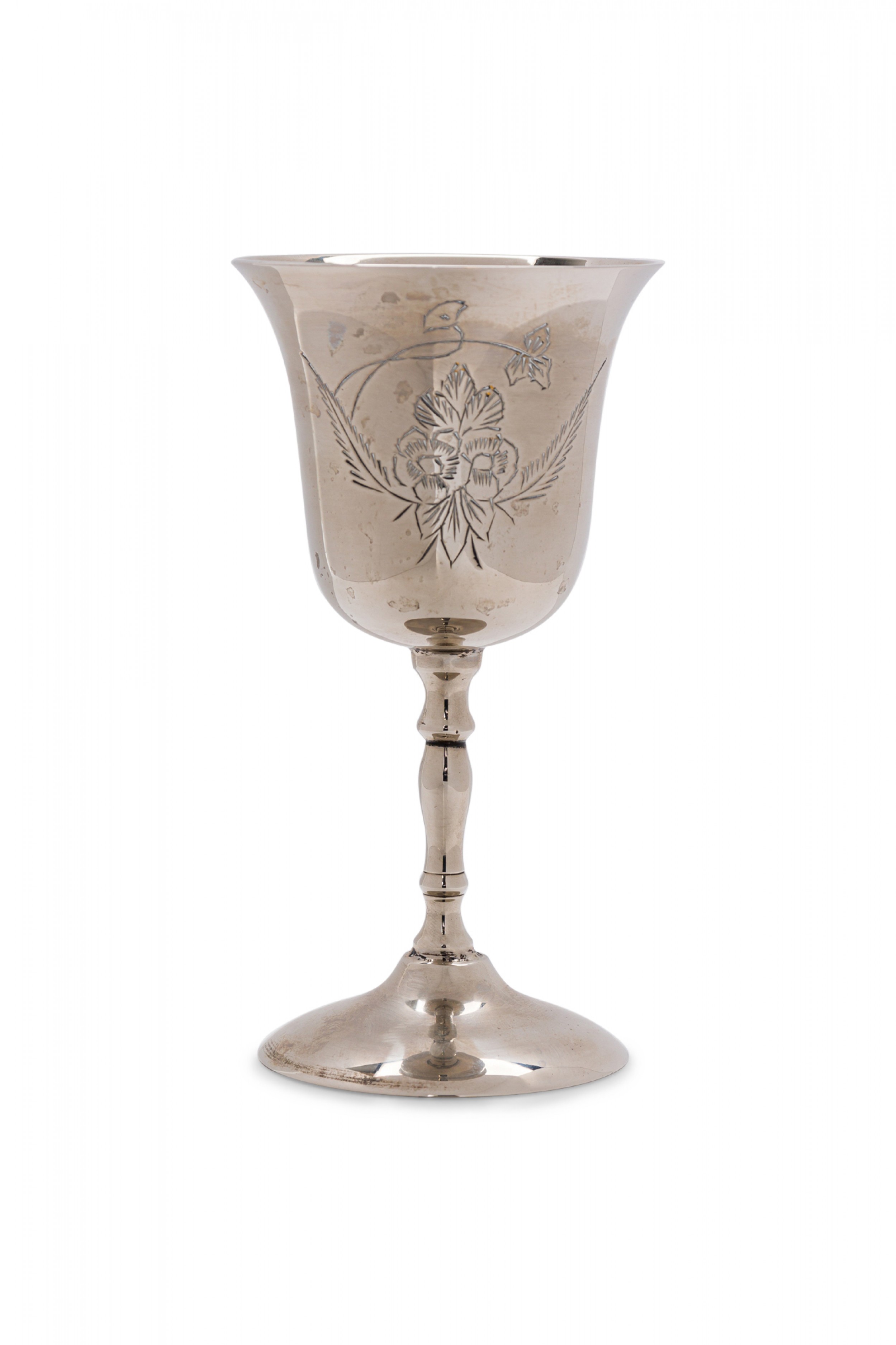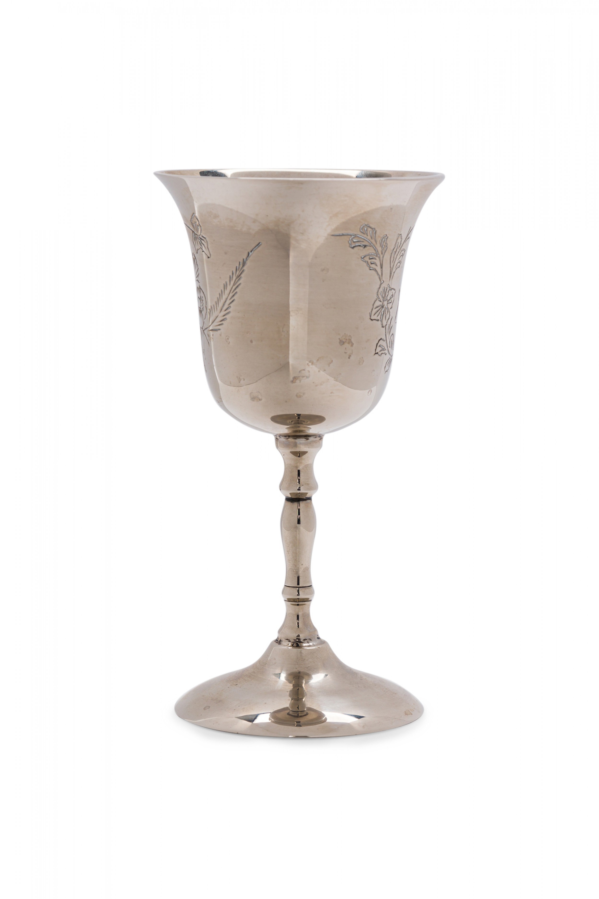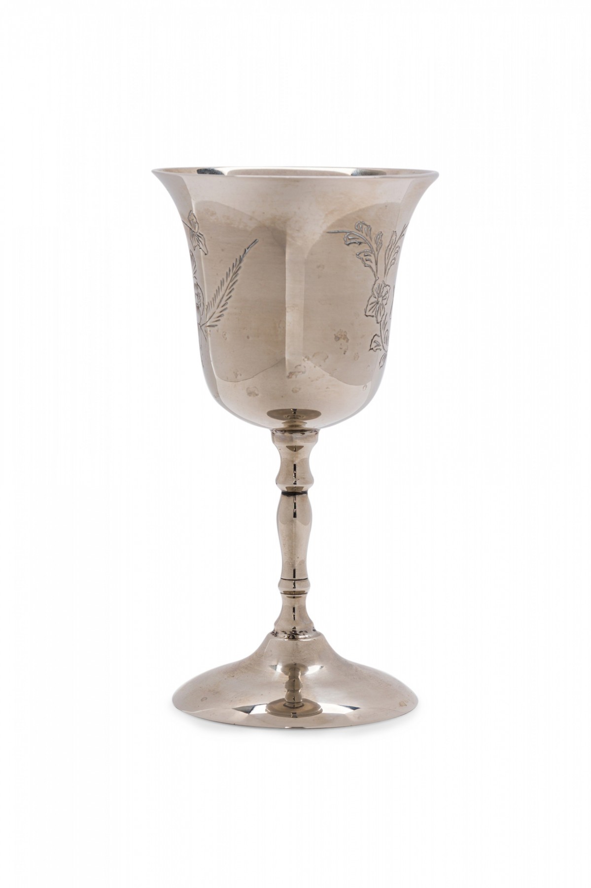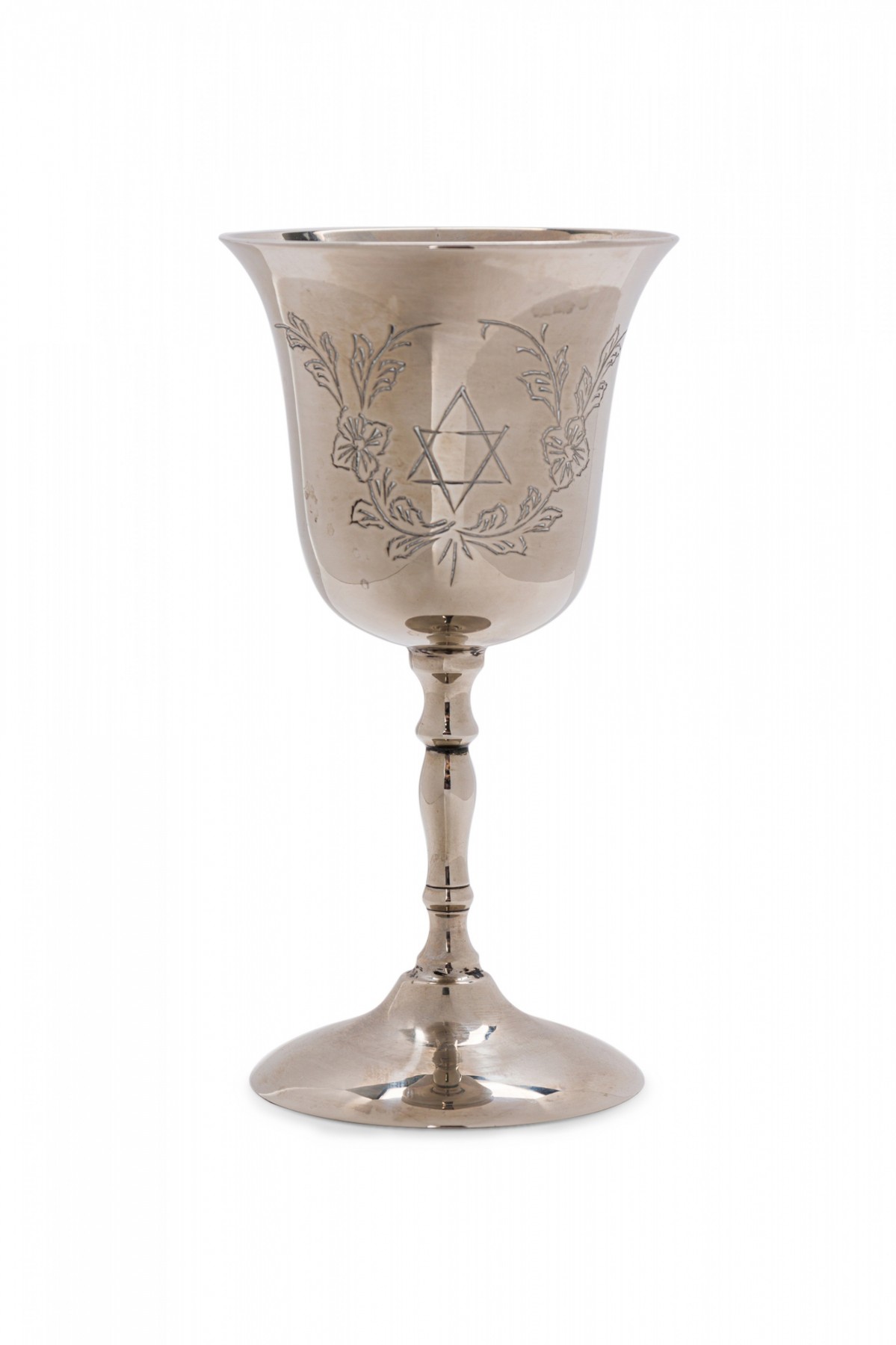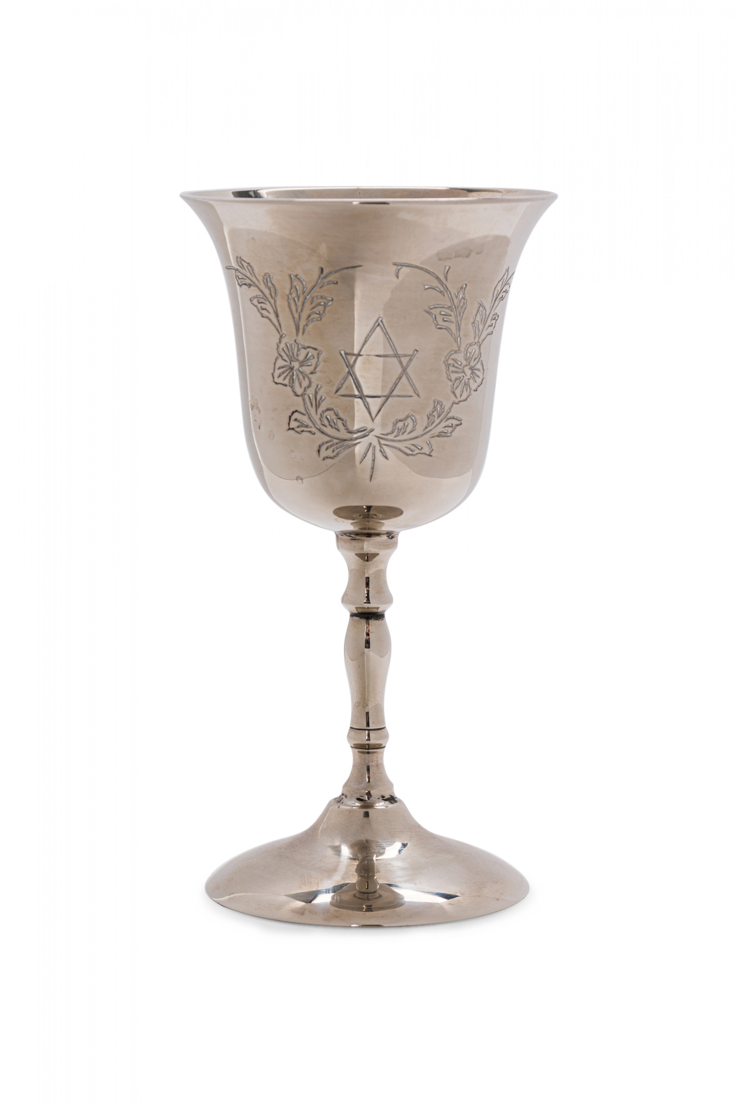 Mid-Century silver Kiddush cup in a goblet form depicting the Star of David and floral arrangements on a shaped stem.