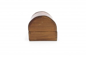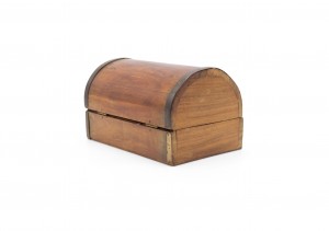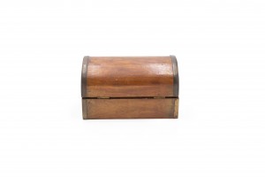 Mid-Century camel top chest shaped light wood box with a brass trim and a latch
