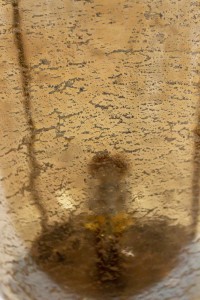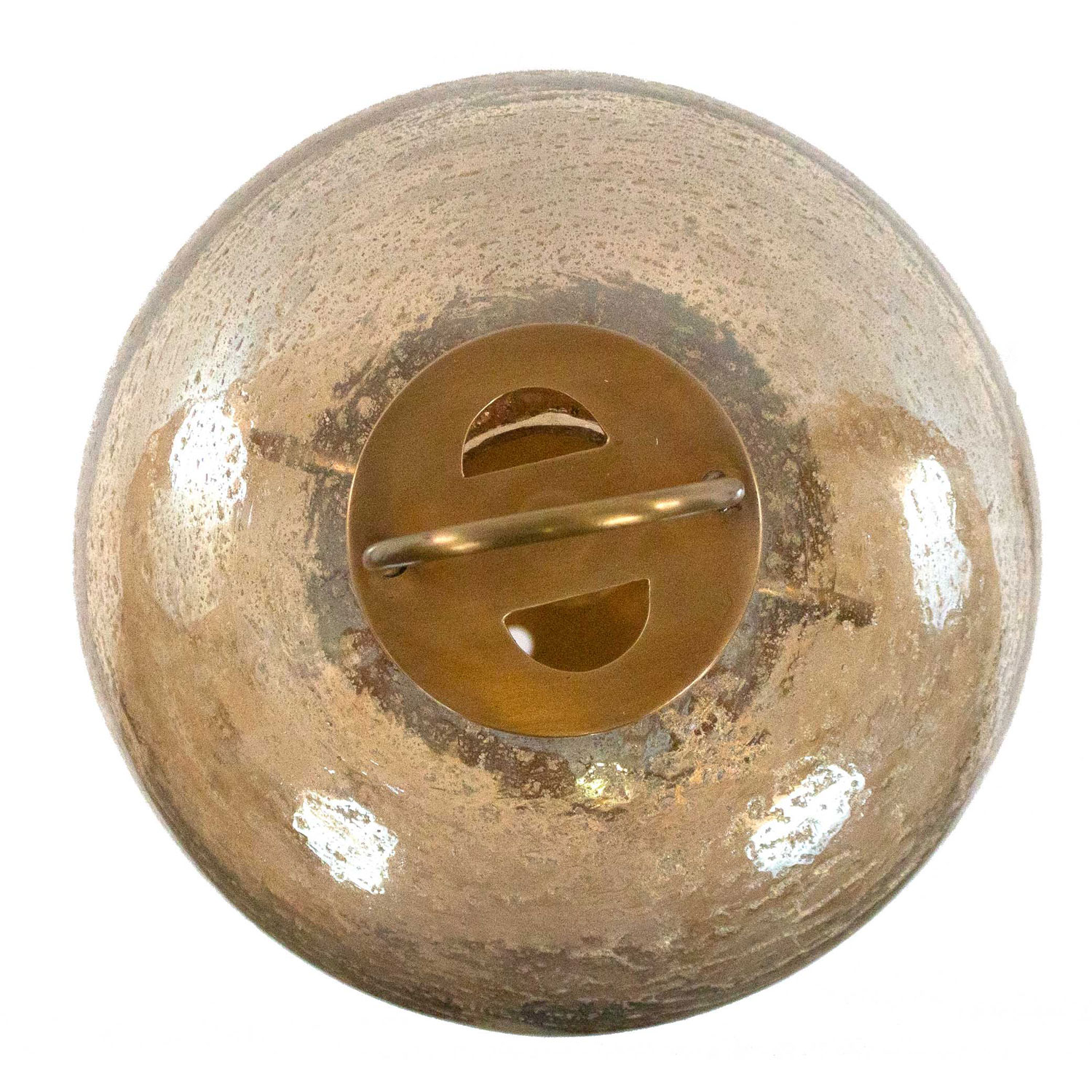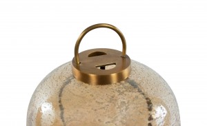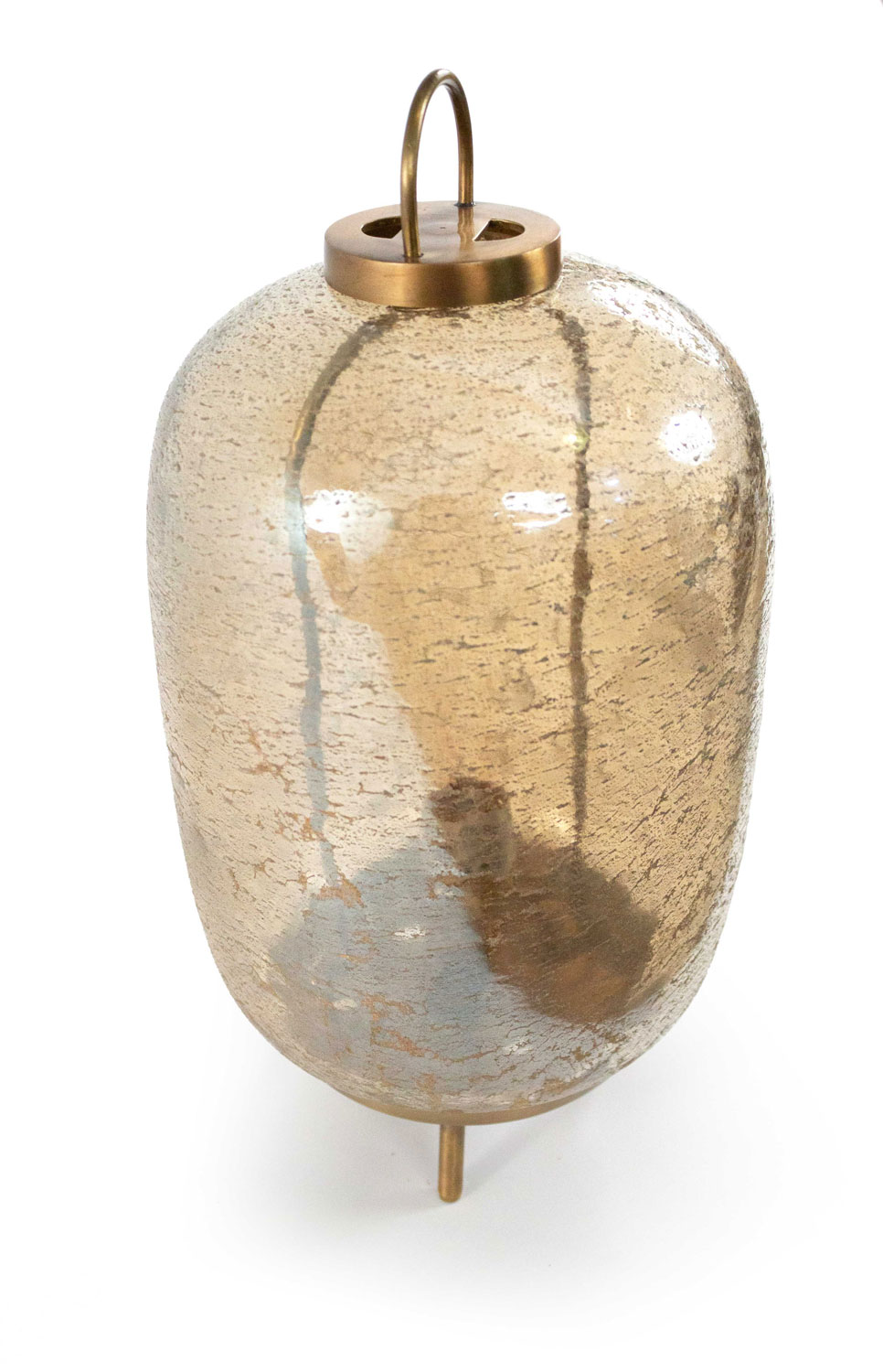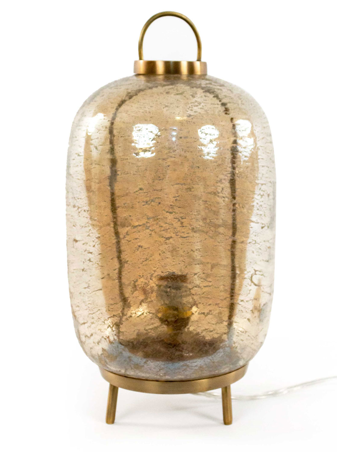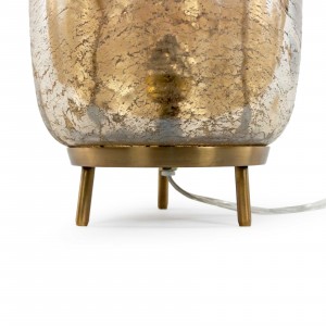 Mid-century style oval glass desk lamp mounted on brass tripod feet with brass hardware. Glass has gold-toned inclusions throughout.