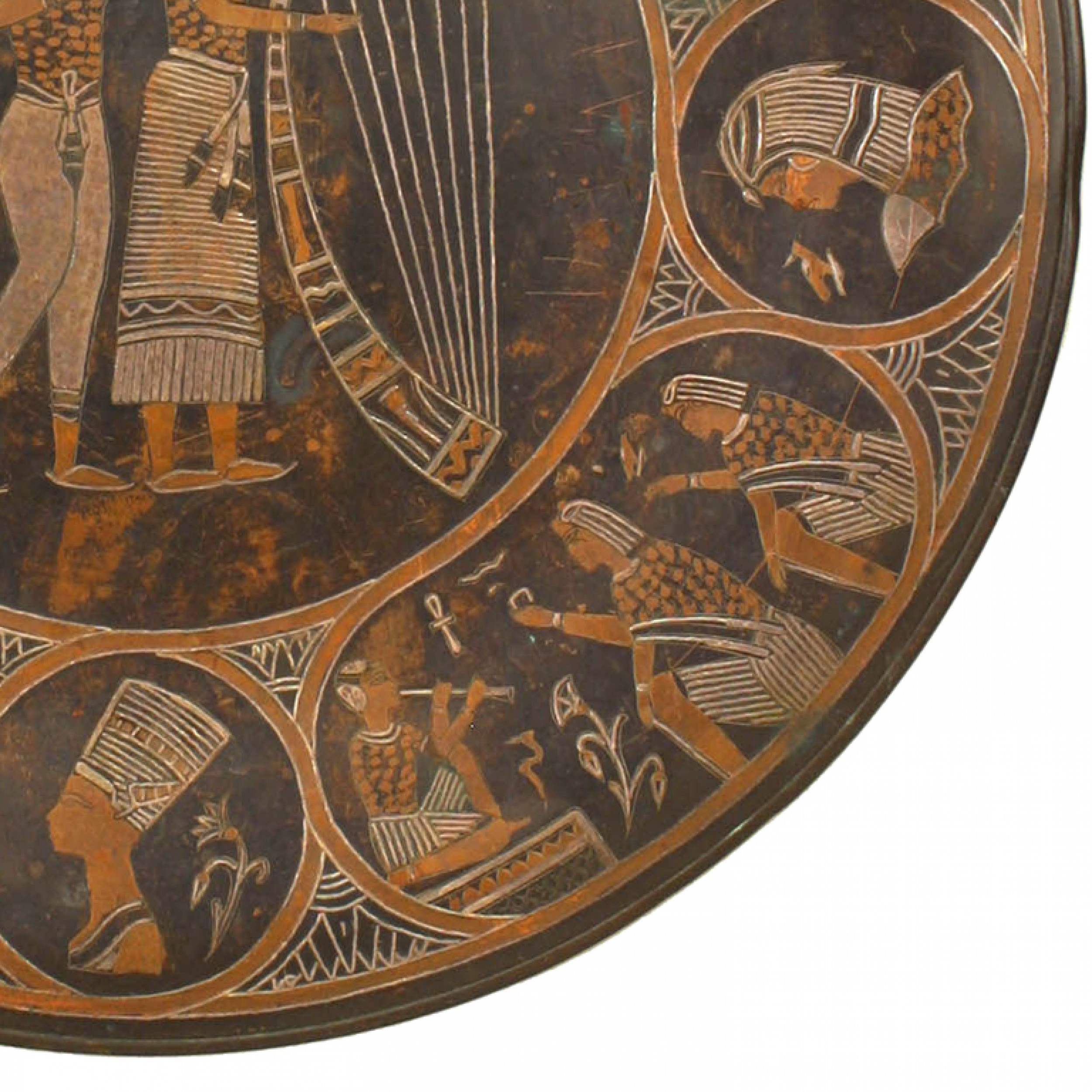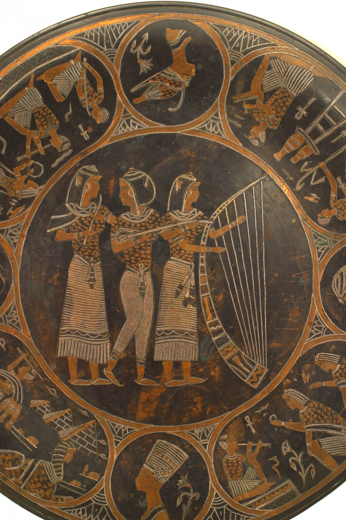 Middle Eastern Egyptian style (19th Century) small copper and silver deposit round charger / wall plaque with 3 figures and a harp centering various Egyptian motifs. Mounted on a stand.