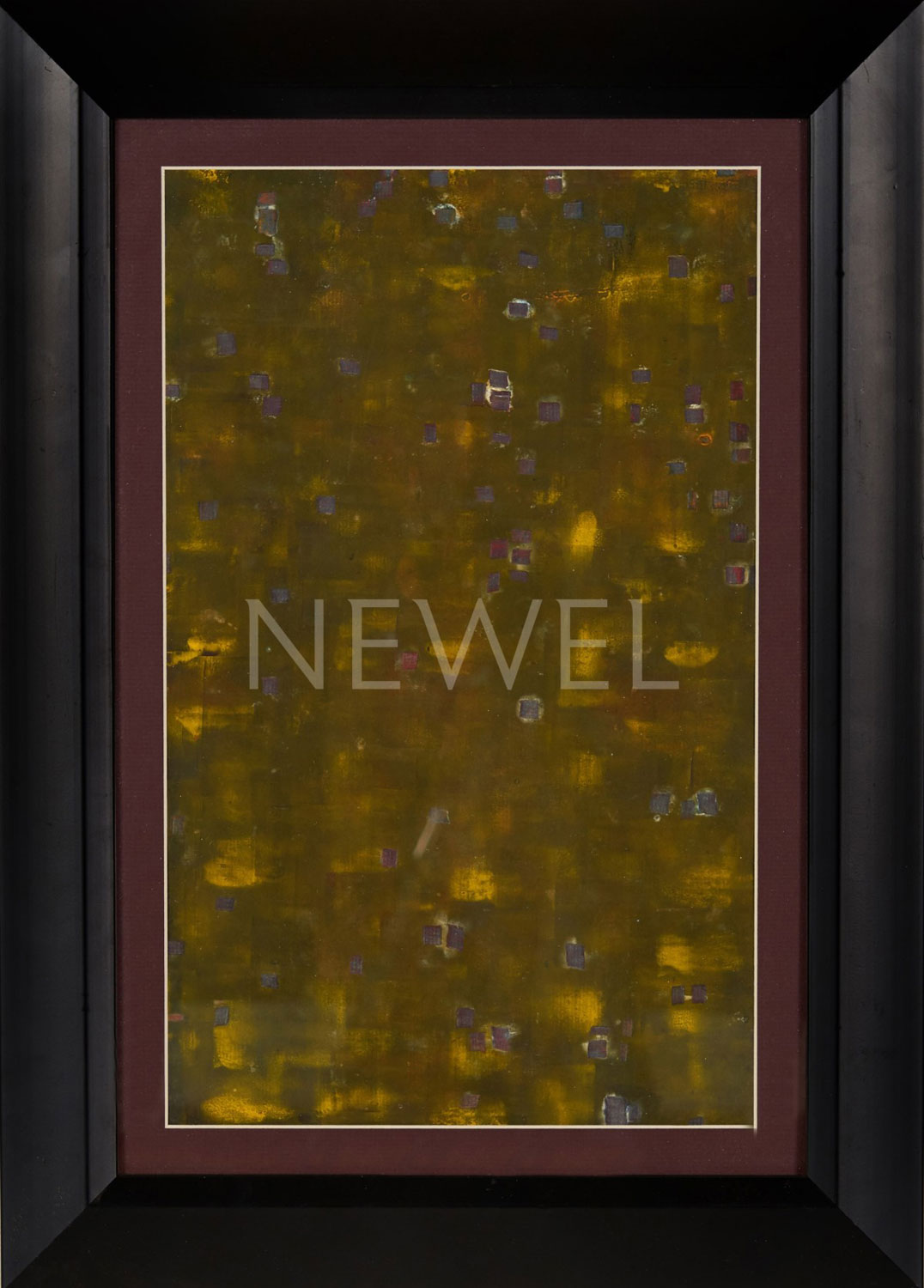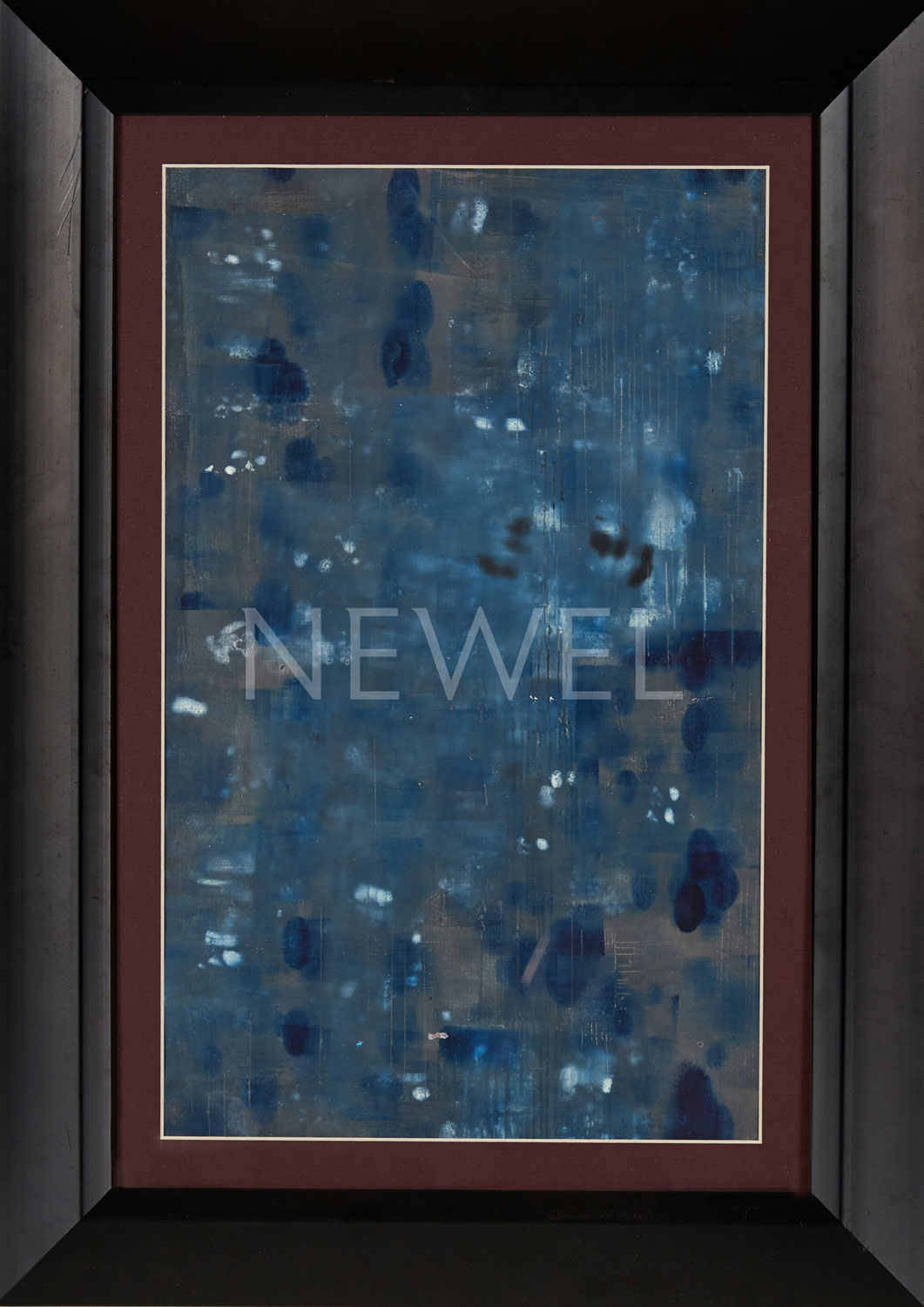 Contemporary abstract artwork of a wash of blue tones and geometric shapes in burgundy matting and a rectangular black frame titled "Midnight" (Companion piece: AAP046)