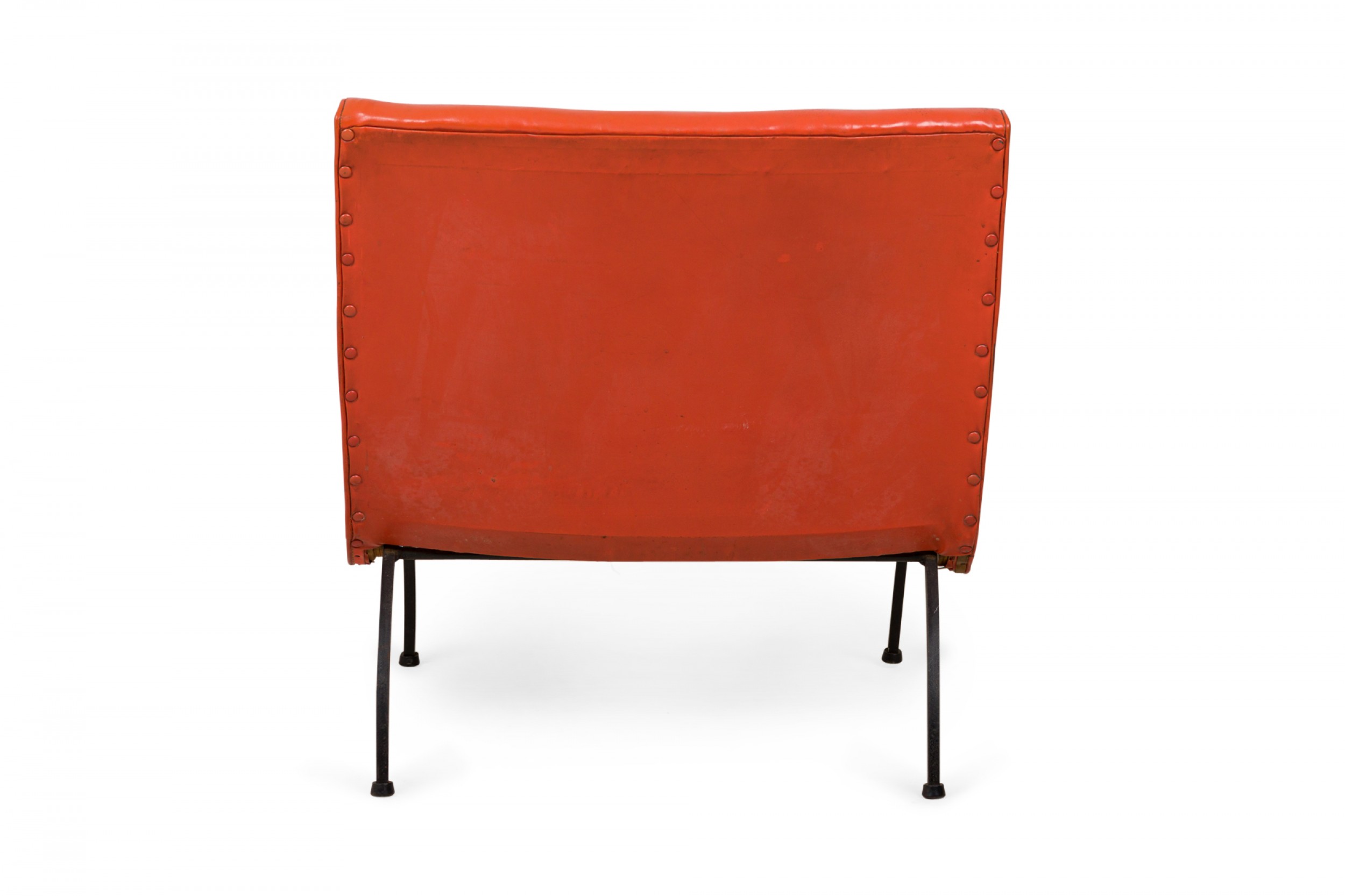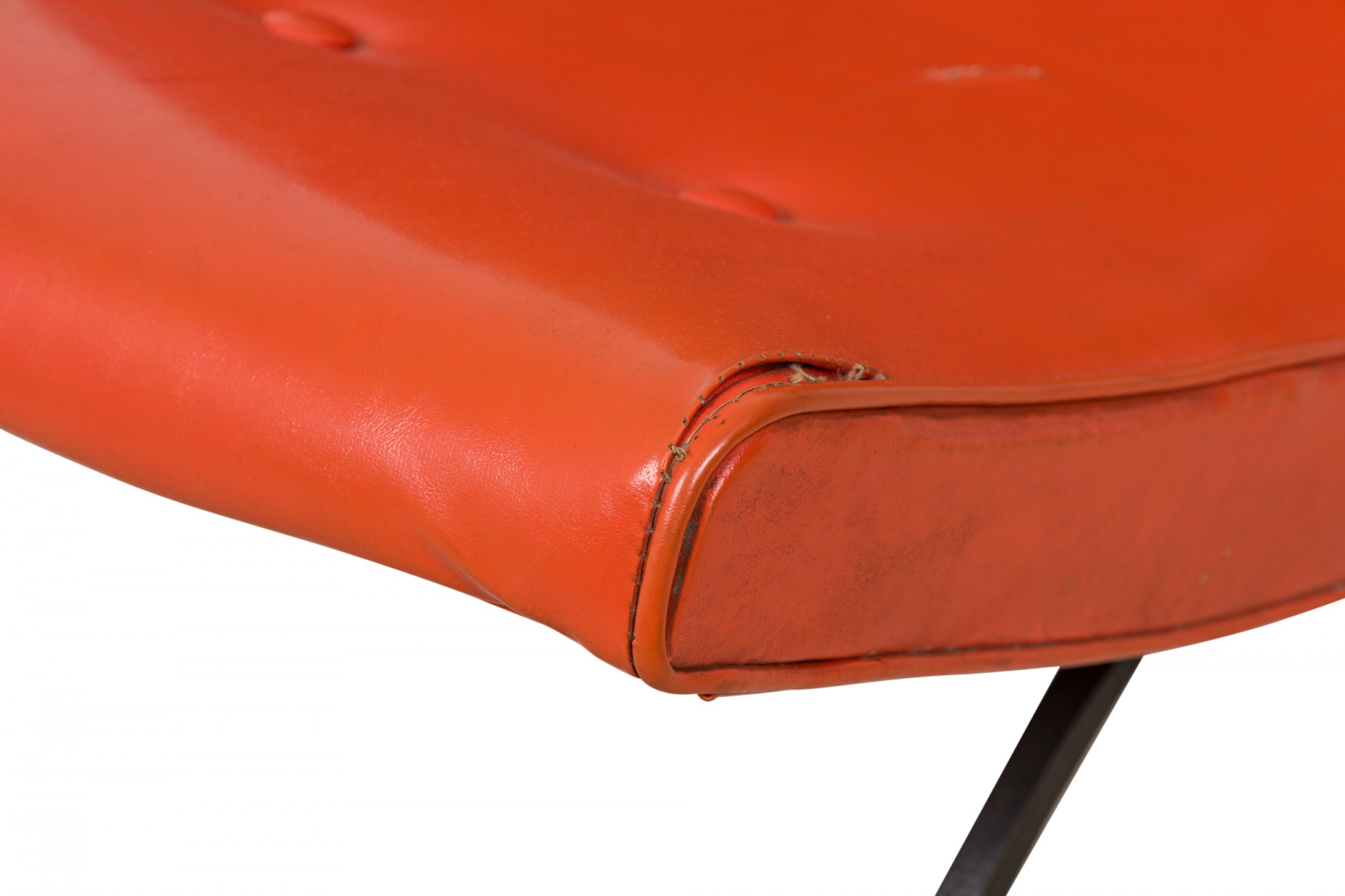 American Mid-Century slipper / side chair with orange vinyl button tufted upholstery, resting on four curved wrought iron legs ending in small circular feet.
