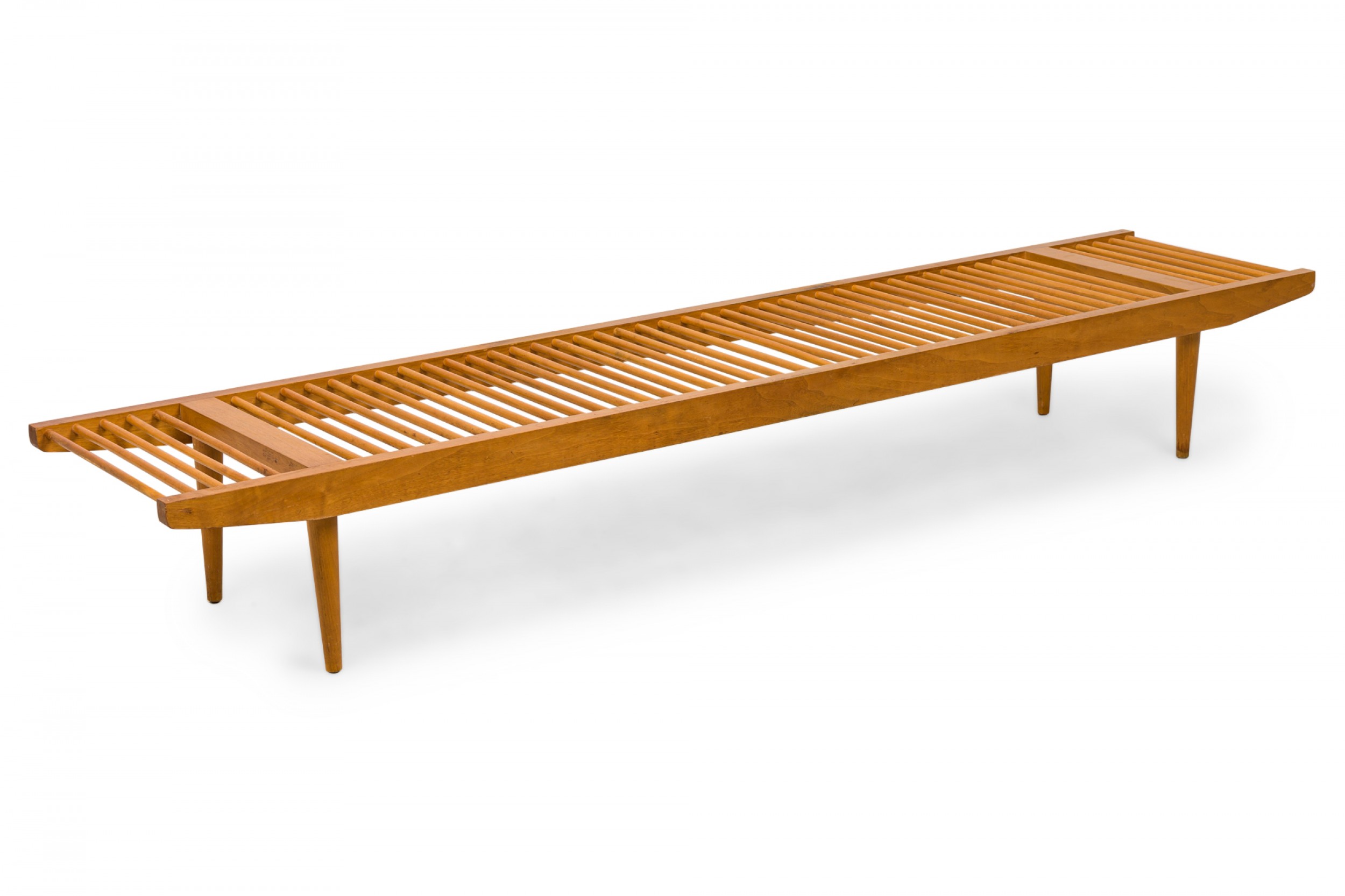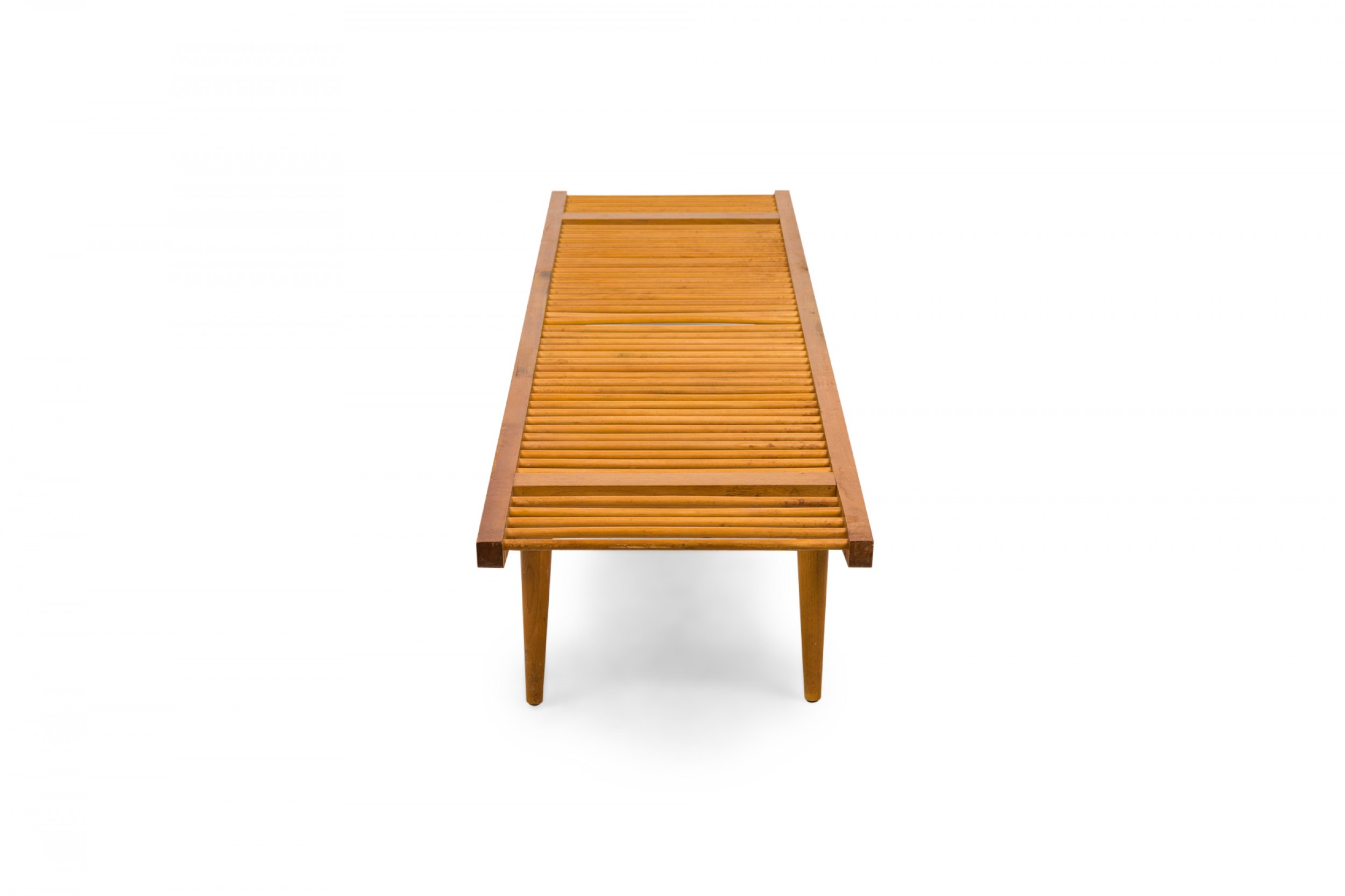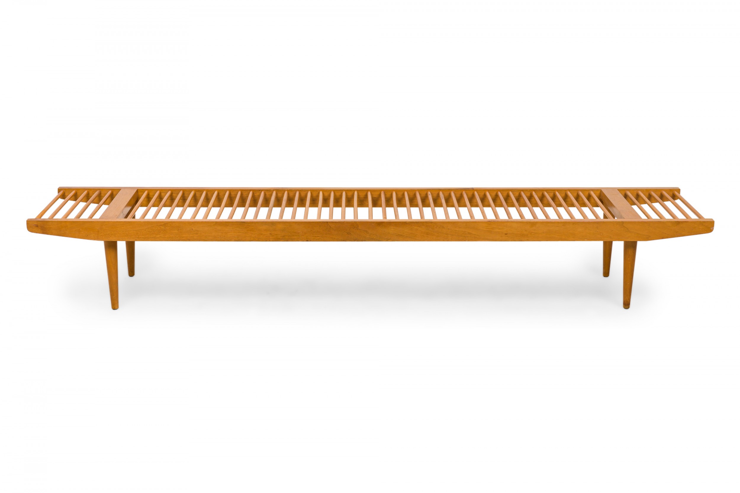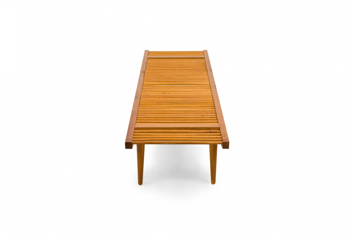 American Mid-Century rectangular 'dowel' bench with a light wood frame and a seat made of dowel slats. (Similar bench: DF0640)