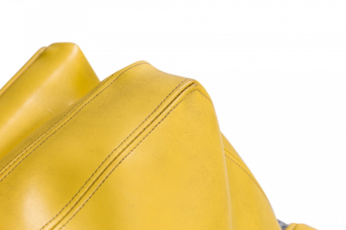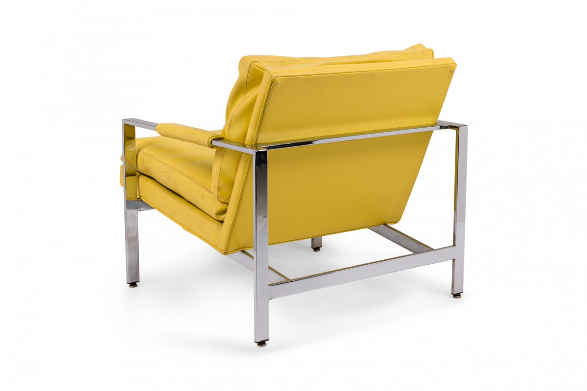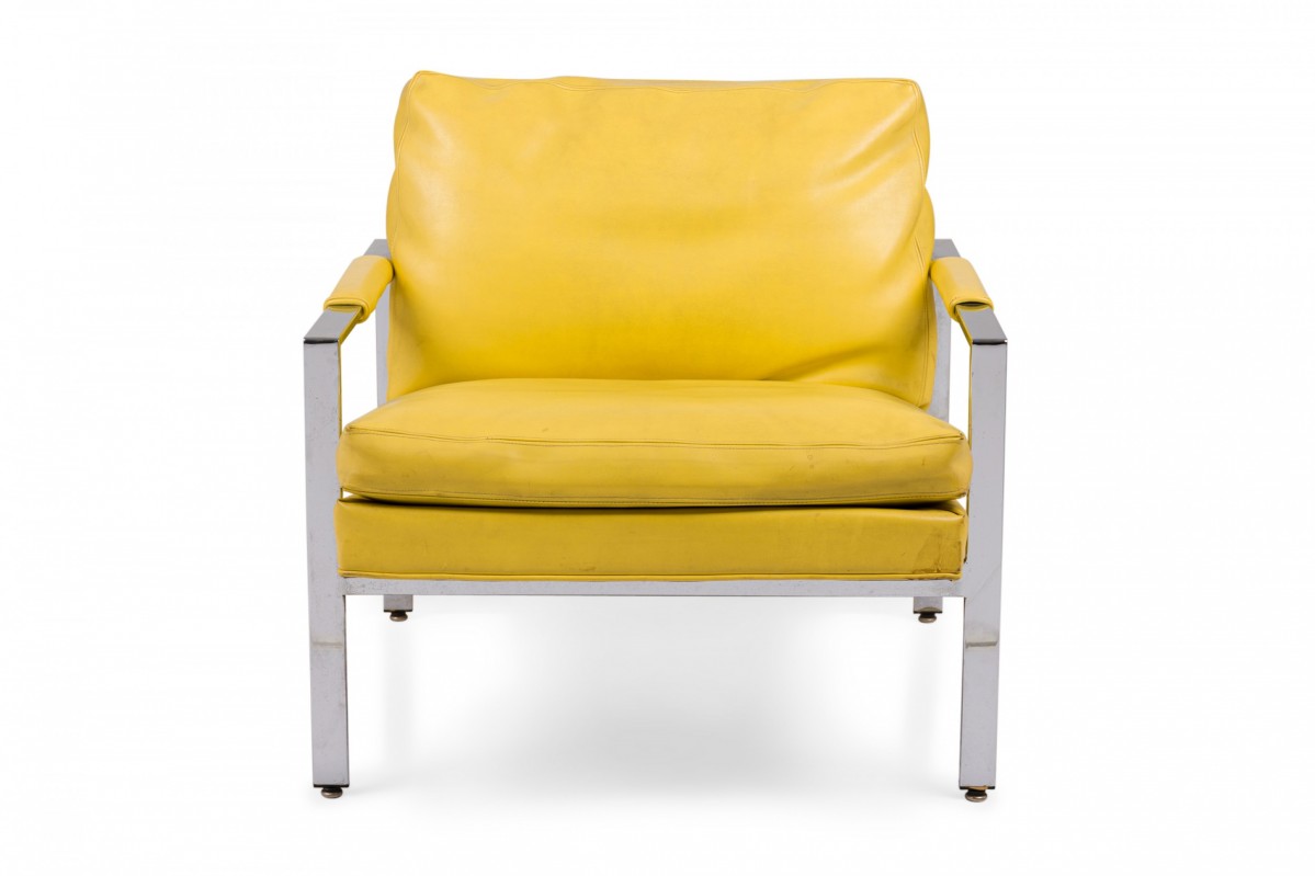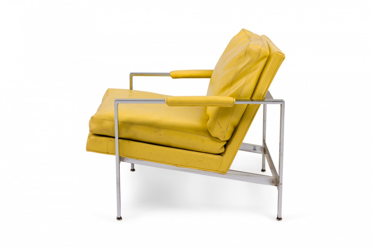 American Mid-Century lounge armchair with a polished chrome flat bar frame, upholstered in bright yellow vinyl. (Similar chairs: DUF0536, DUF0537)