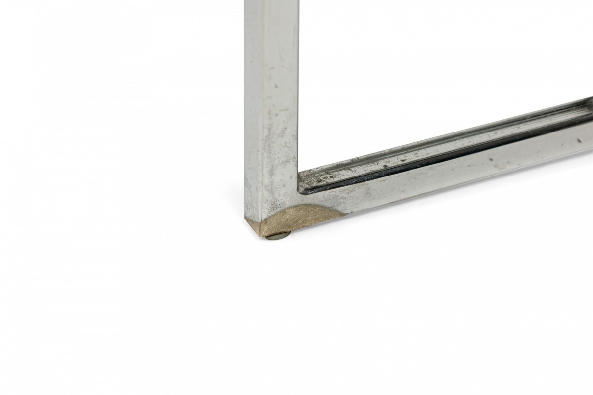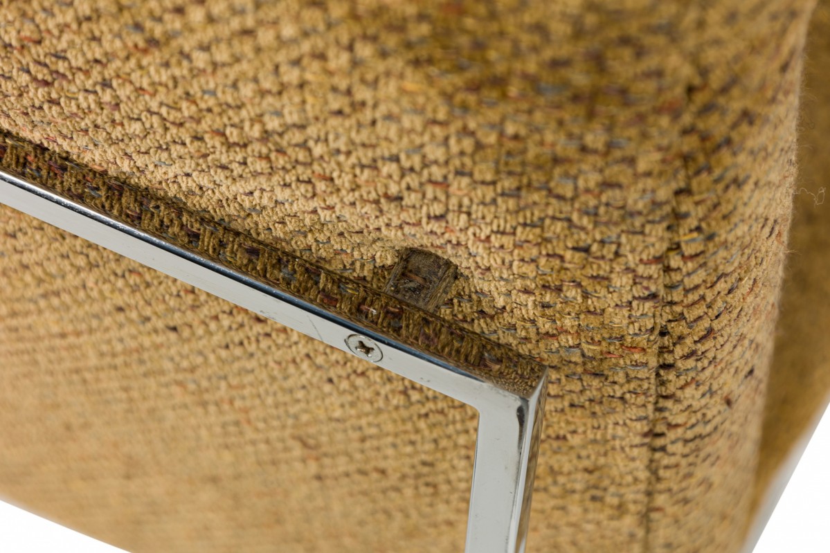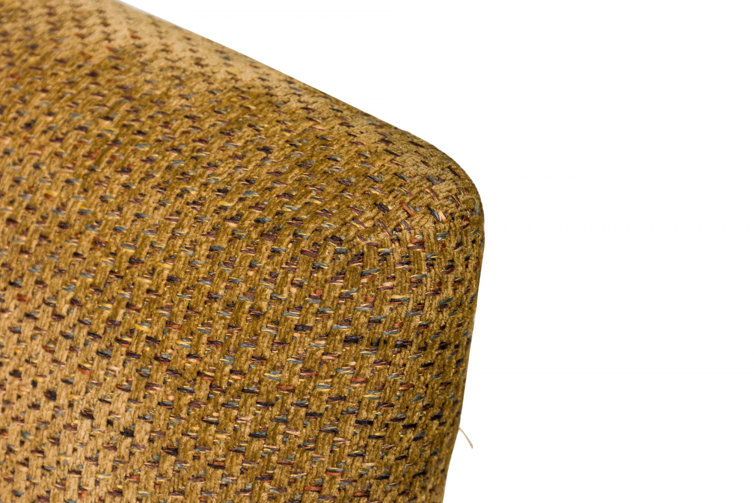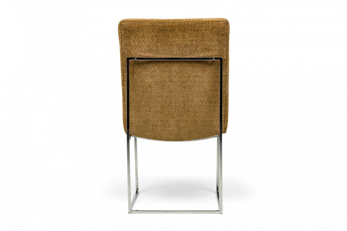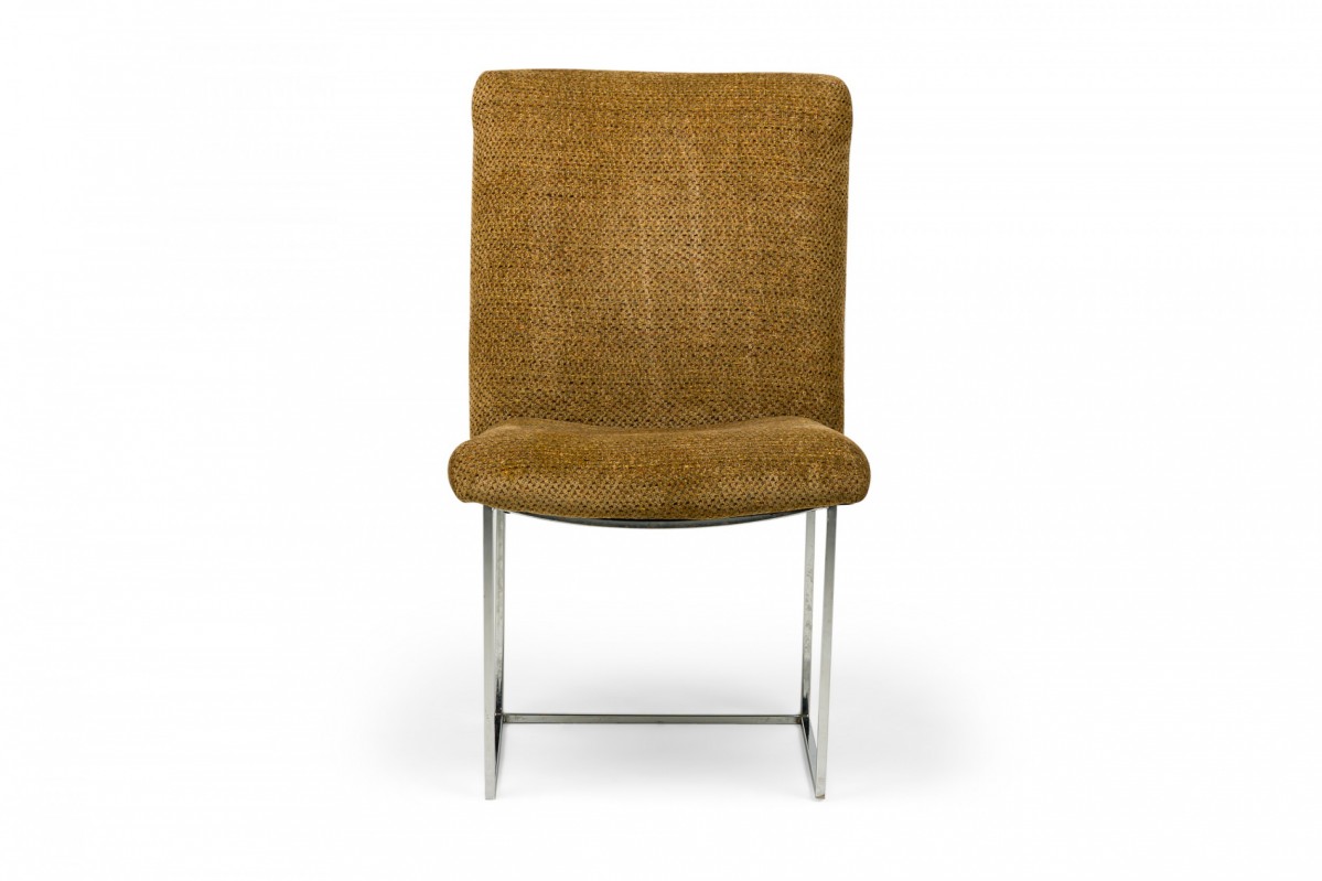 American Mid-Century 'Captain' dining side chair with a silver metal square tube frame and brown woven fabric upholstery with multi-colored accent thread. (Other examples in different upholstery: DUF0798-DUF0801)