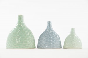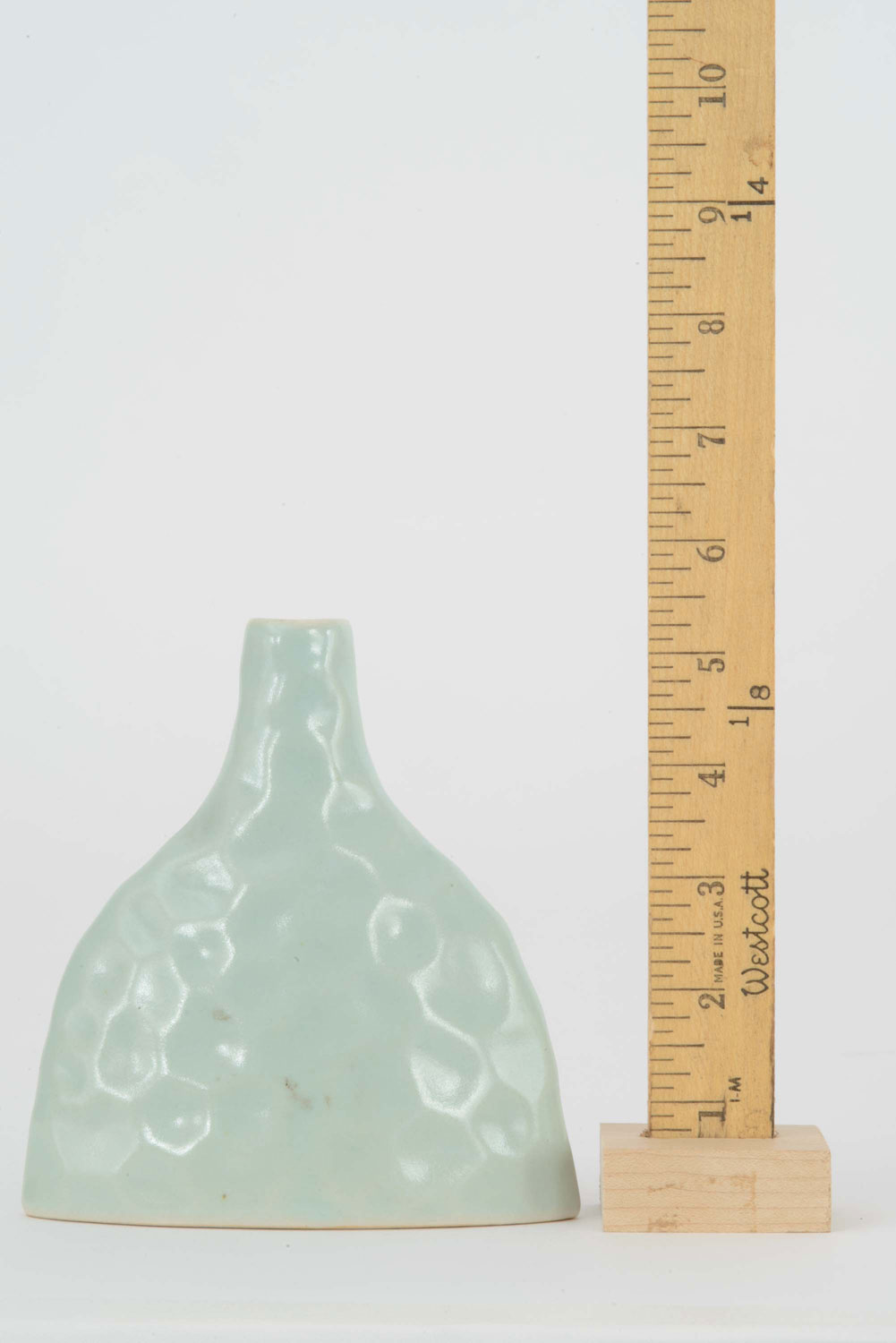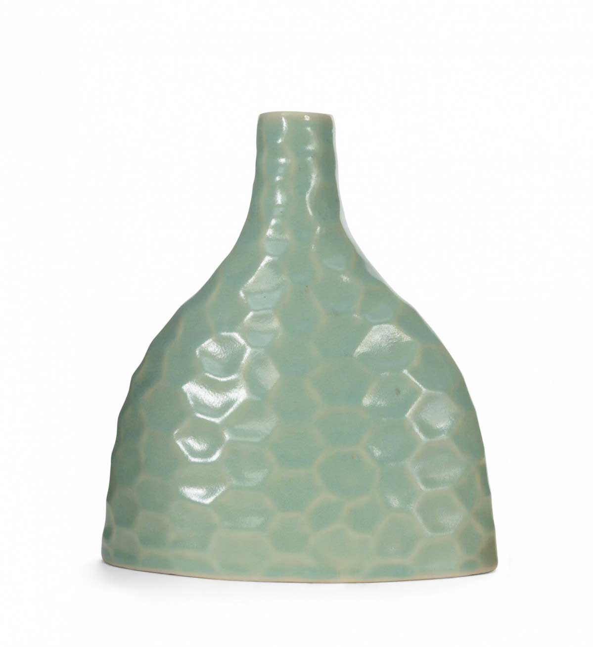 Mint-colored ceramic bud vase with hammered design and crackle glaze