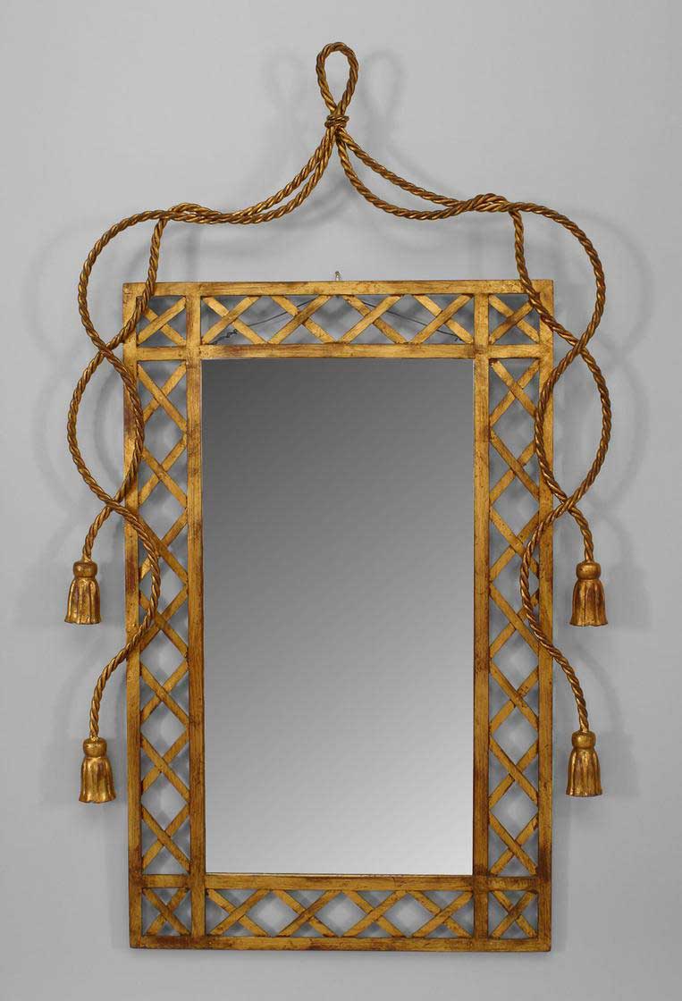 Mid-Century Italian rope and tassel design gilt metal vertical wall mirror with an open desgn frame and beveled glass