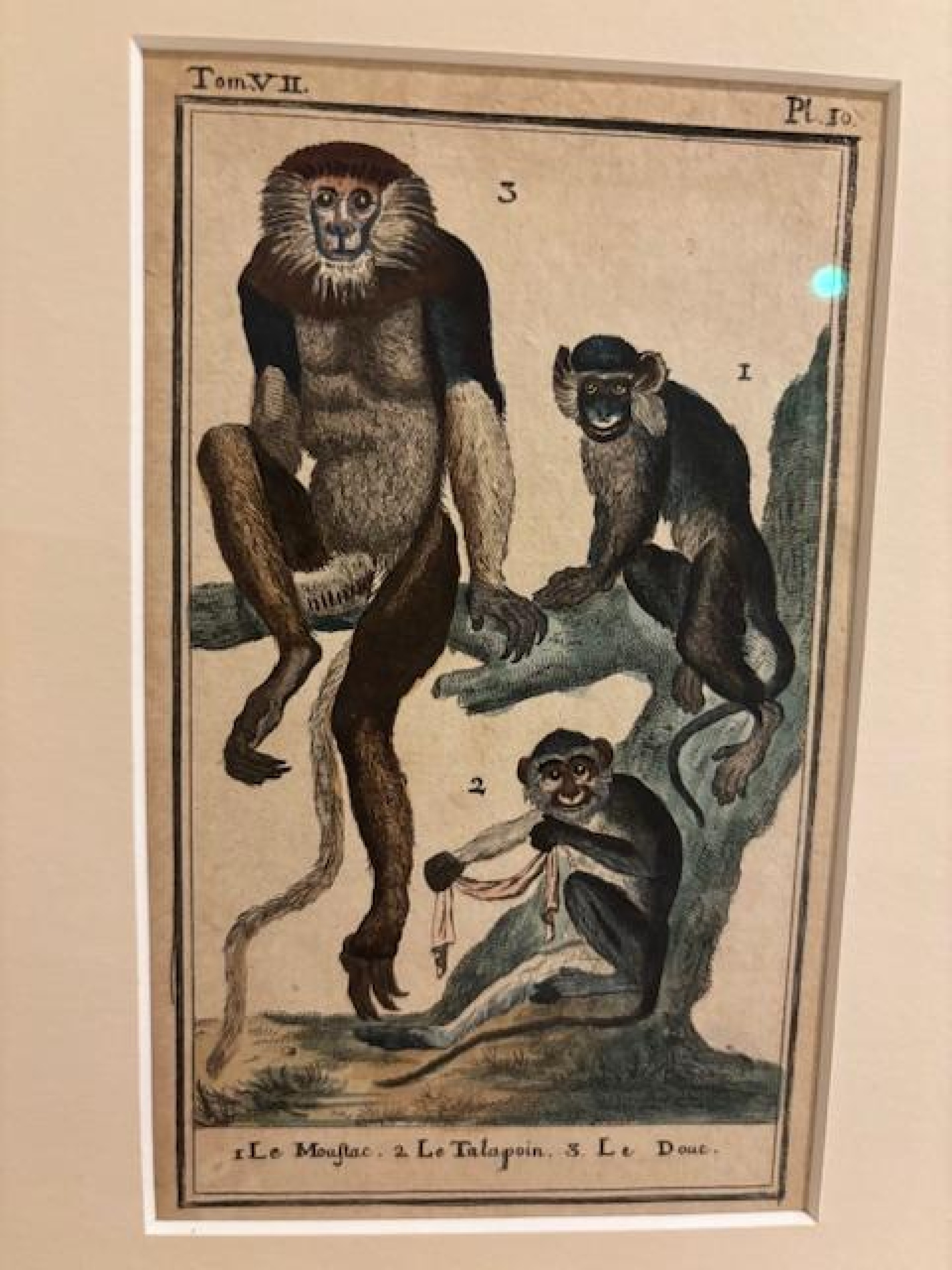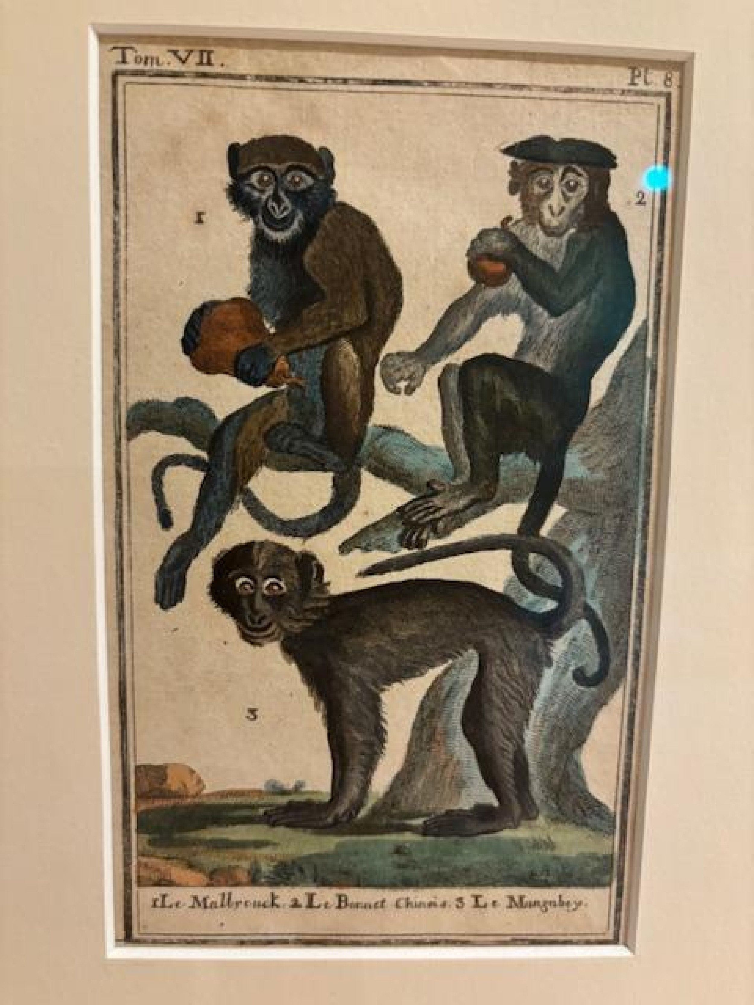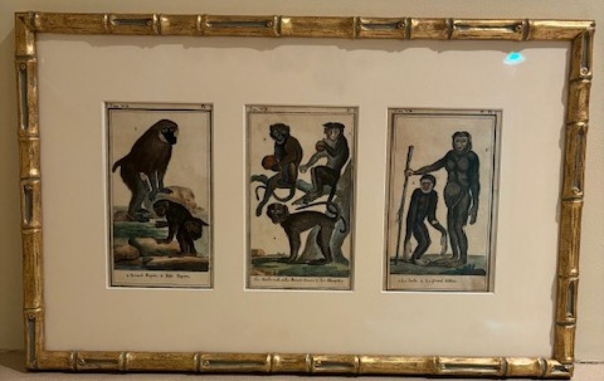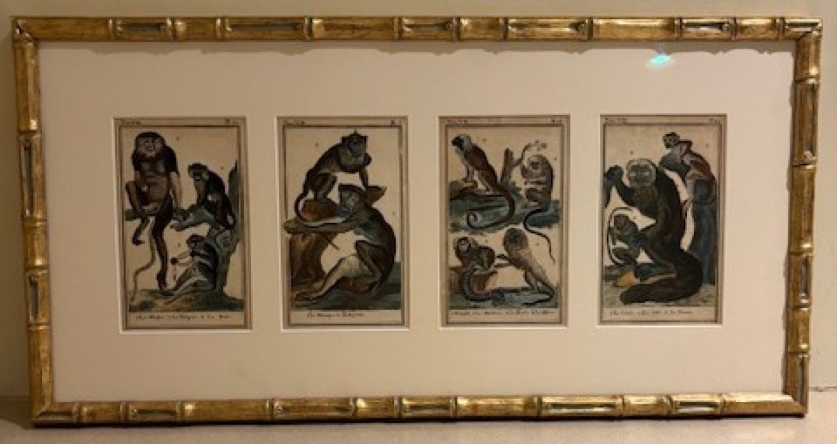 2 French (18th Century) colored prints of a series of monkeys in natural environments having gilt faux bamboo frames (by Georges Louis Leclerc Comte de Buffon-Historie Naturelle) (smaller print with 3 figures: 17"w x 10.5"h) (PRICED EACH)