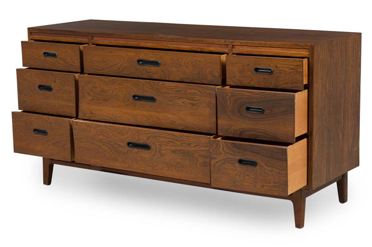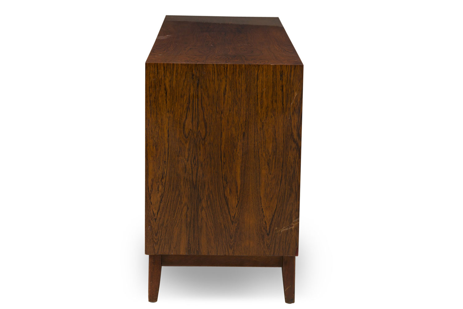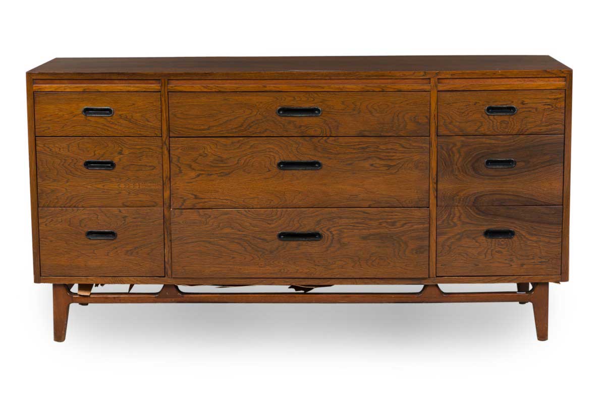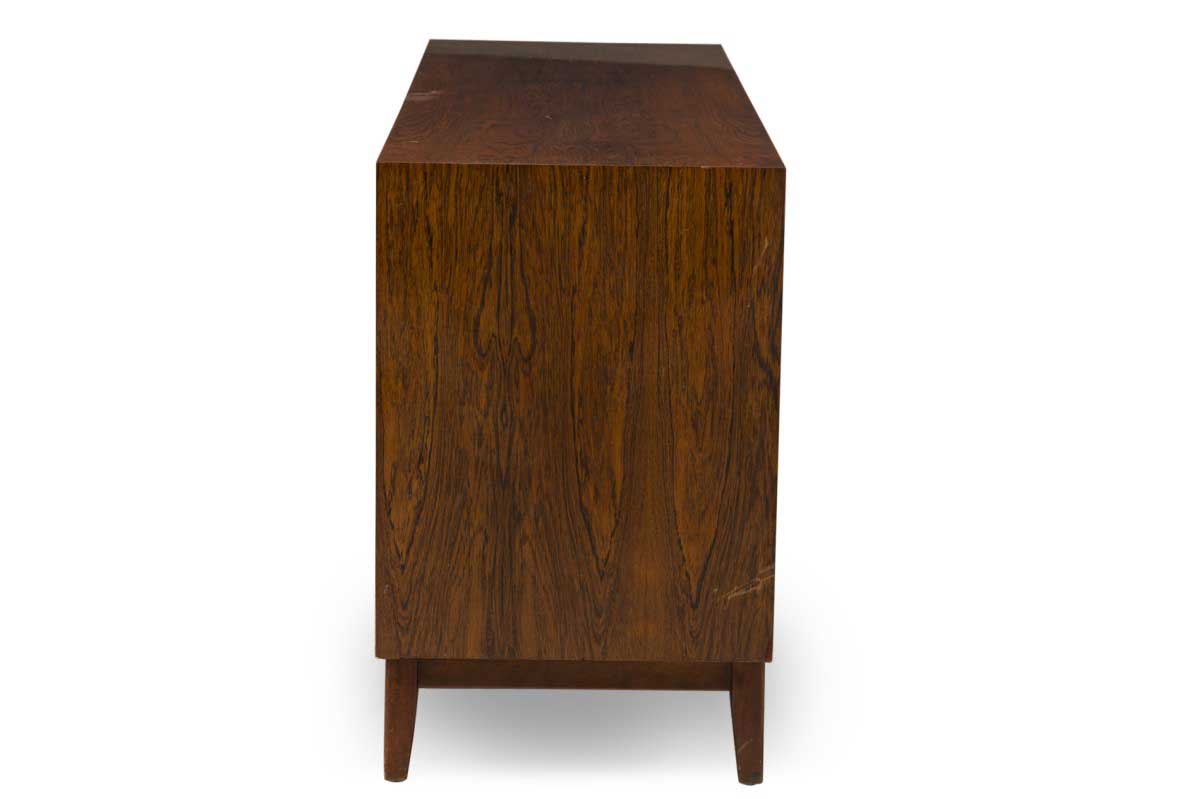 Mid-Century Danish Modern rosewood credenza / chest with three central drawers flanked on either side by three narrower drawers, all with cut out metal-lined narrow oval drawer pulls, resting on a stretcher base with tapered cylindrical legs.