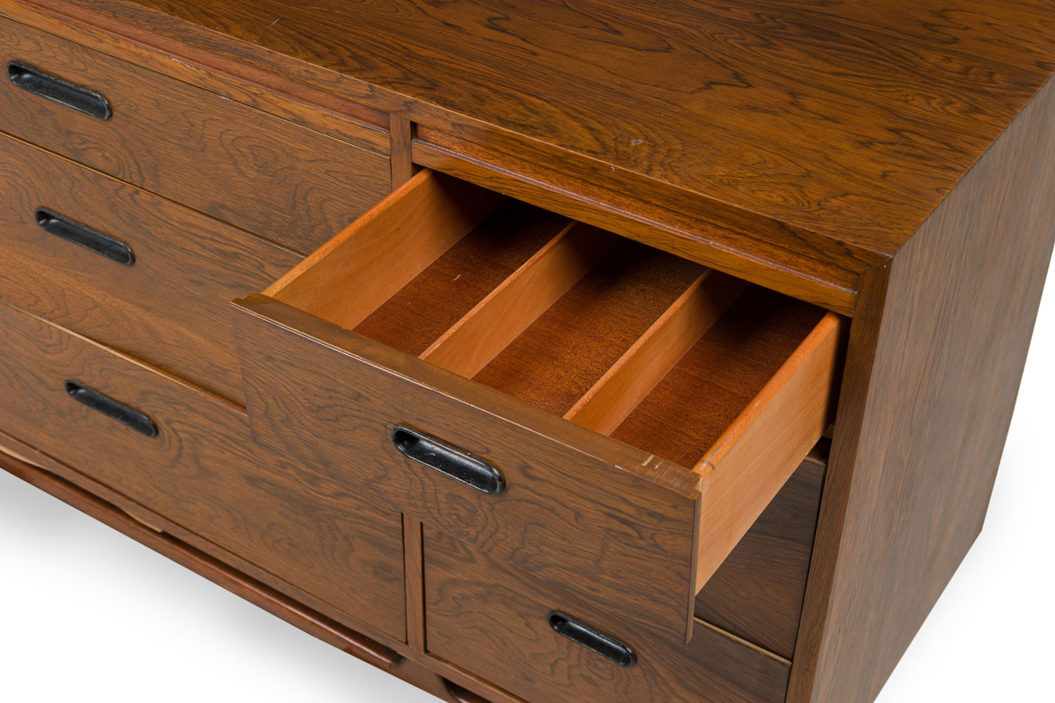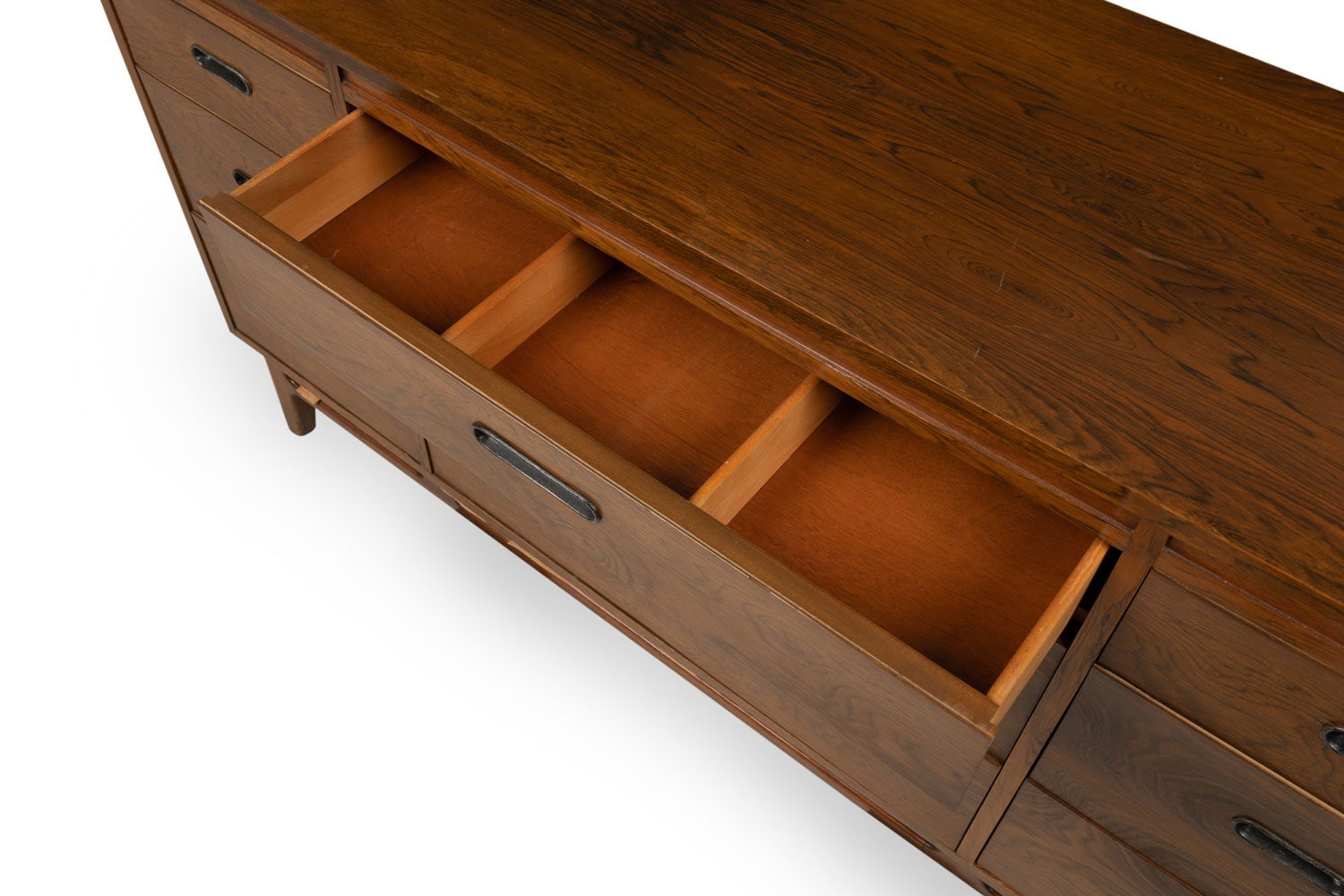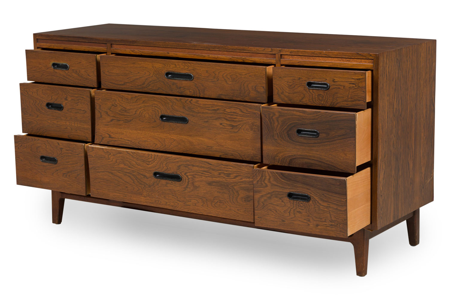 Mid-Century Danish Modern rosewood credenza / chest with three central drawers flanked on either side by three narrower drawers, all with cut out metal-lined narrow oval drawer pulls, resting on a stretcher base with tapered cylindrical legs.