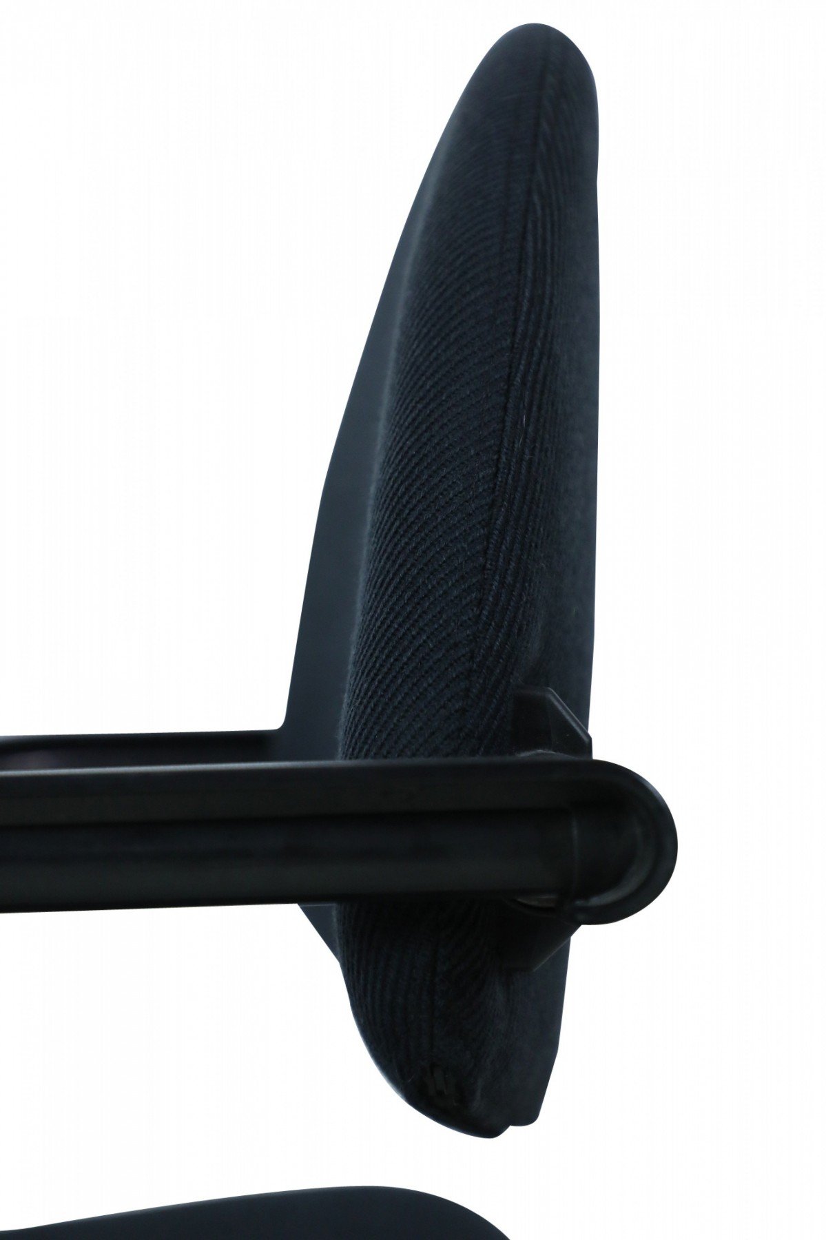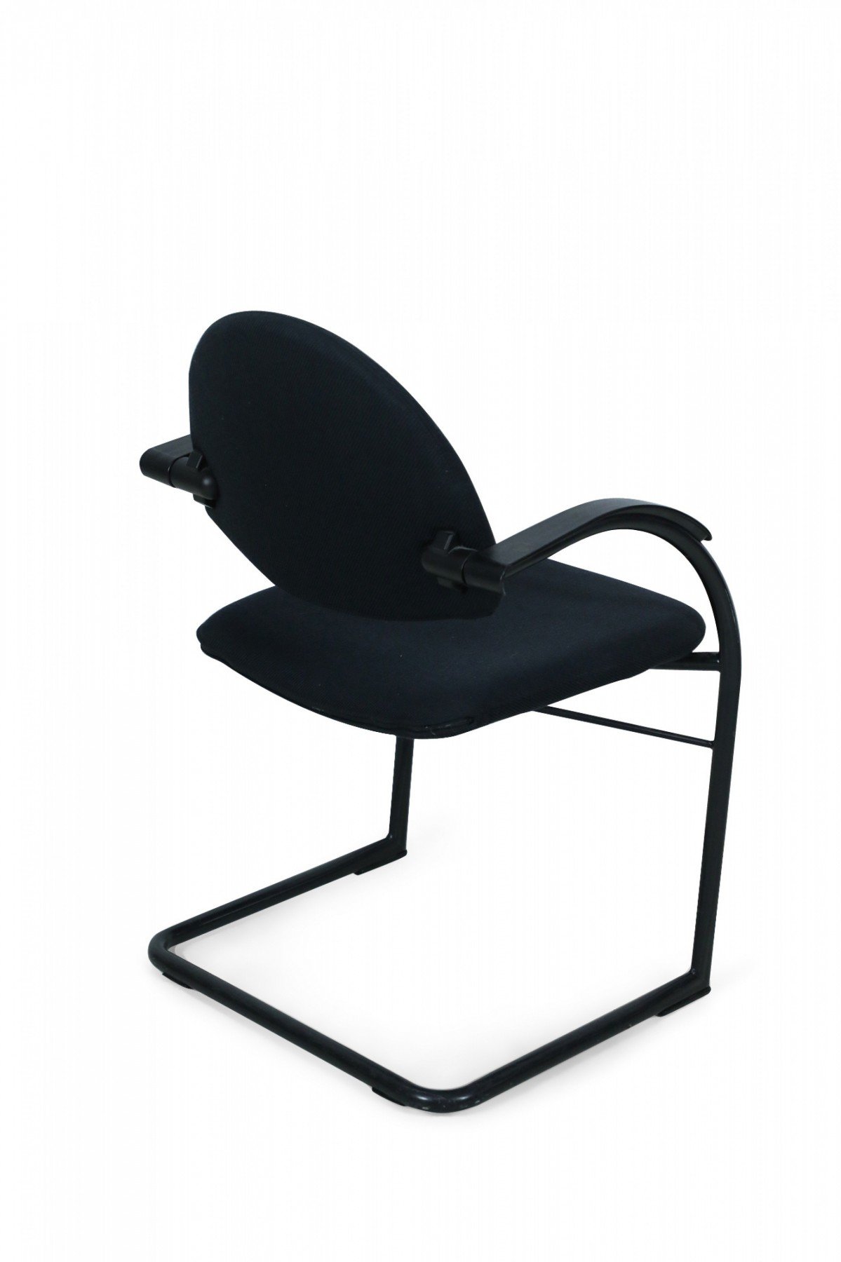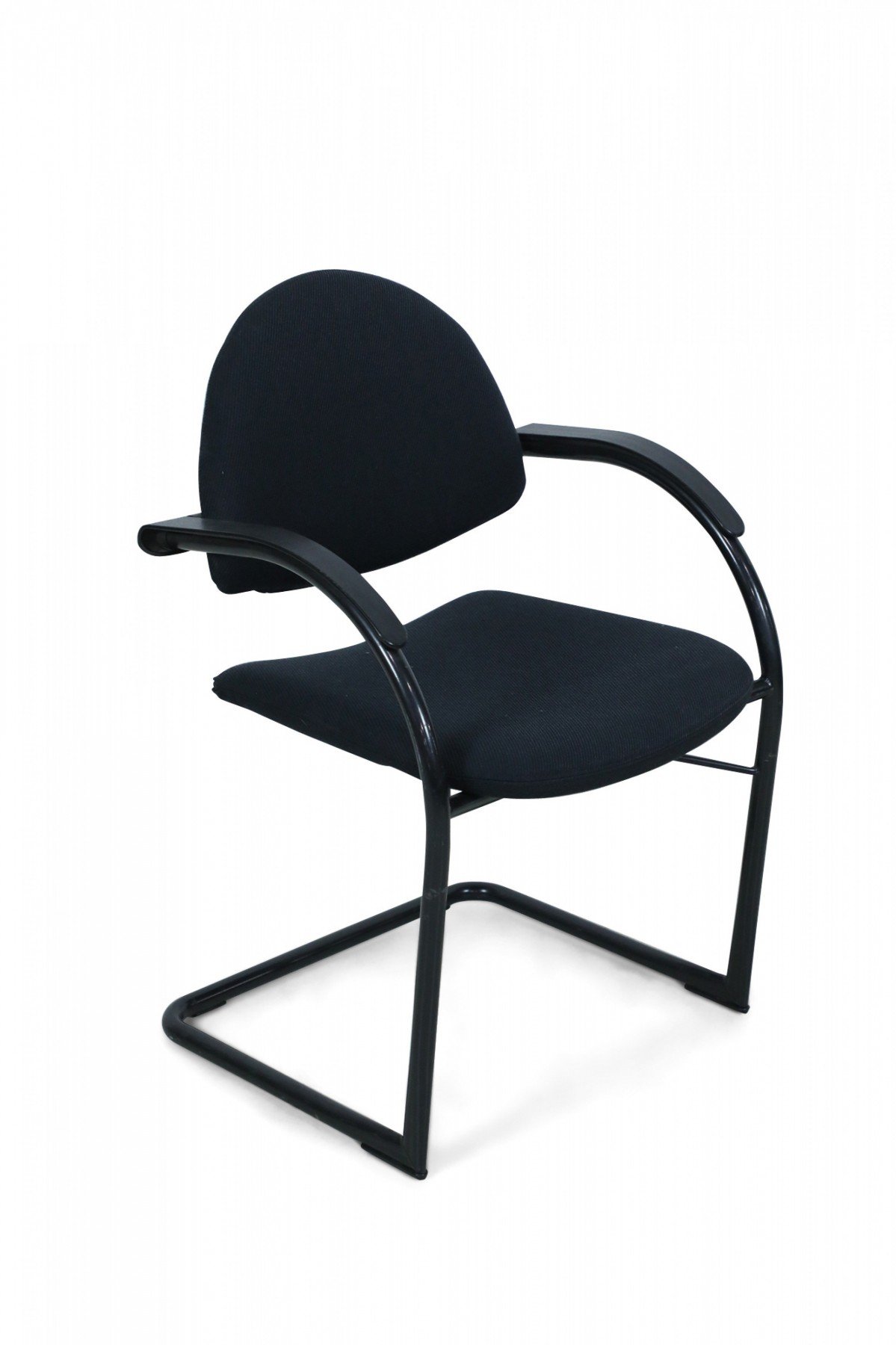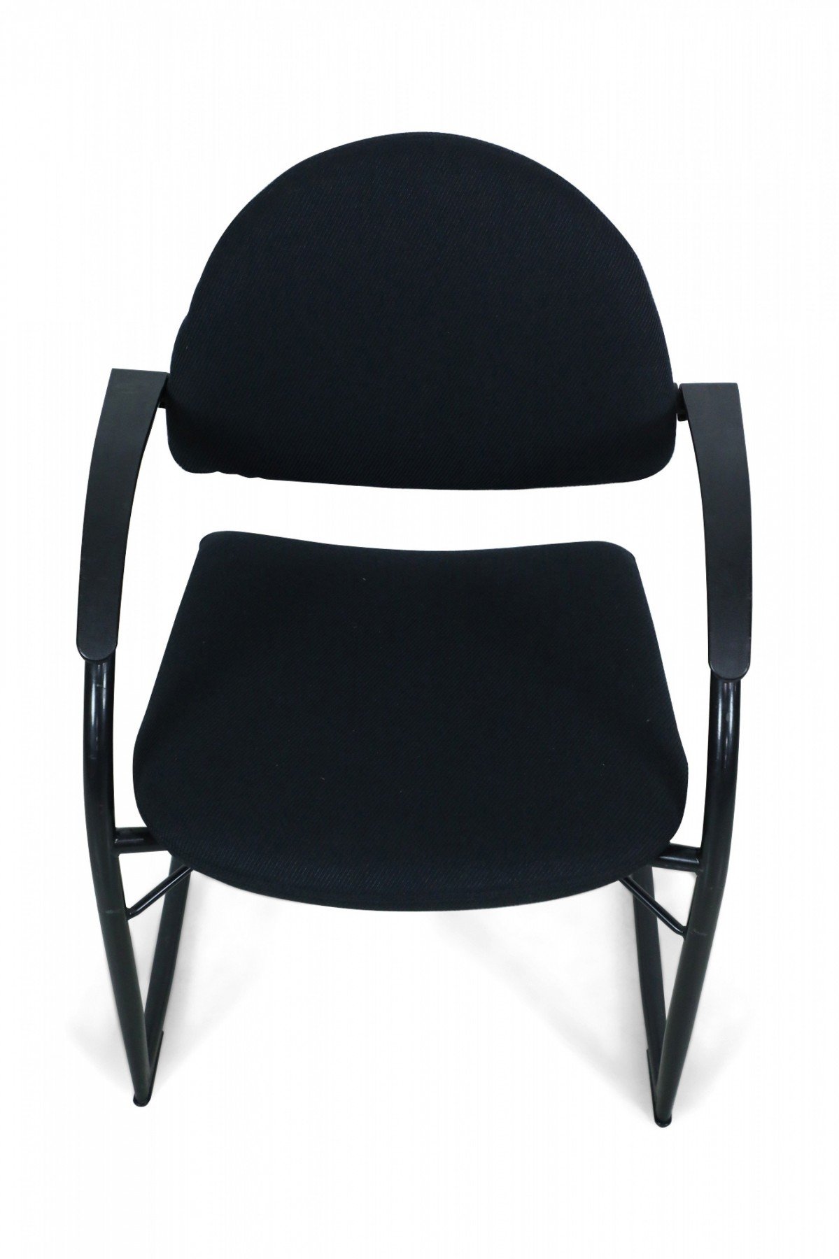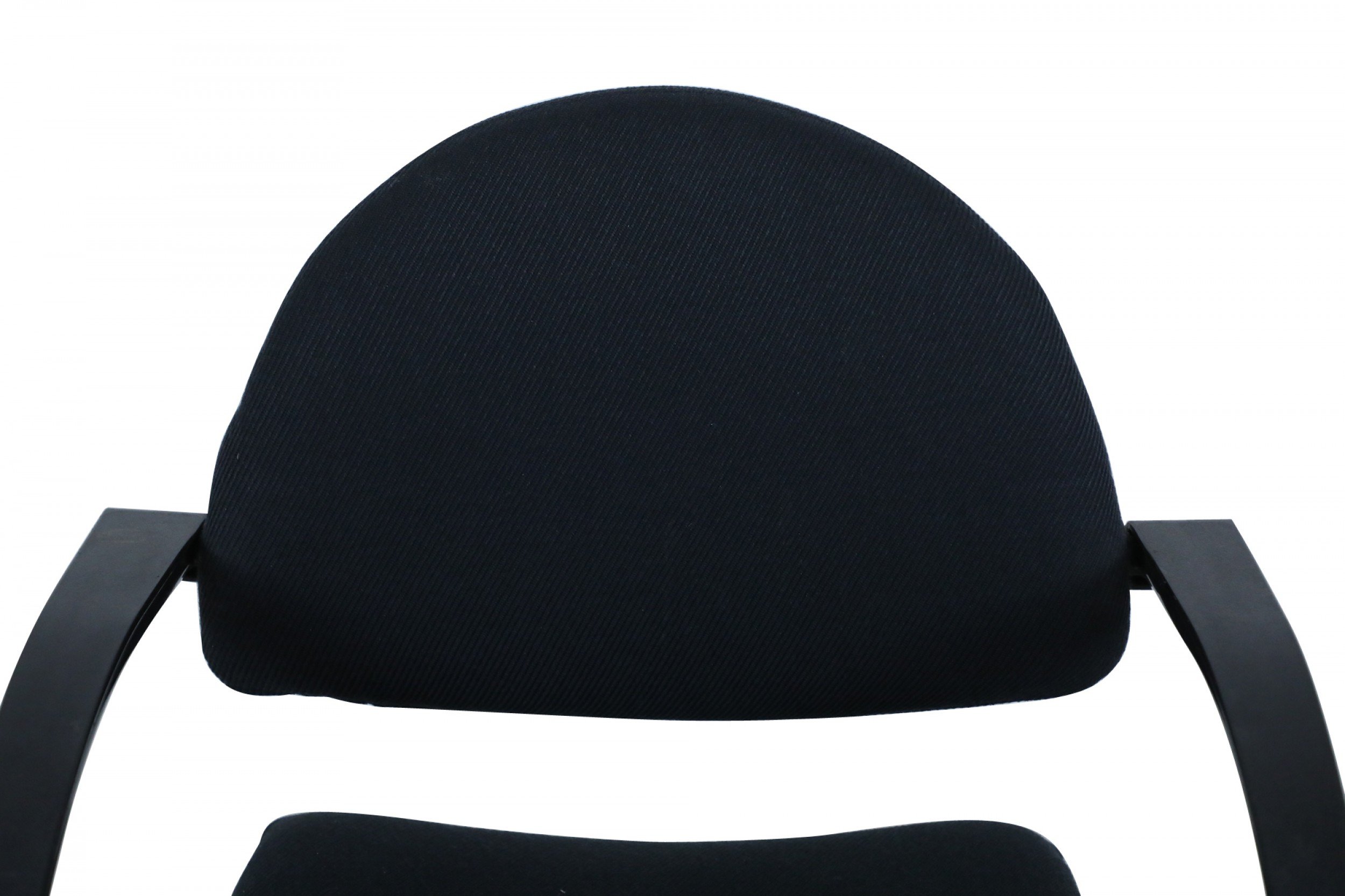 Contemporary black plastic and fabric upholstered office chair with adjustable back rest, curved arms, and stretcher base.