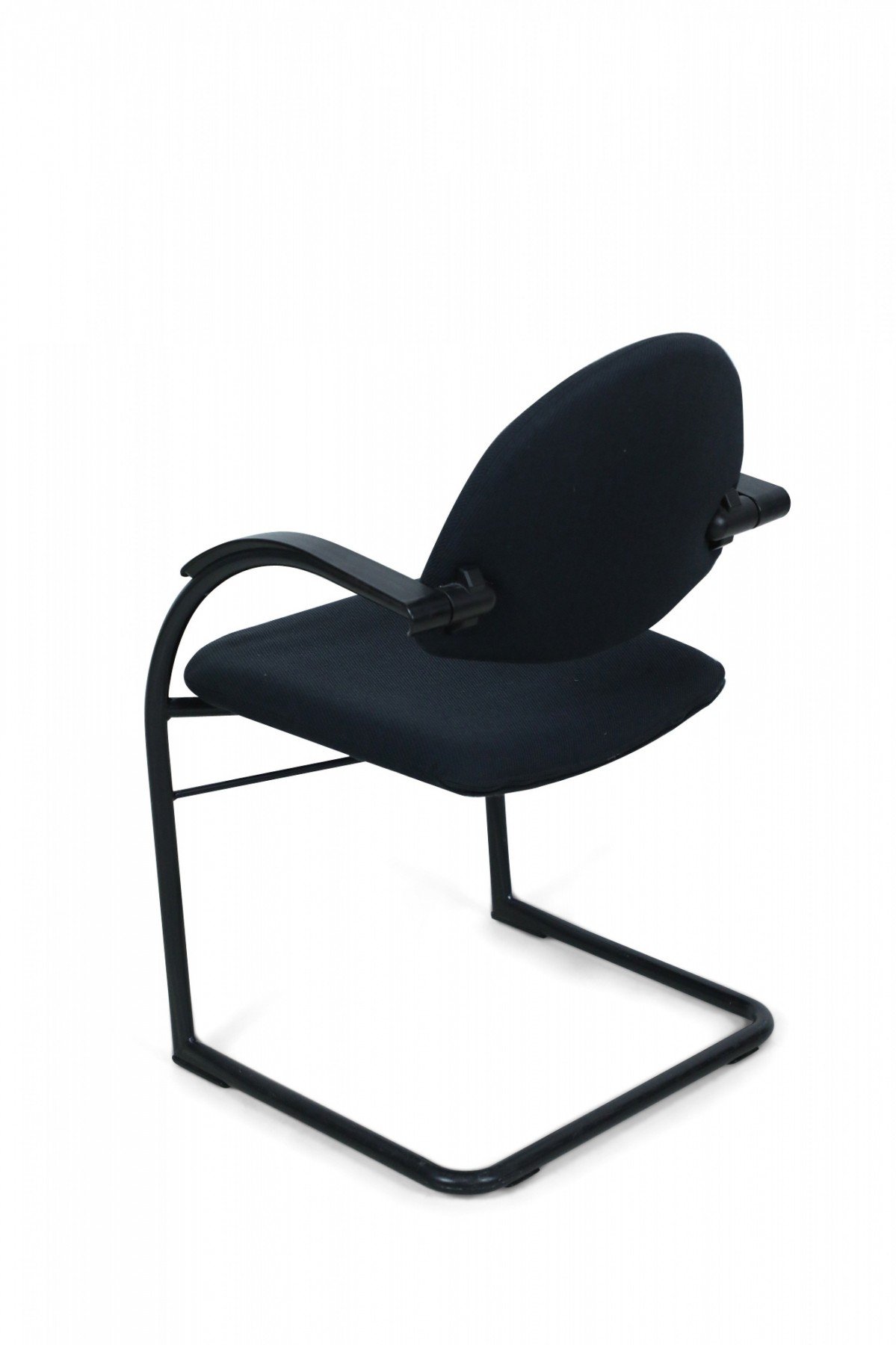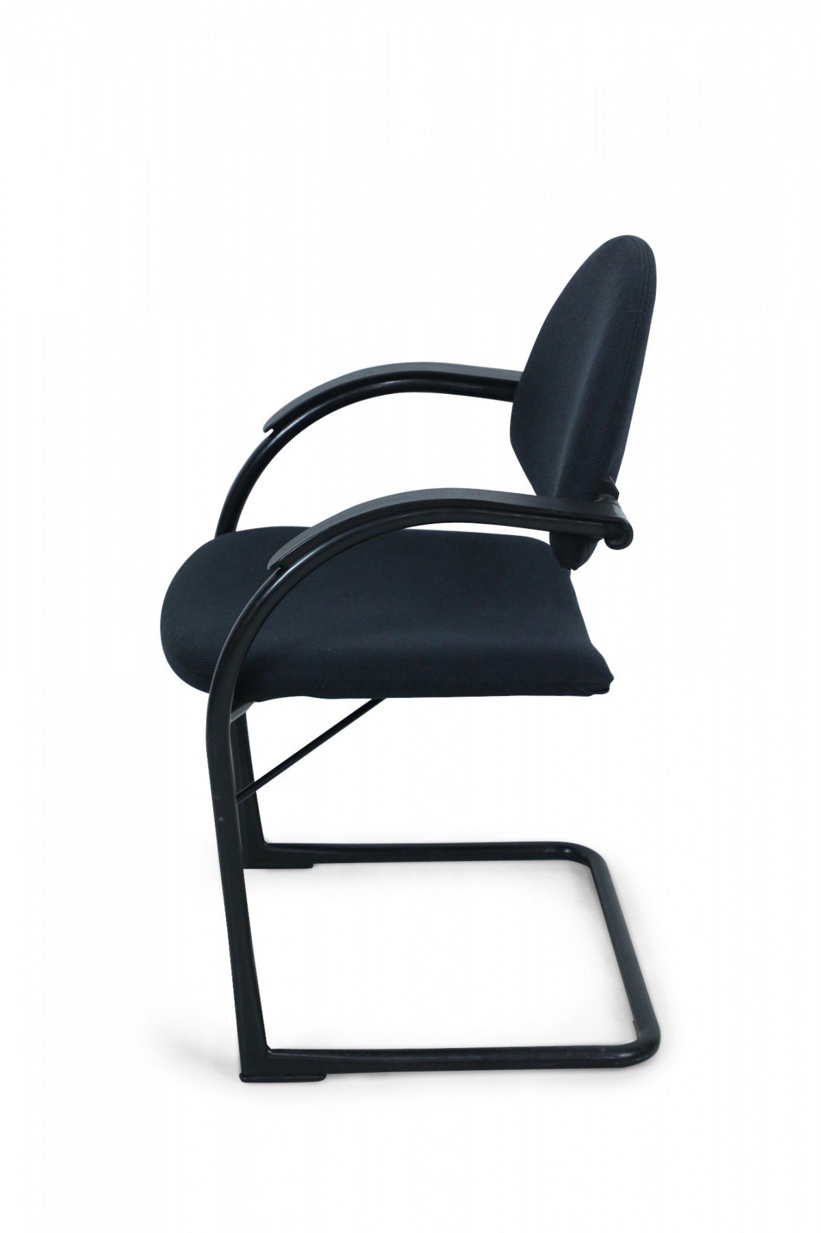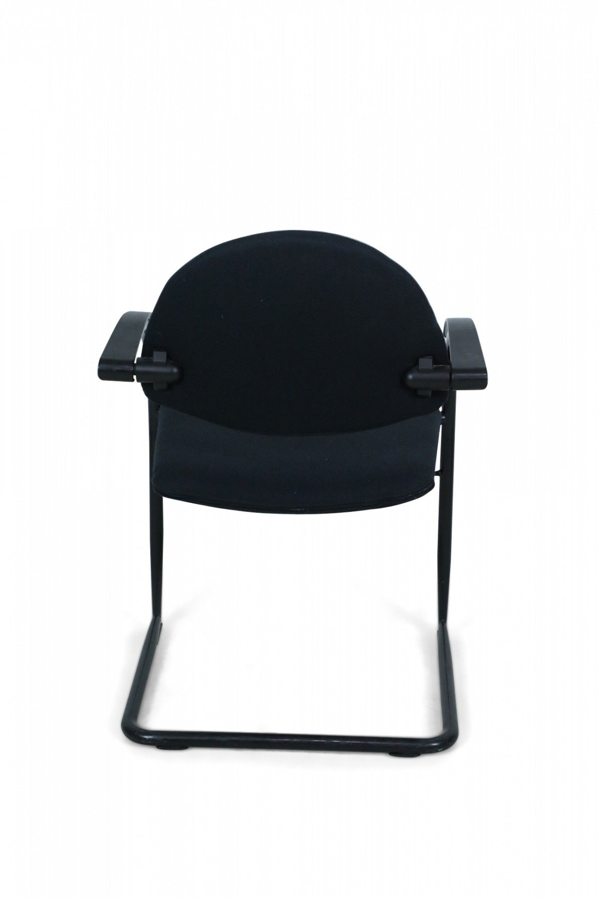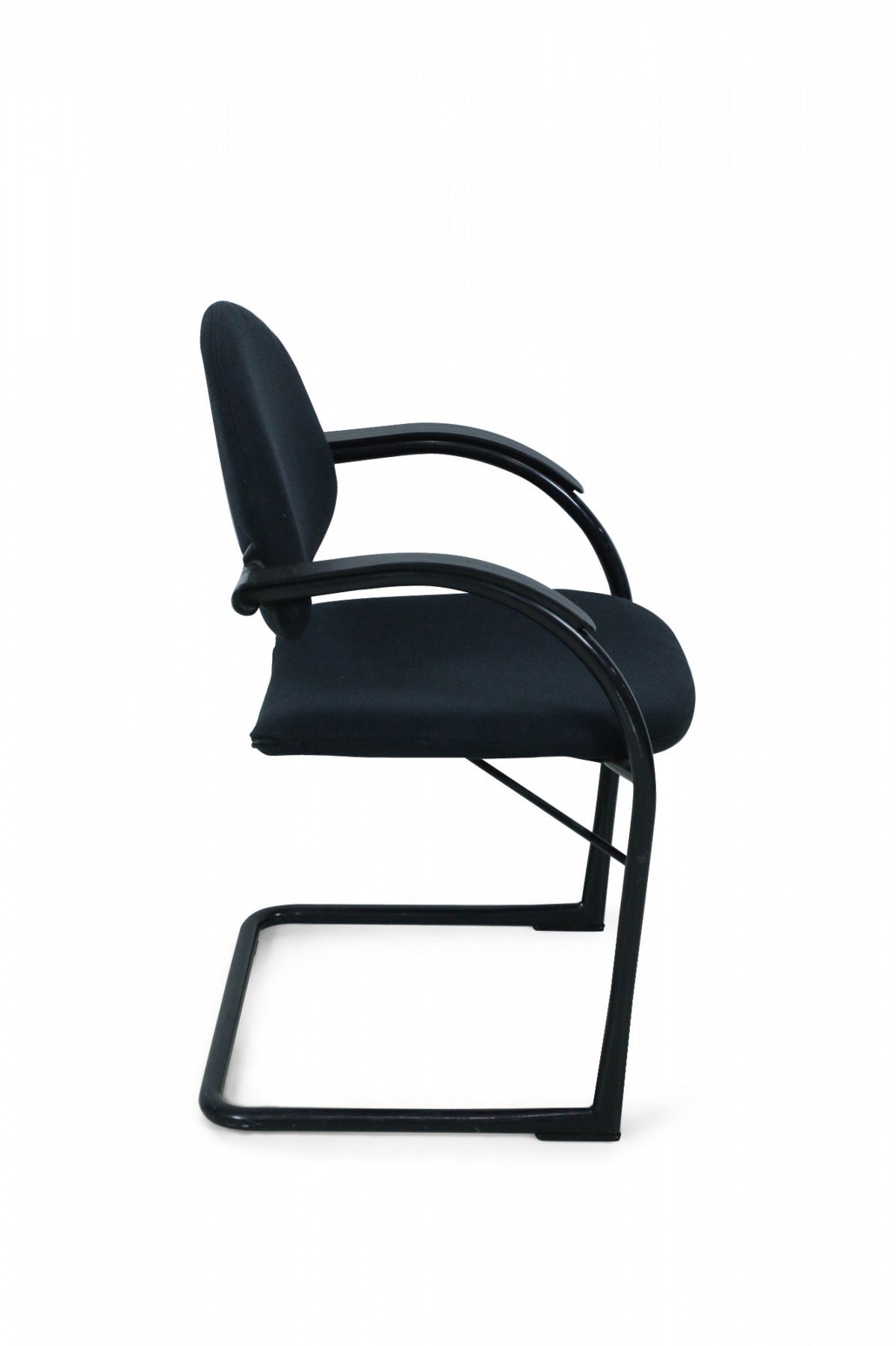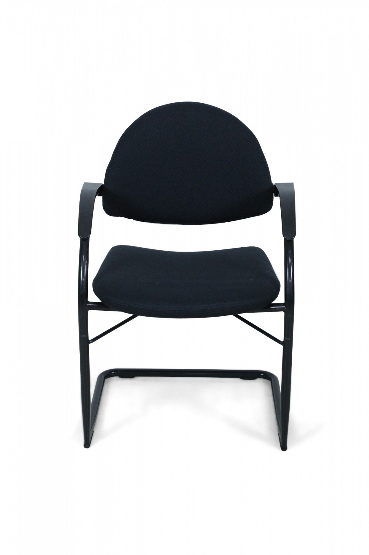 Contemporary black plastic and fabric upholstered office chair with adjustable back rest, curved arms, and stretcher base.