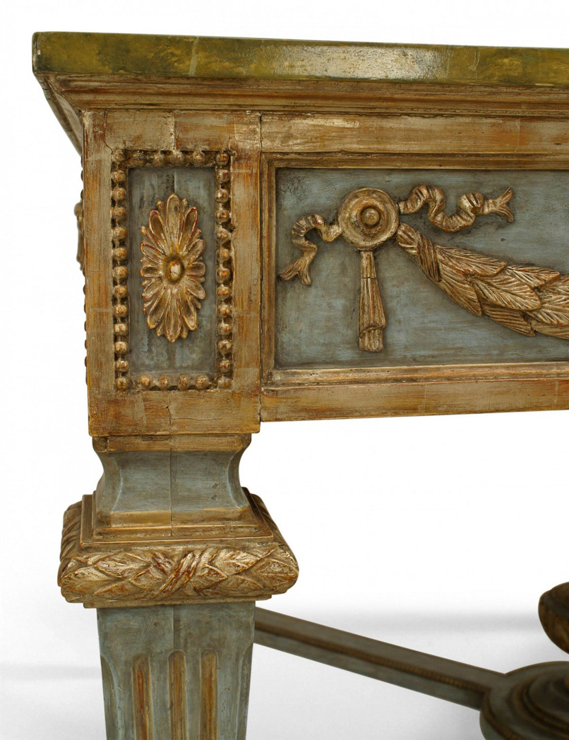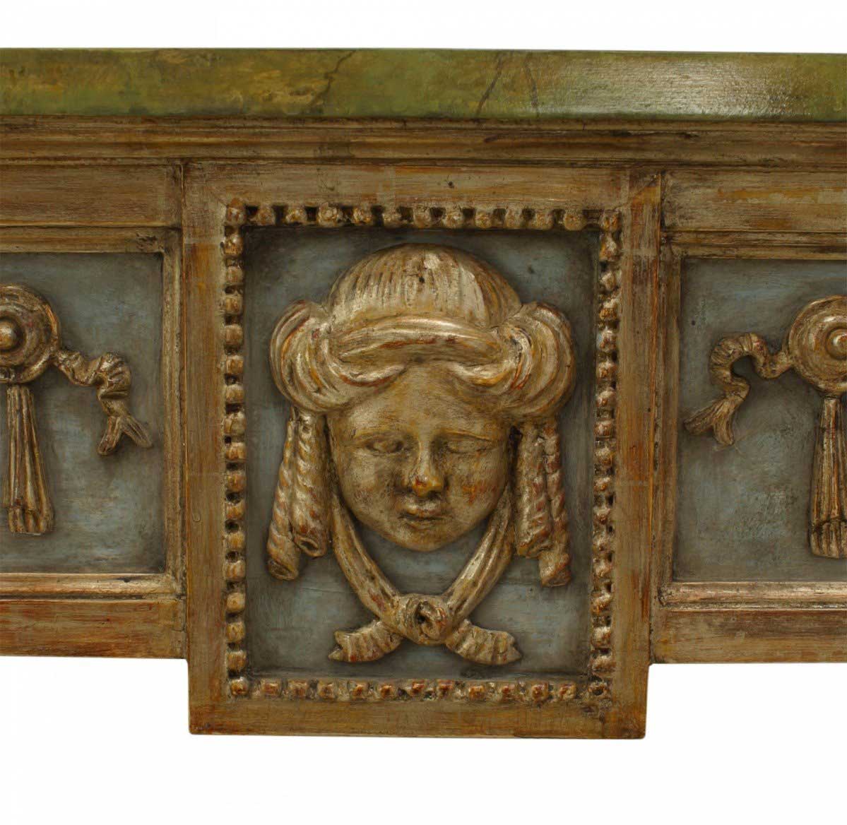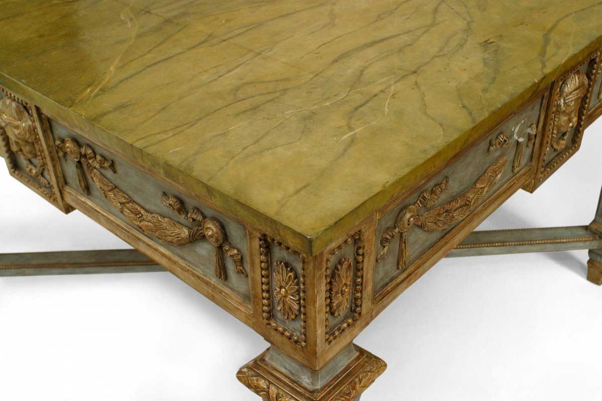 Northern Italian Neo-classic (late 18th Century) silver gilt & blue painted square center table with swags & masks on apron over tapered square legs with stretcher & faux painted marble top.