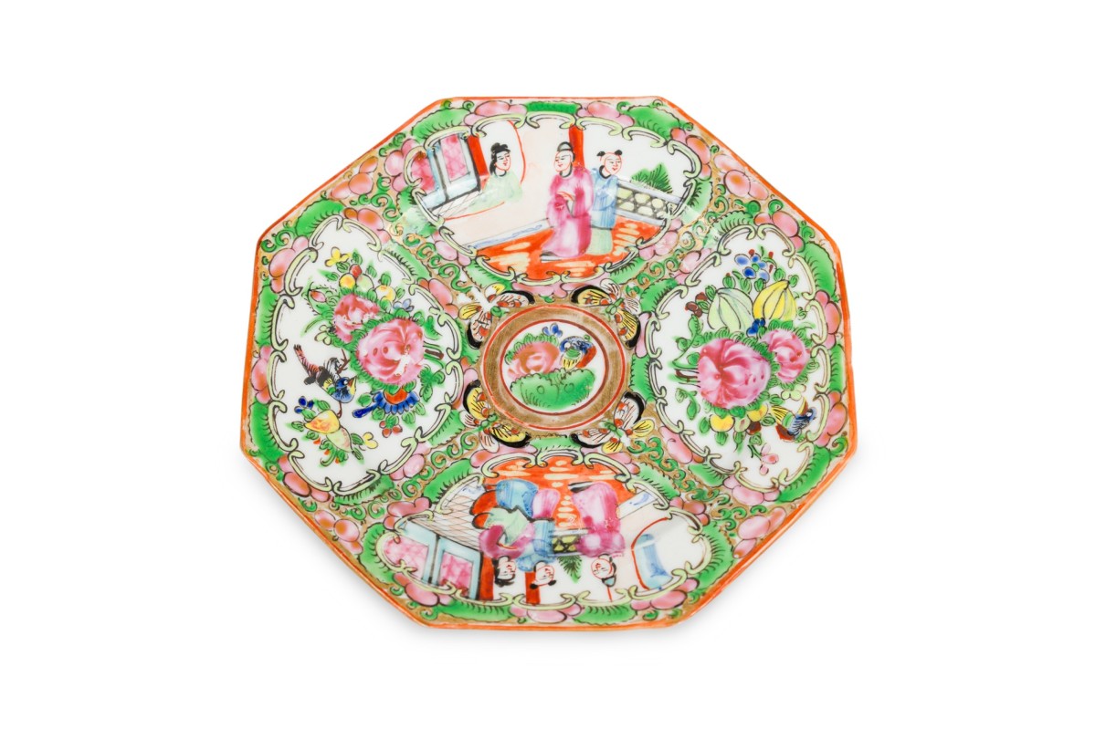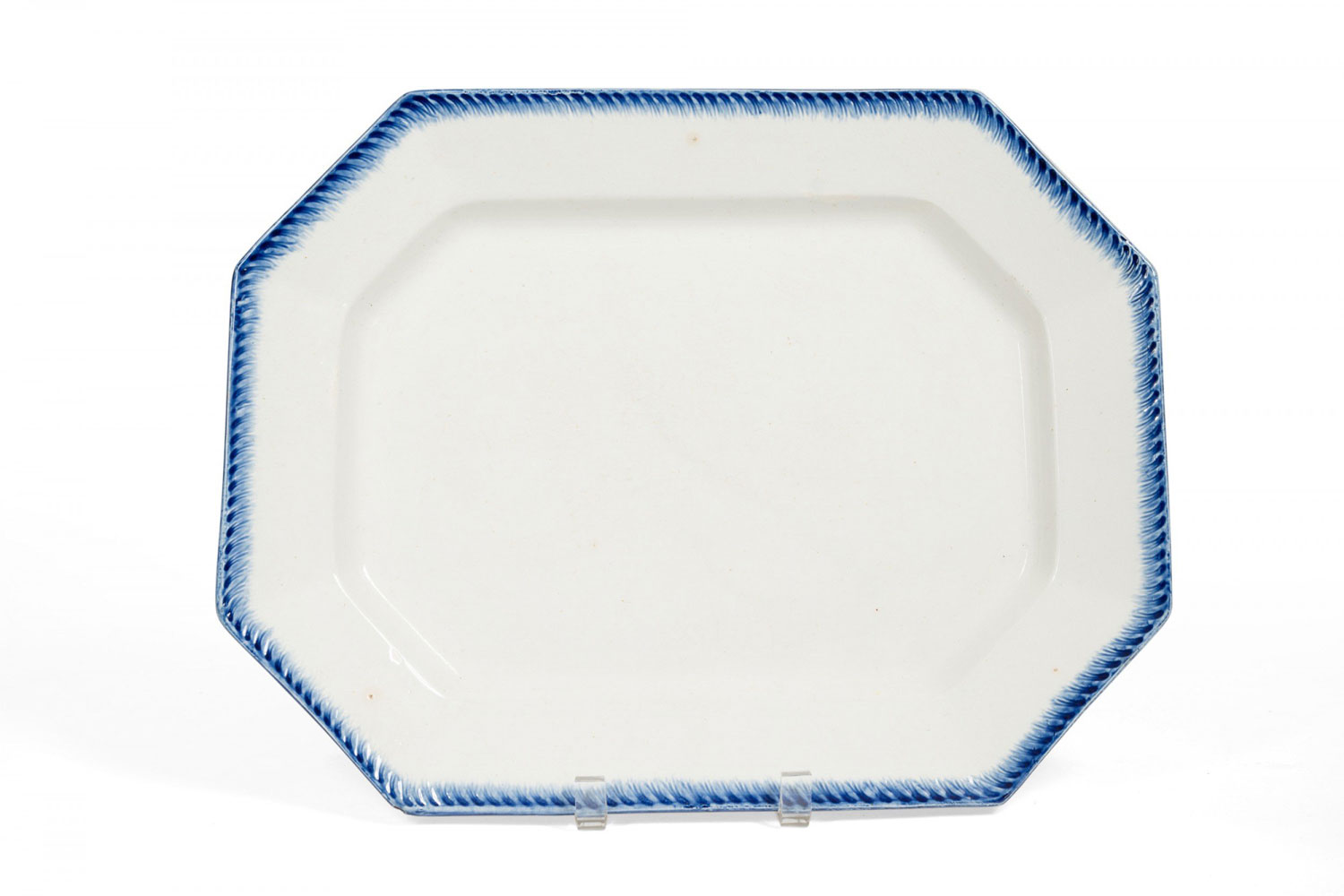 Vintage octagonal white ceramic serving tray with decorative blue glazed edging