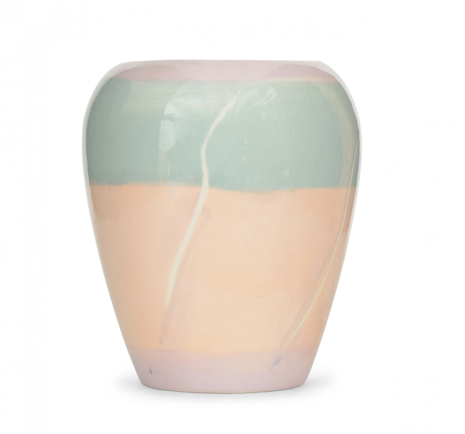 Urn-shaped glazed ceramic vase with horizontal stripes in light purple, green and orange