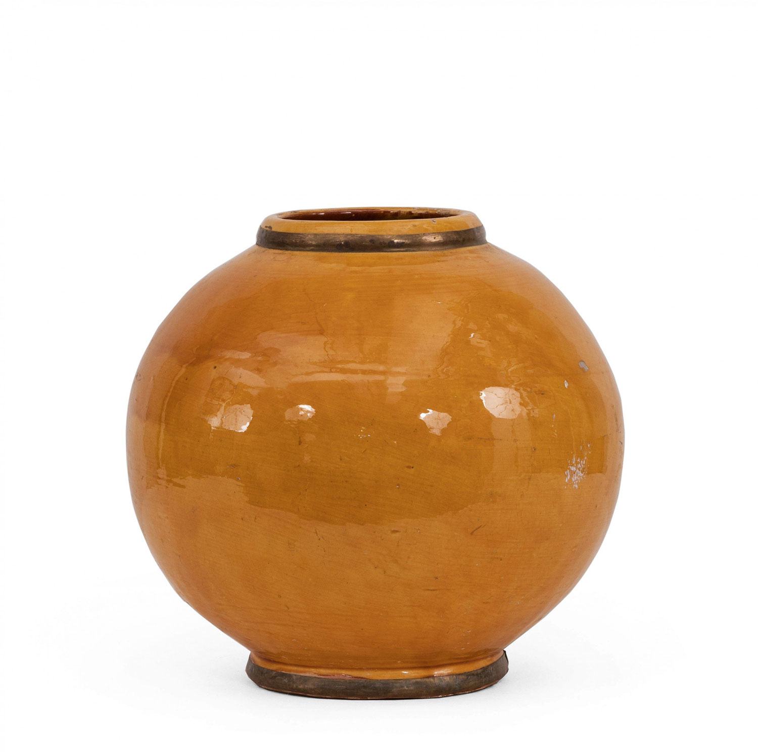 Contemporary fishbowl-shaped ceramic vase with a gold glaze and a copper colored rim and foot