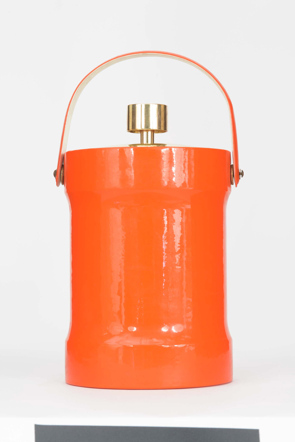 Orange plastic ice bucket with a handle and a gold metal lid with a knob.