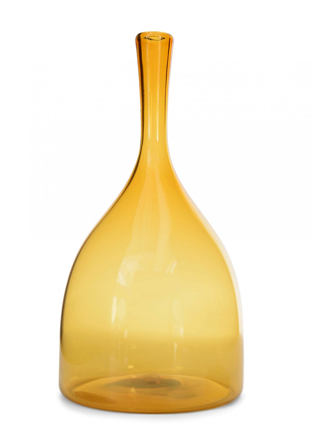 Orange tinted blown glass bud vase with a wide body tapering into a long, narrow neck