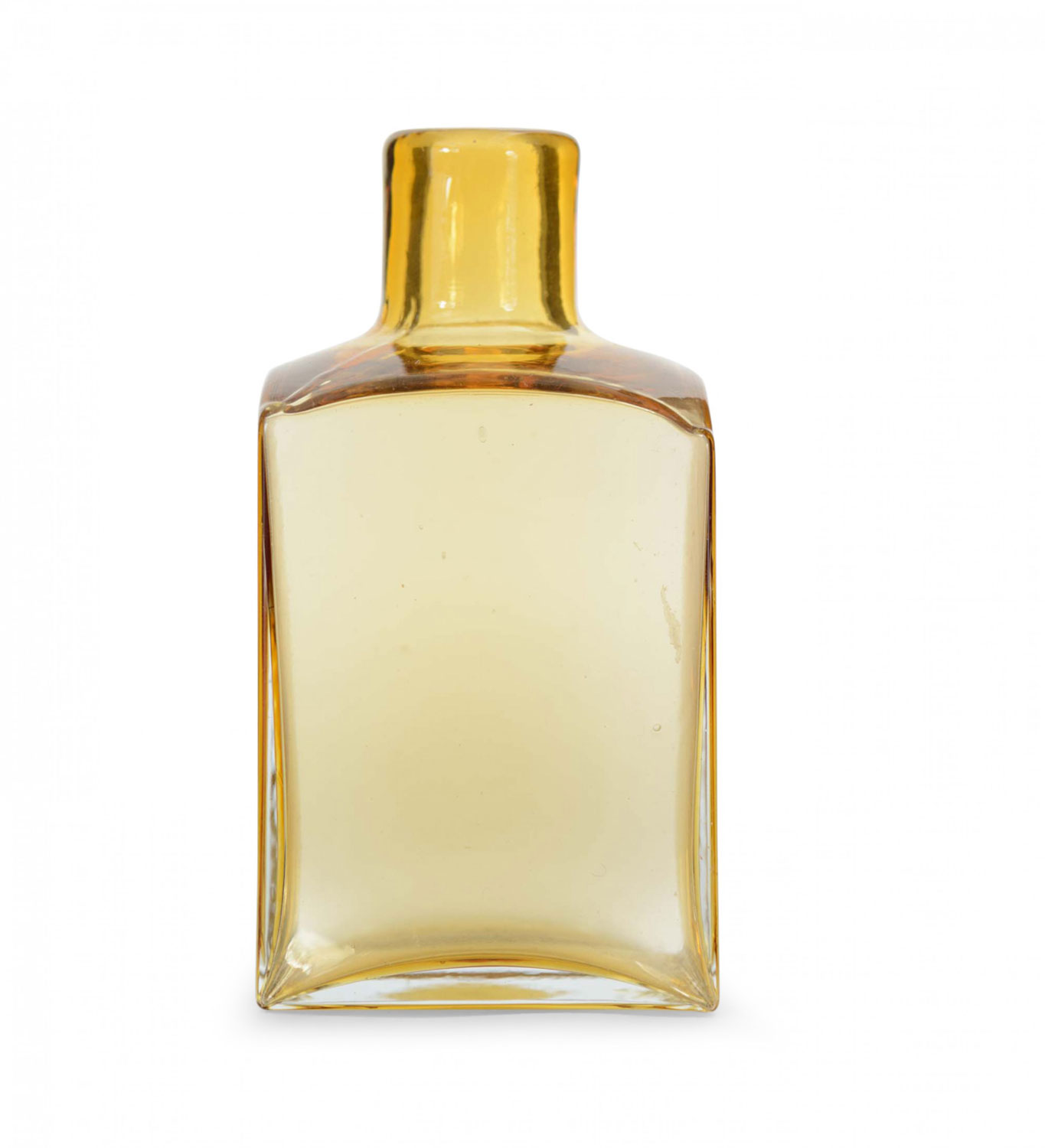 Square-based bottle-shaped orange tinted glass bud vase with a cylindrical, rimmed neck