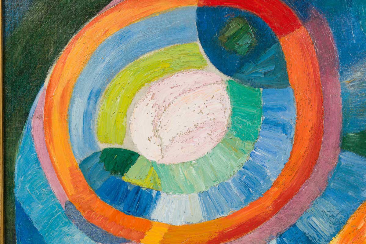 Copy of a painting in a cubist style called orphism showing the overview of a table set with fruit and china