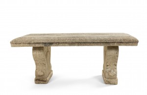 Outdoor concrete 3 section bench with scroll design on the pedestal bases.