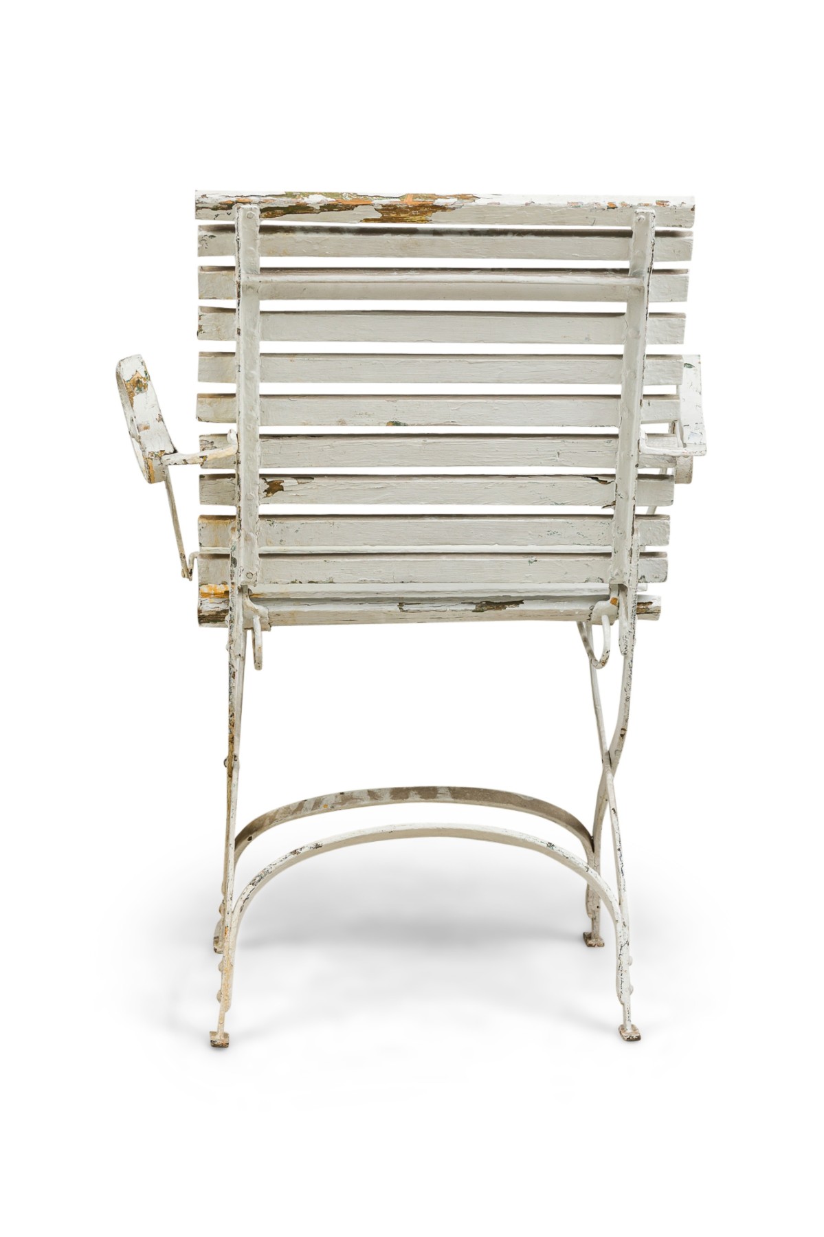 Outdoor French (19th-20th Century) folding white painted iron arm chair with scroll designs and narrow slat wood seat and back
