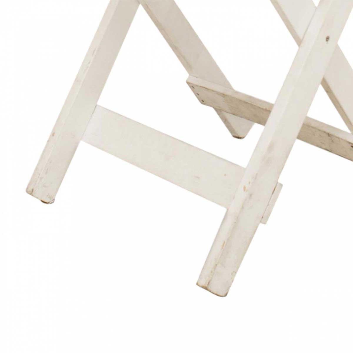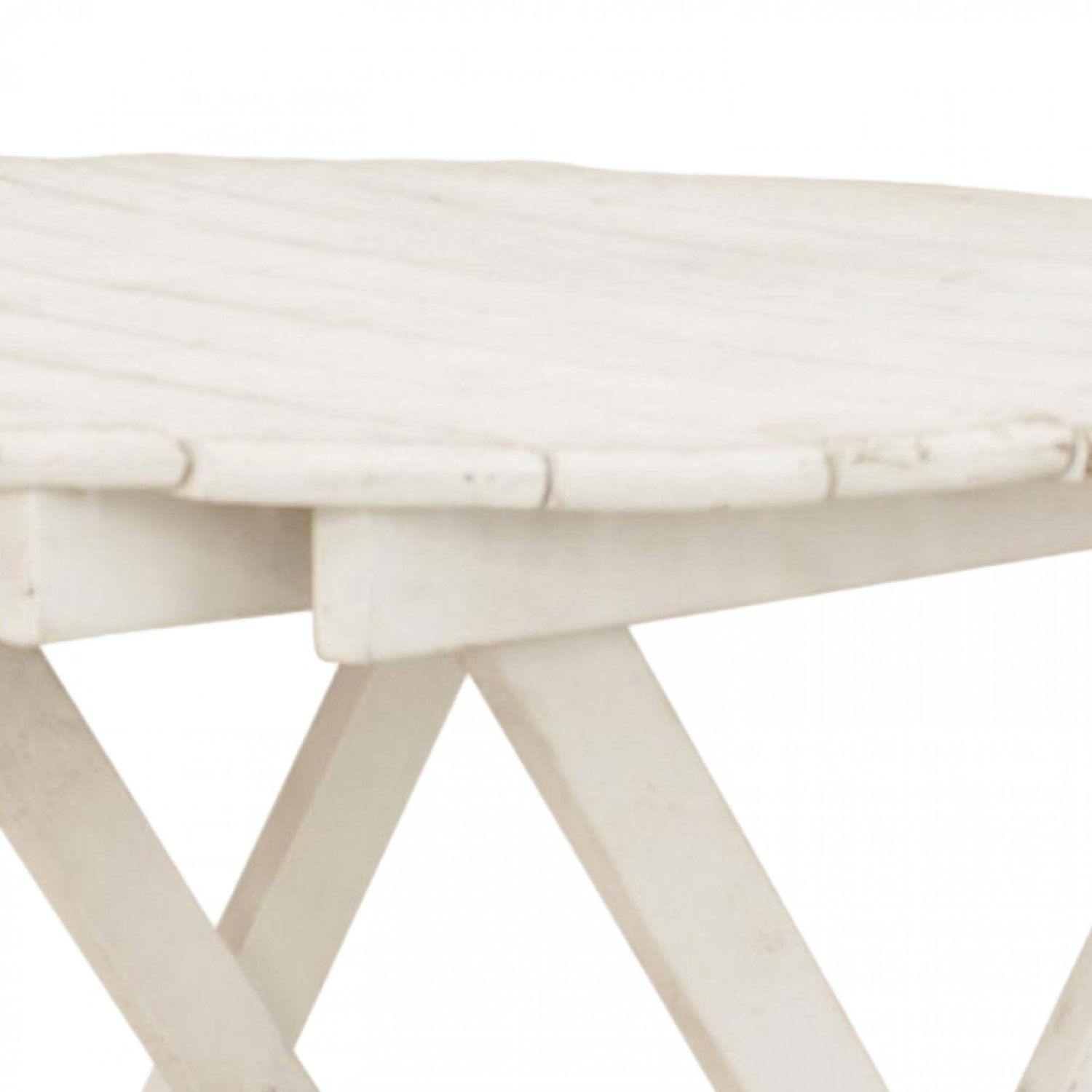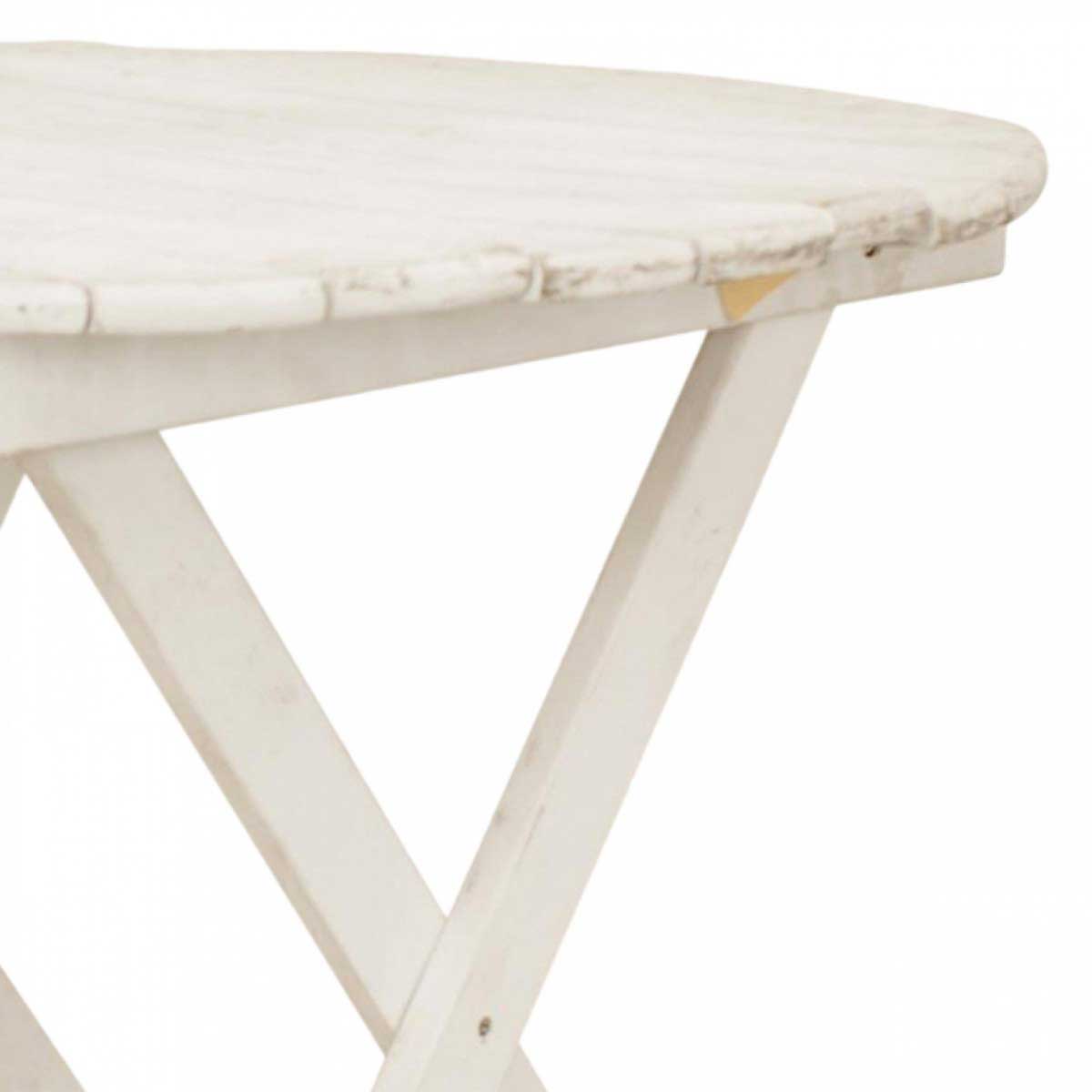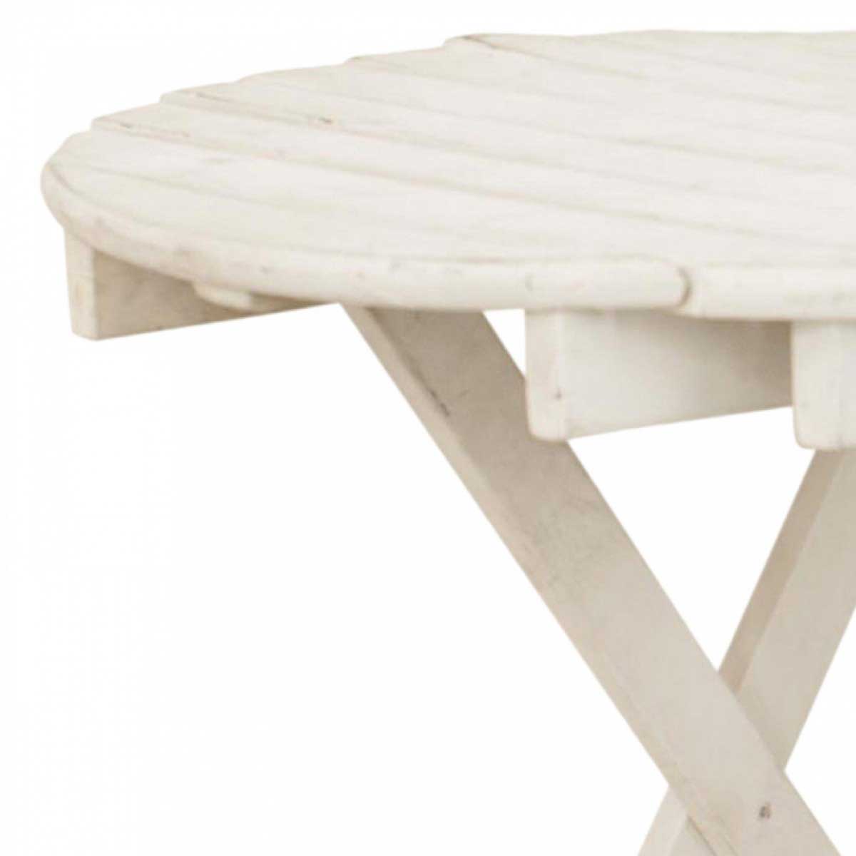 Outdoor round white painted slat design top cafe style end table with a folding wood base
