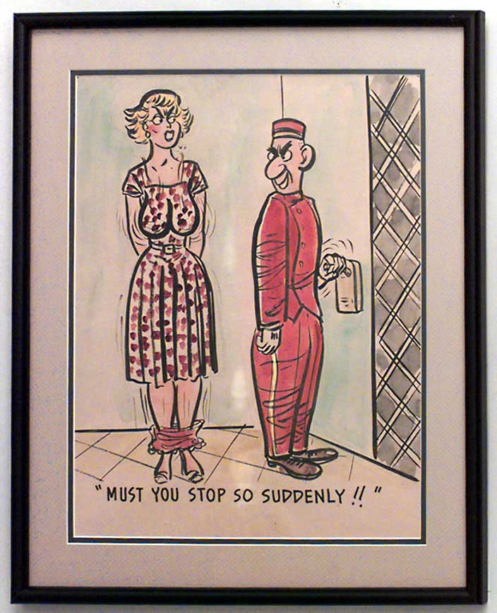 American Mid-Century (unsigned) black framed caricature watercolor of woman in elevator with panties around her ankles ("Must you stop so suddenly!")