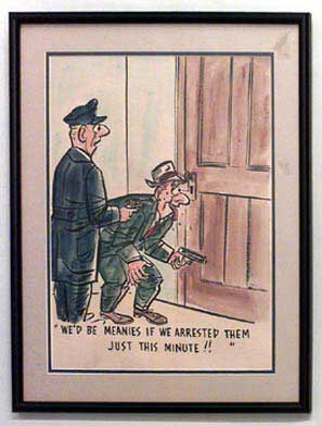 American Mid-Century (unsigned) black framed caricature watercolor of 2 cops looking through peep hole (We'd be meanies if we arrested them just this minute!")
