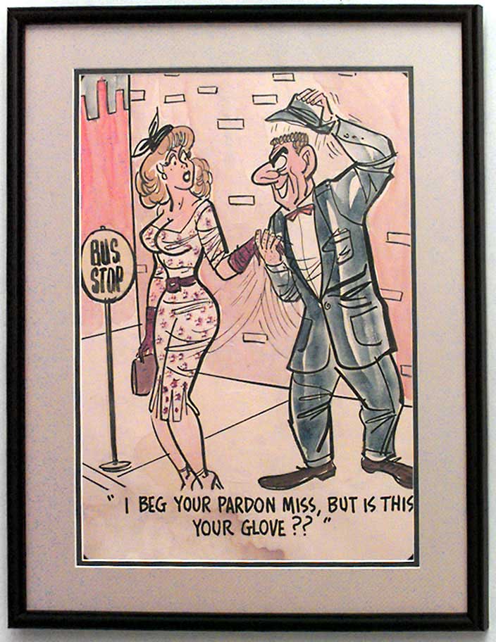 American Mid-Century (unsigned) black framed caricature watercolor of man flirting with woman at bus stop ("I beg your pardon Miss, but is this your glove?")