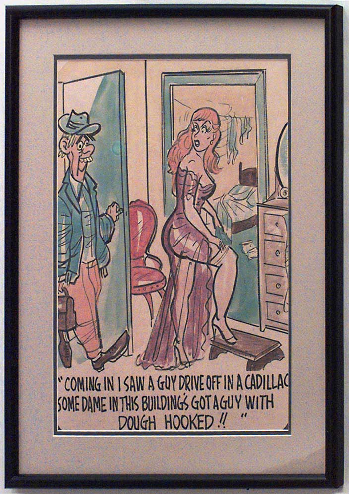 American Mid-Century (unsigned) black framed caricature watercolor of man walking into apt. with woman in lingerie ("Coming in I saw a guy drive off in a Cadillac...")