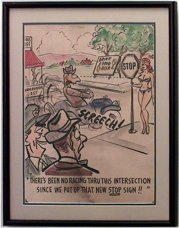 American Mid-Century (unsigned) black framed caricature watercolor of sexy girl holding sign ("There's been no racing through this intersection since we got that new Stop sign")