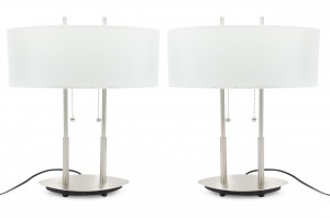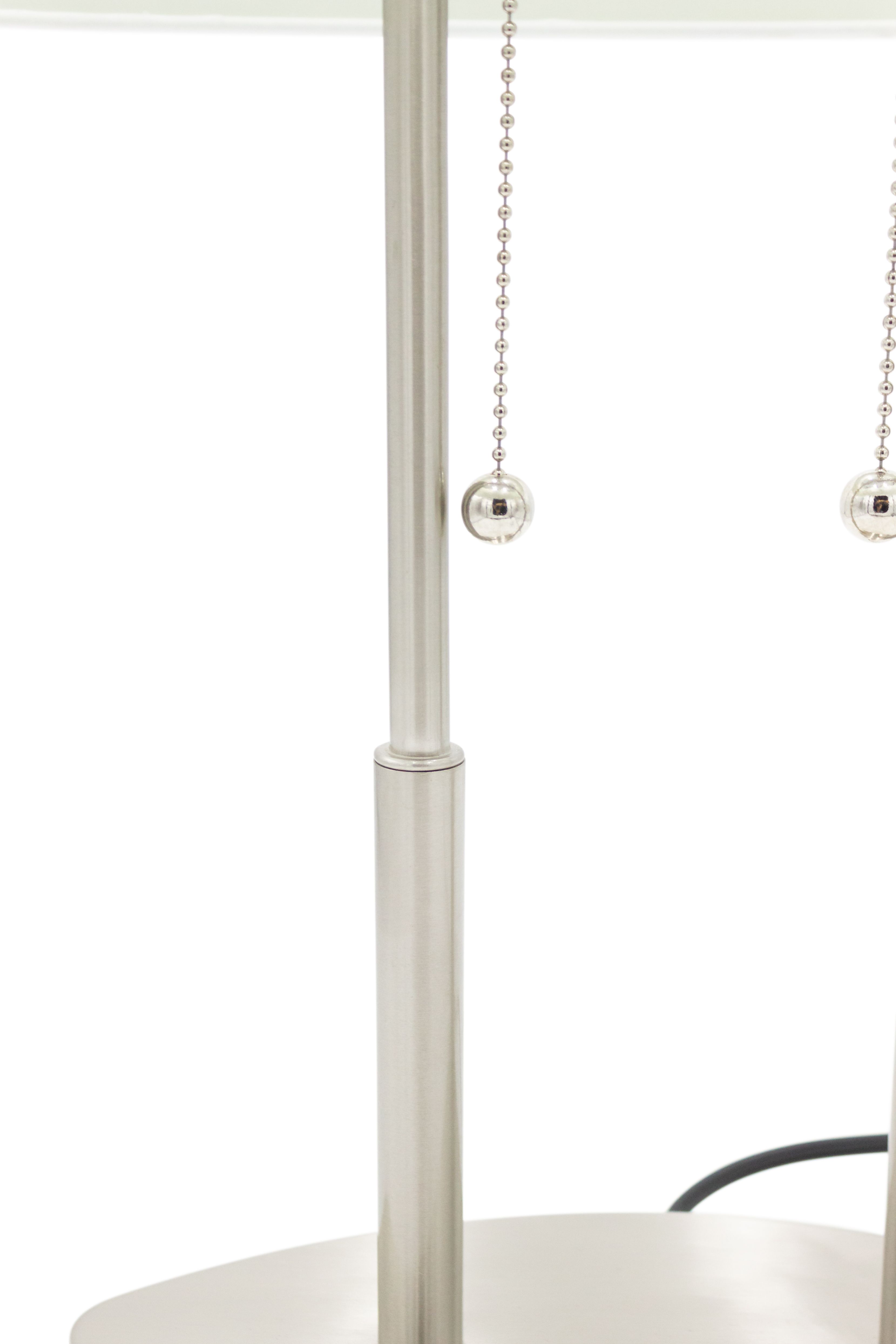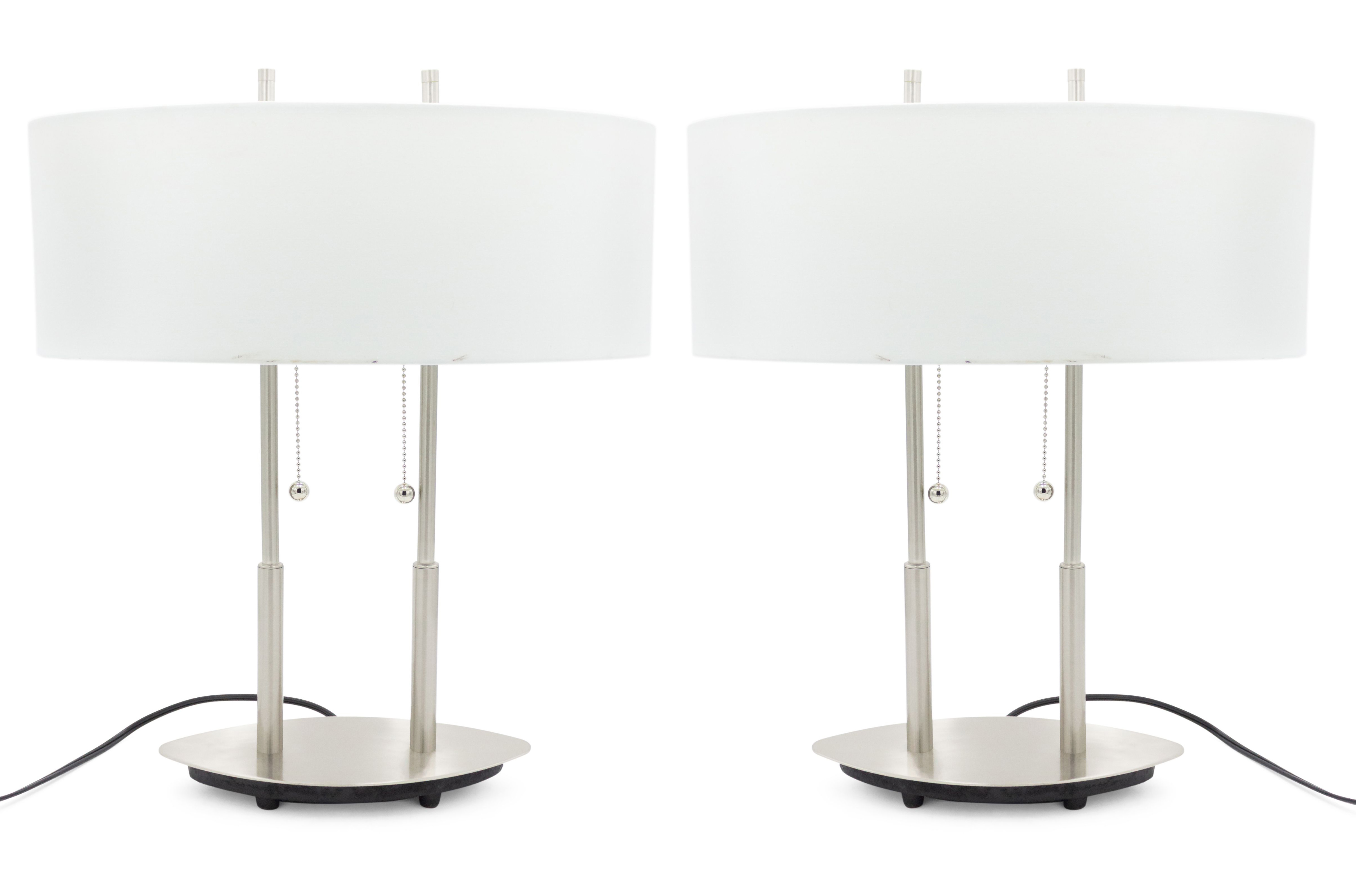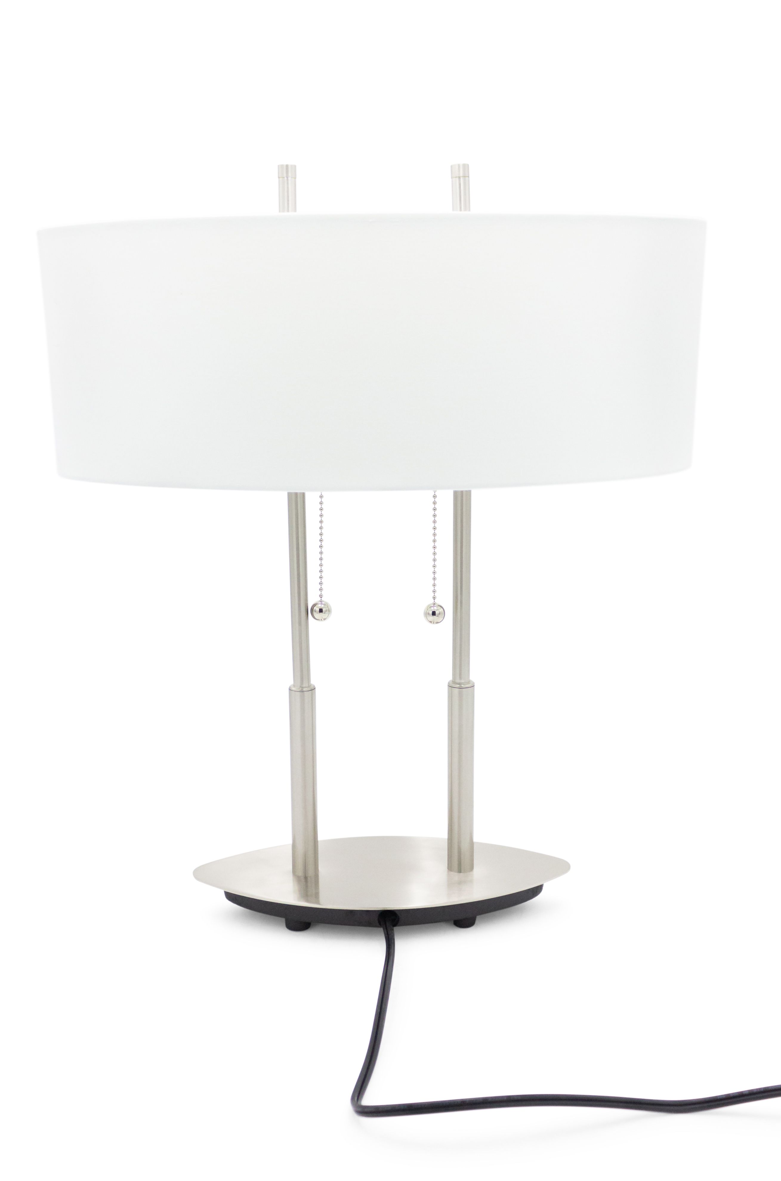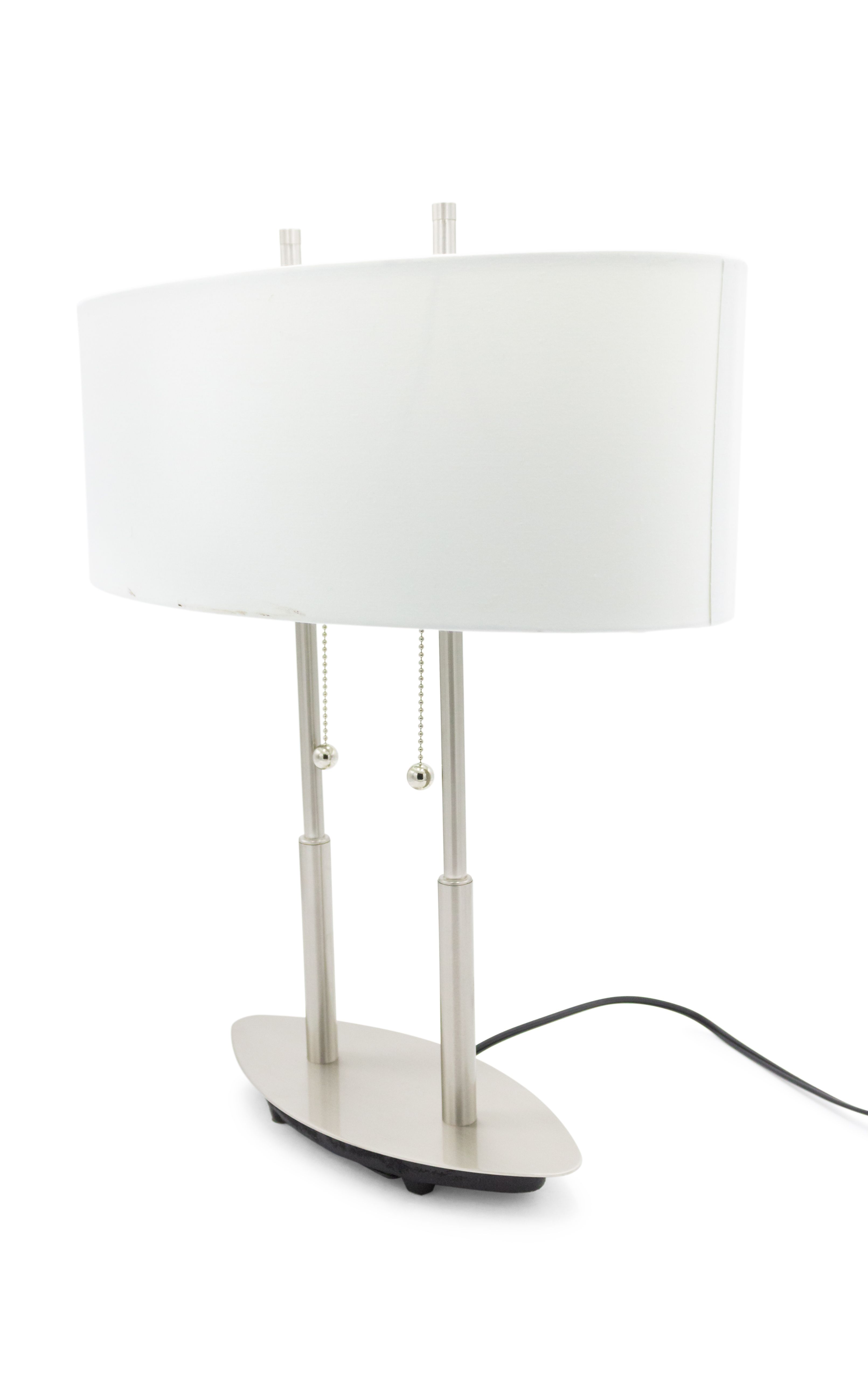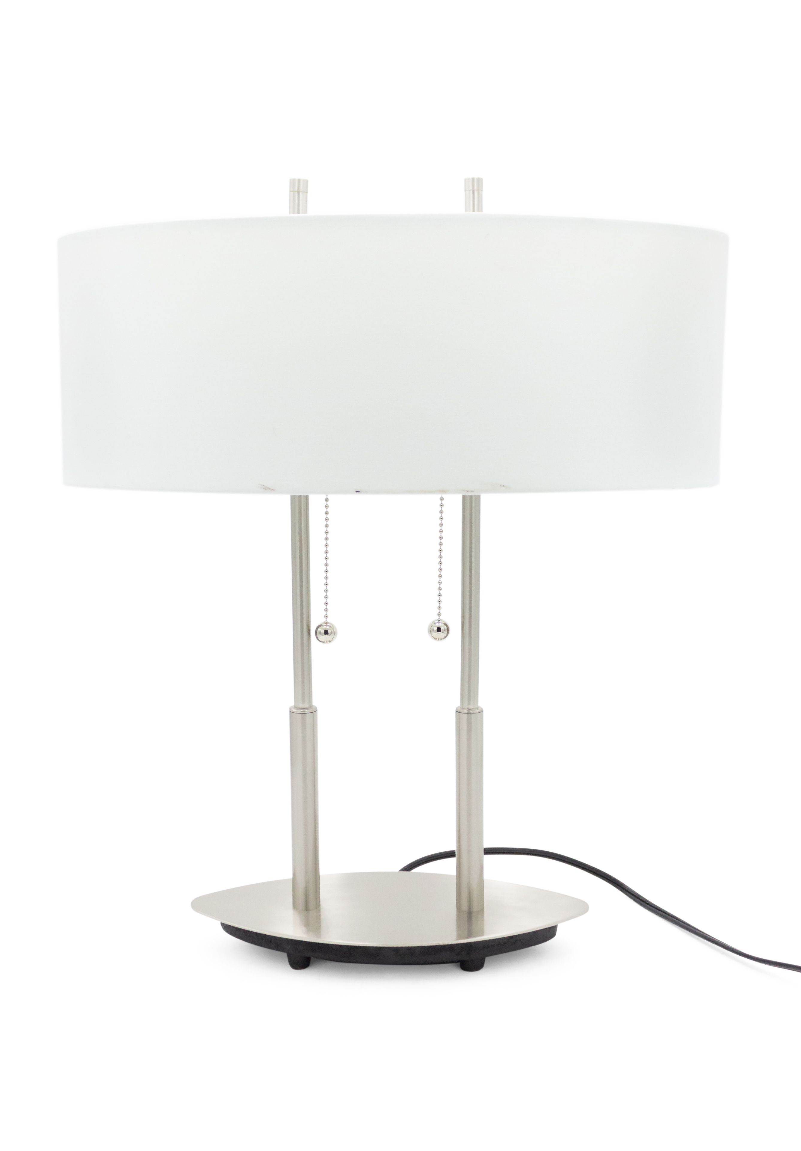 2 Contemporary silver metal double post table lamps with Marquise bases and ovoid white linen shades (PRICED EACH)