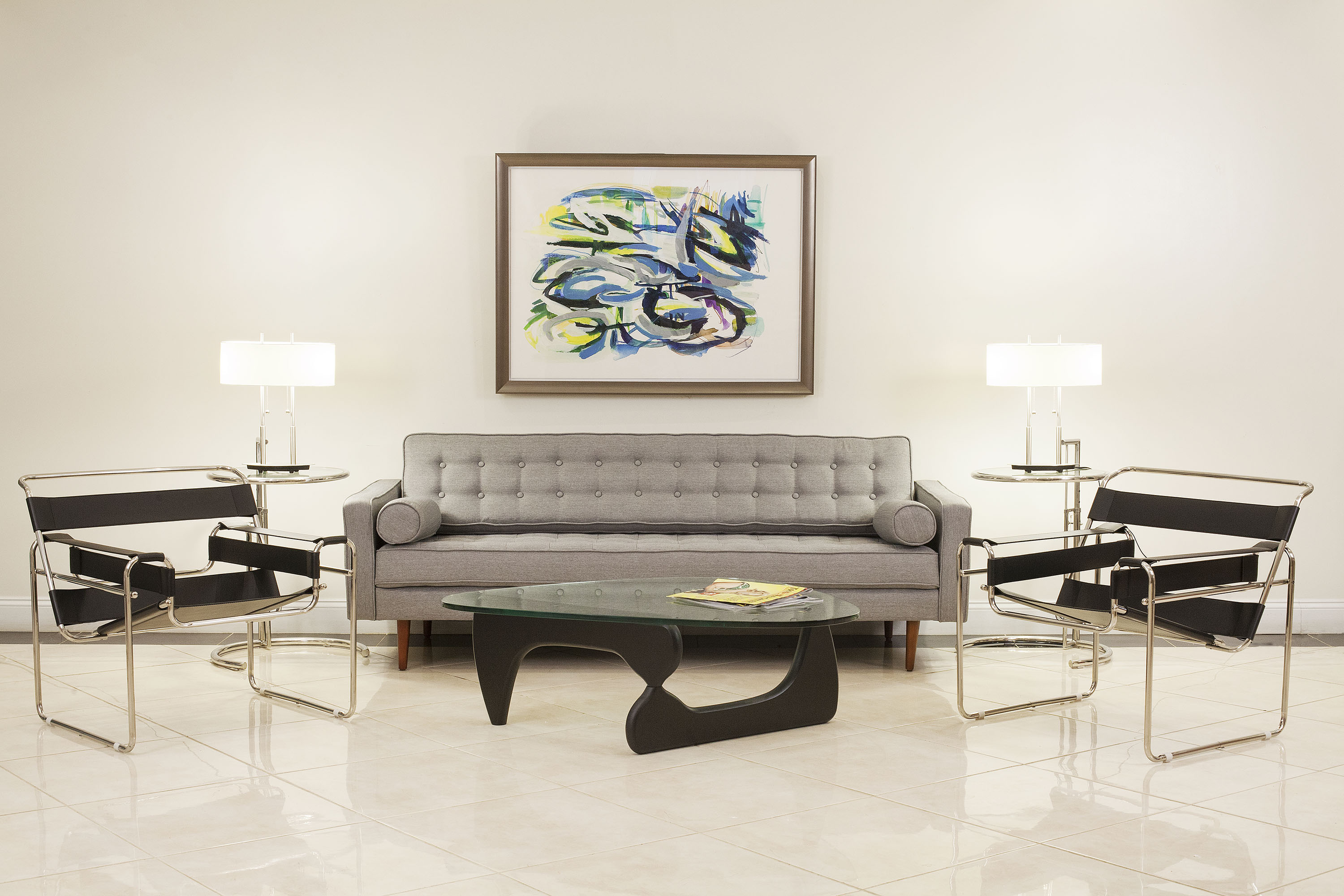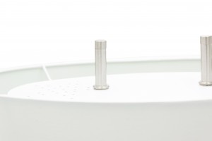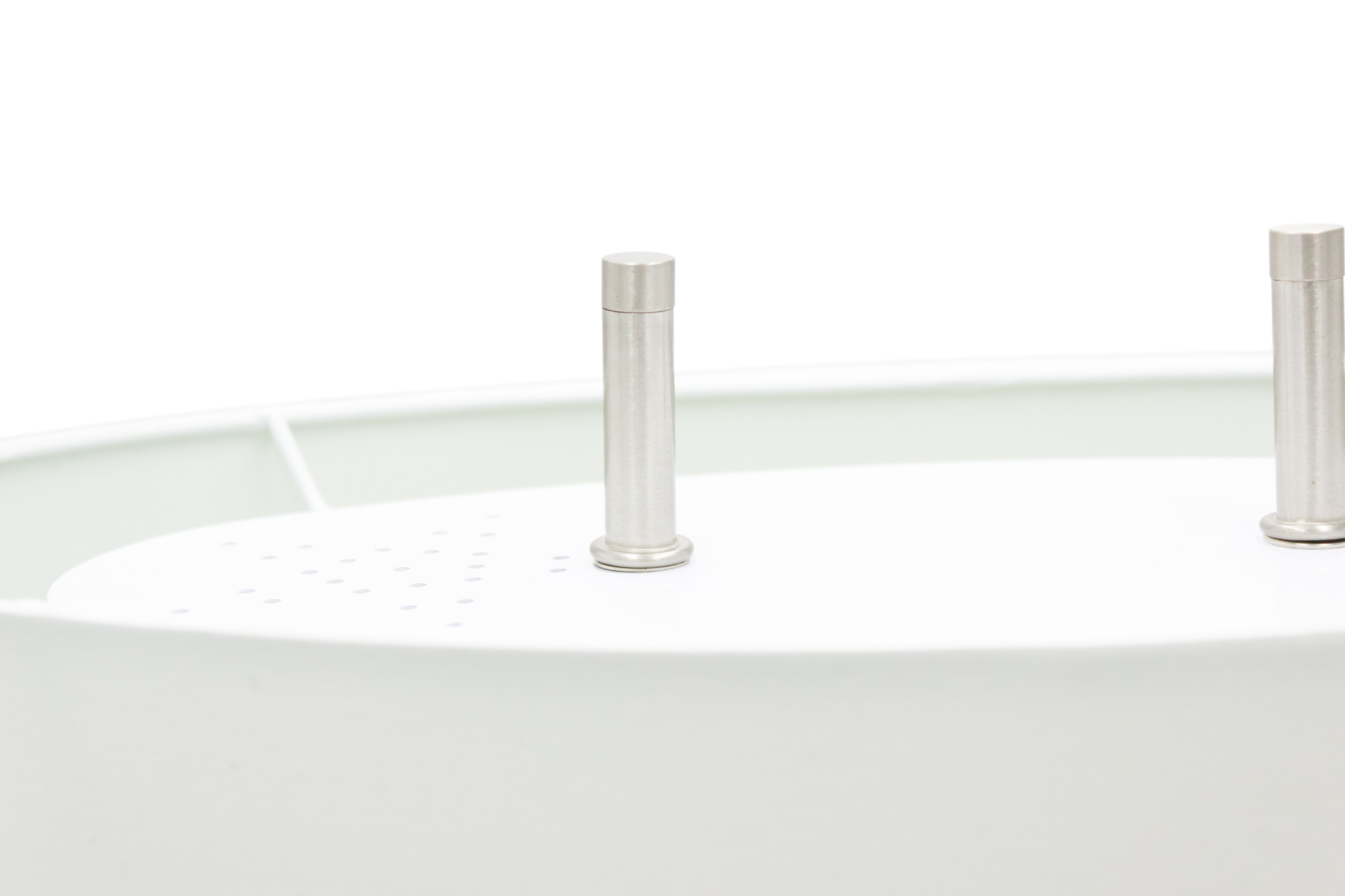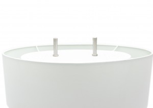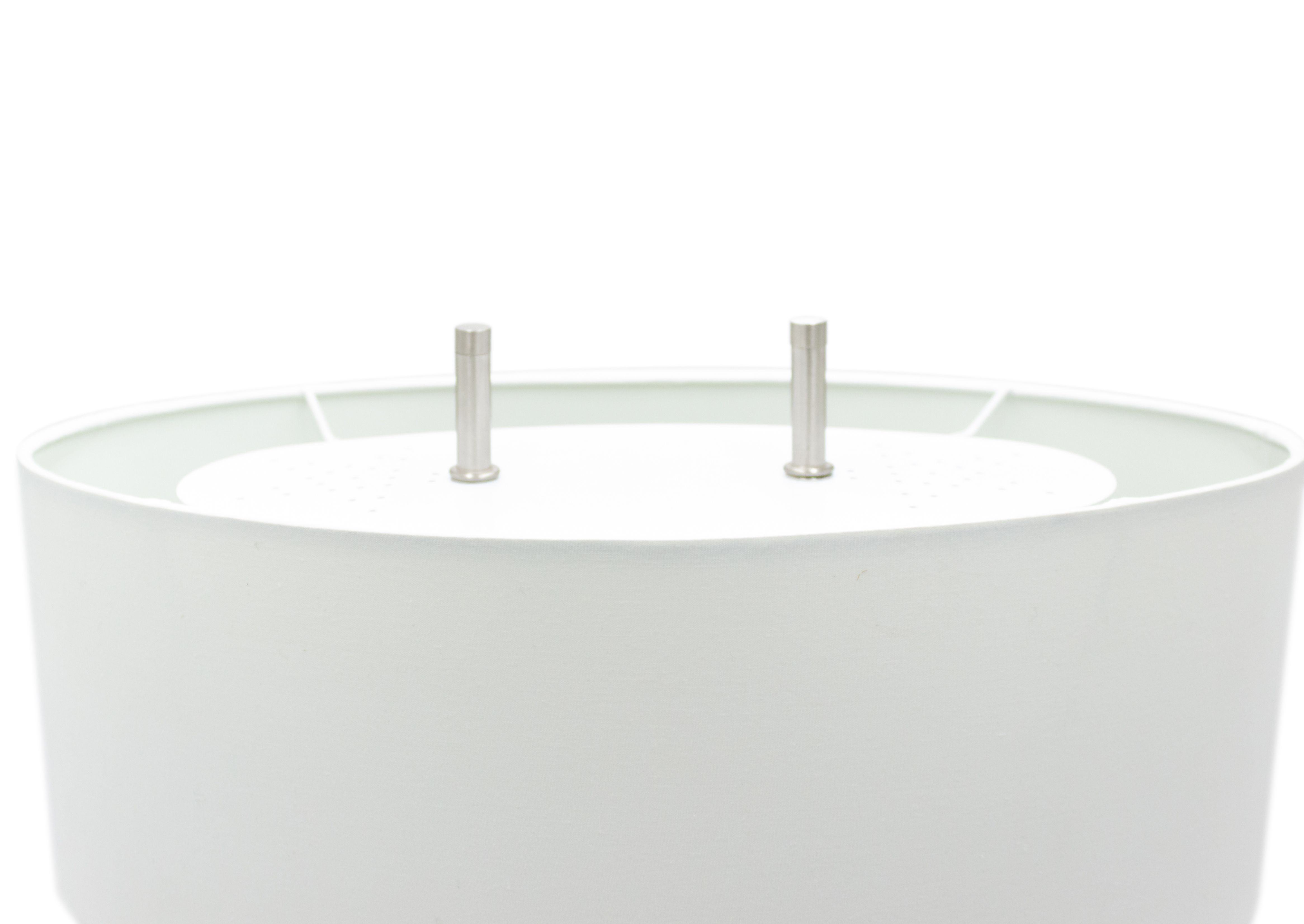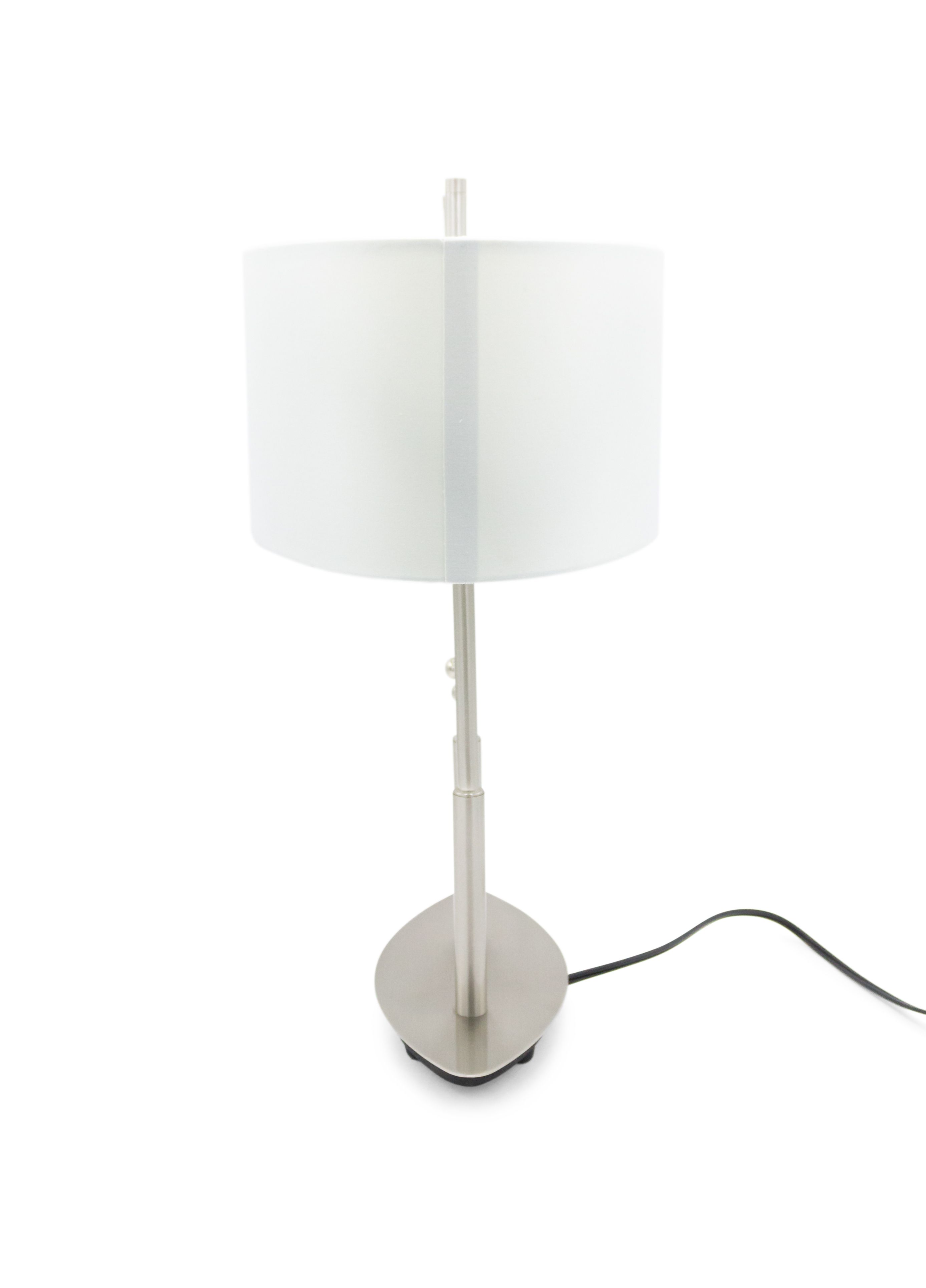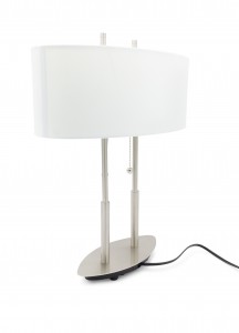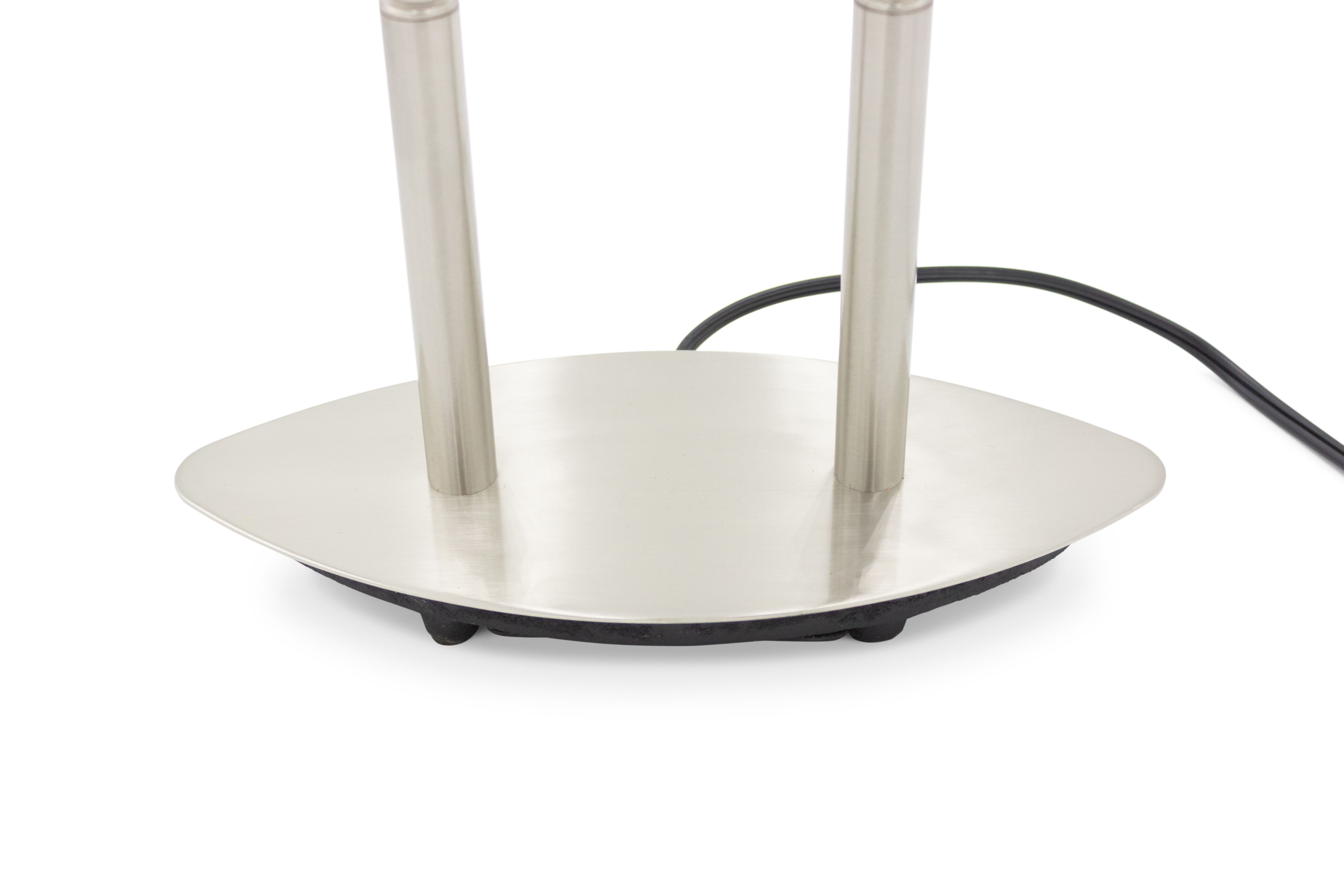 2 Contemporary silver metal double post table lamps with Marquise bases and ovoid white linen shades (PRICED EACH)