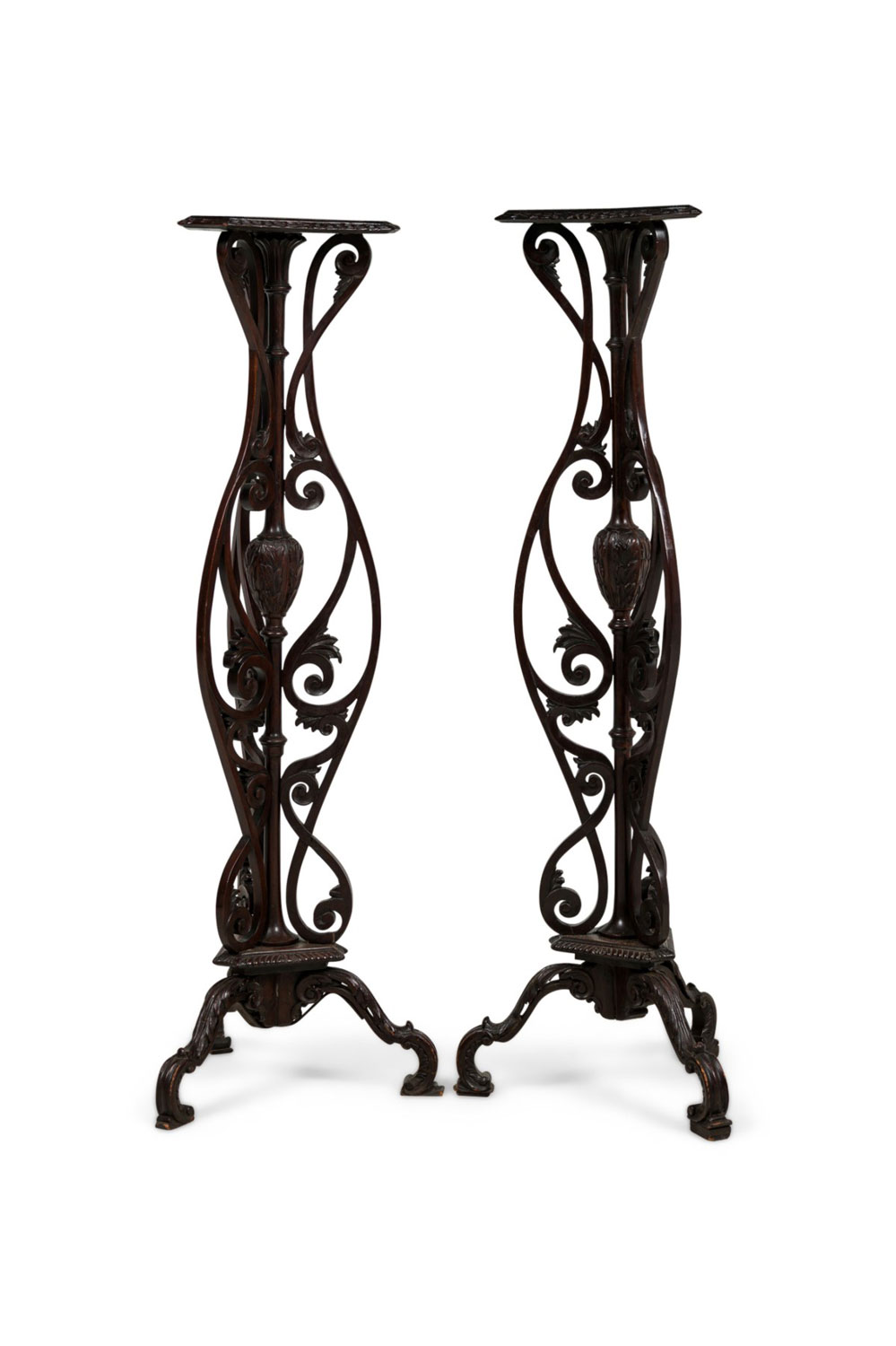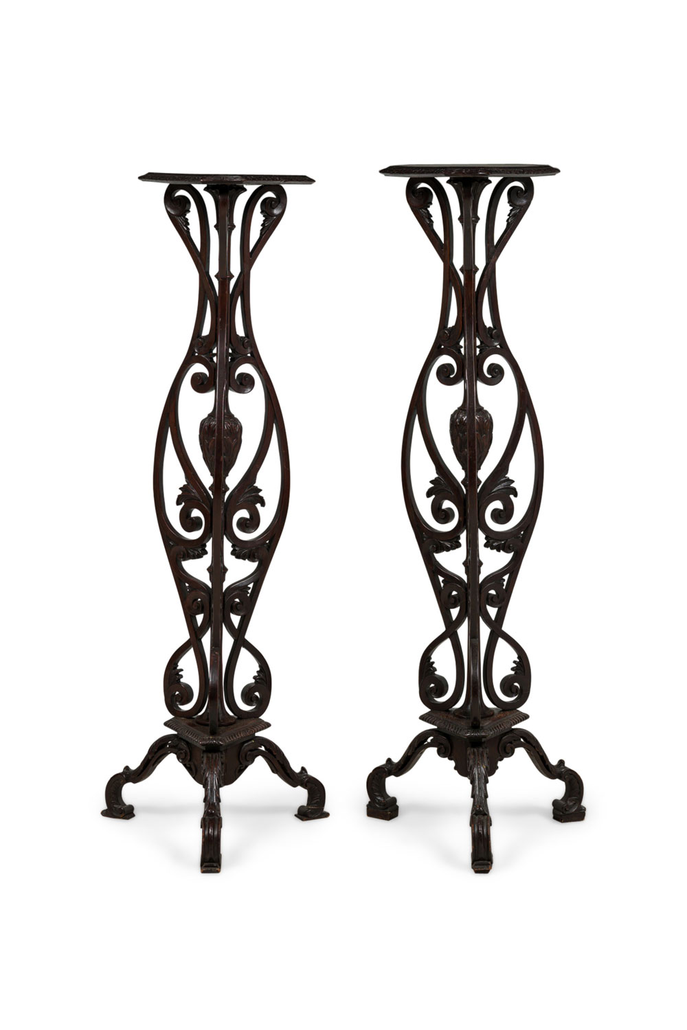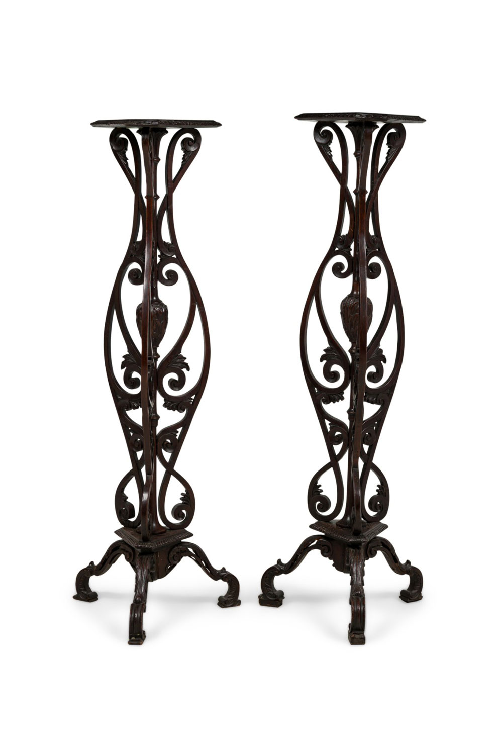 2 English Chippendale style (19th Cent) mahogany pedestals with open scroll design and triangular filigree gallery top. (Priced Each).