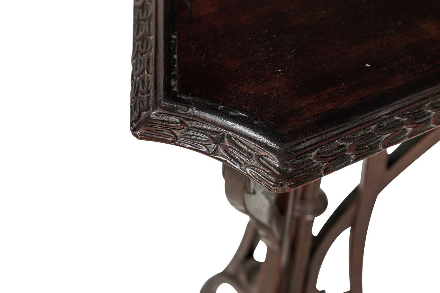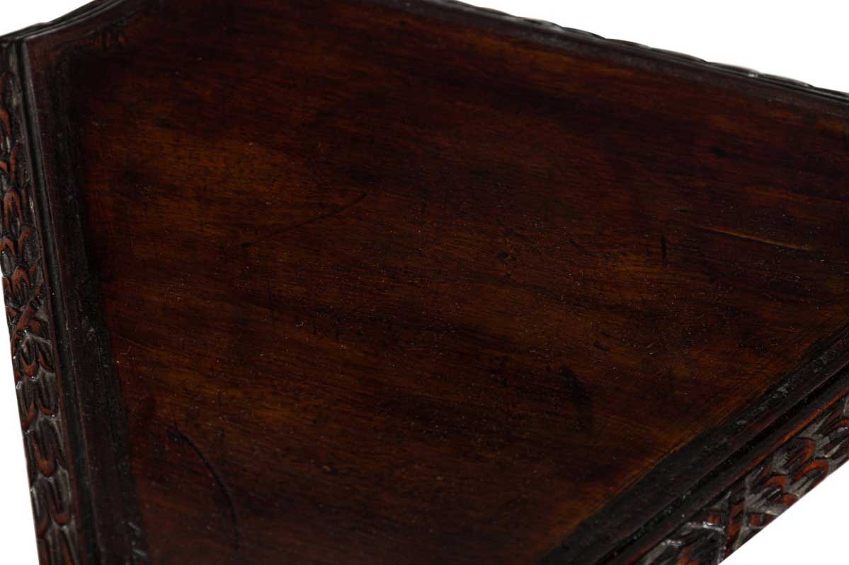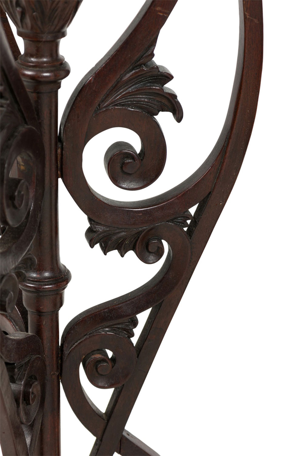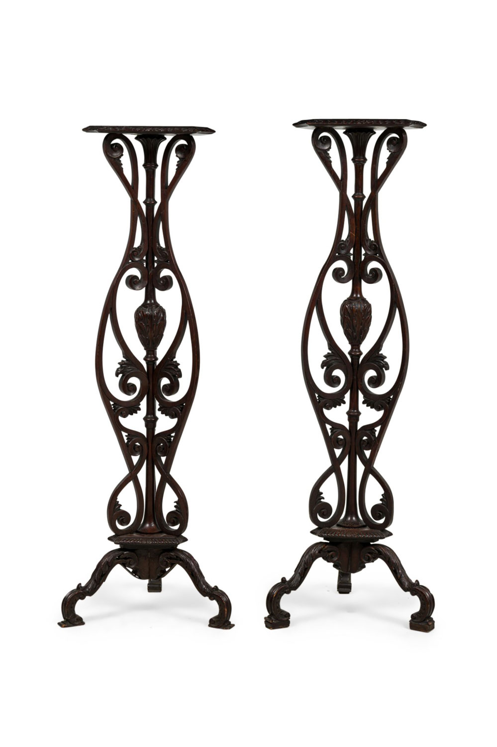 2 English Chippendale style (19th Cent) mahogany pedestals with open scroll design and triangular filigree gallery top. (Priced Each).