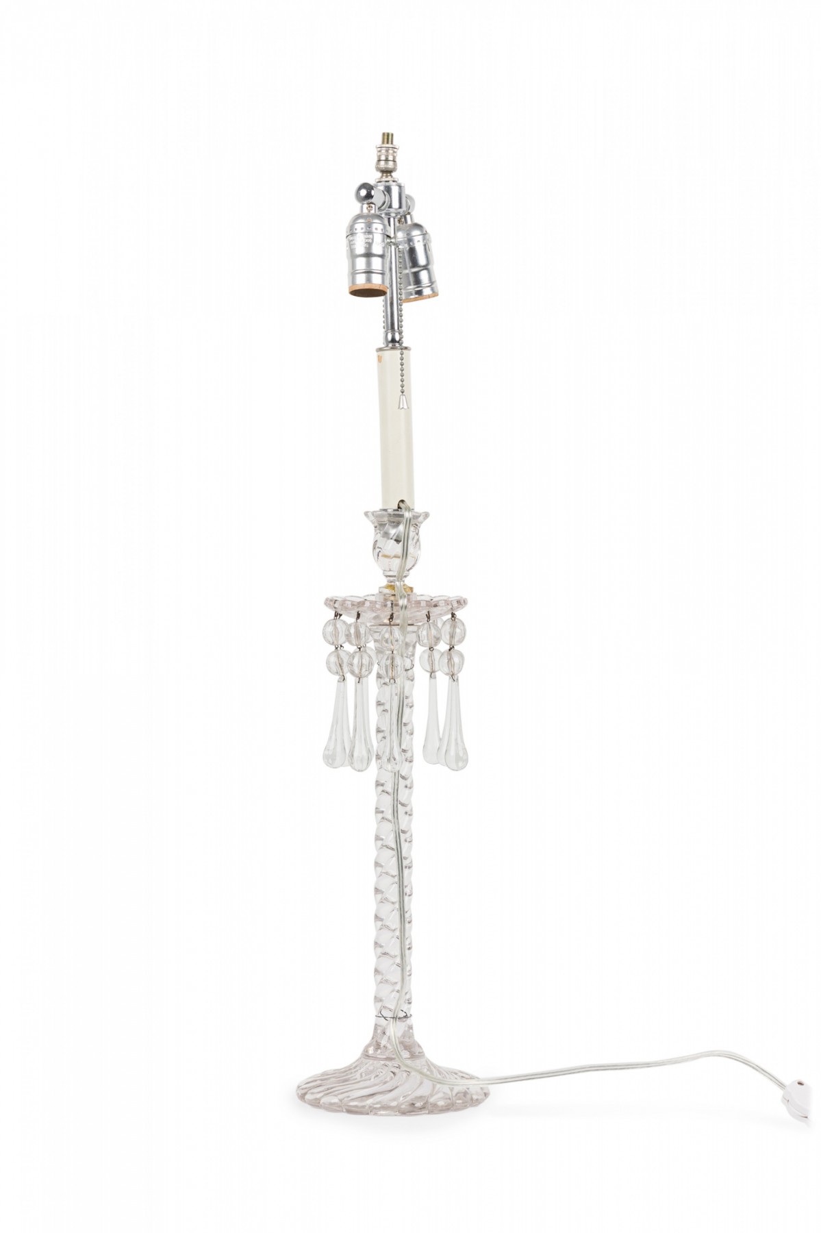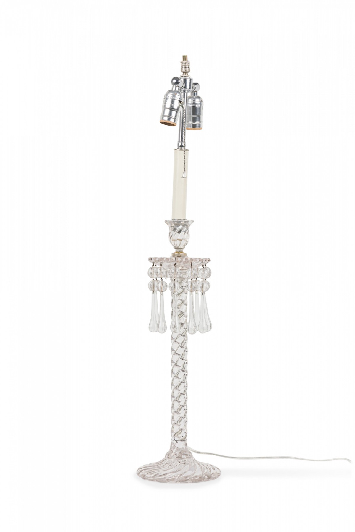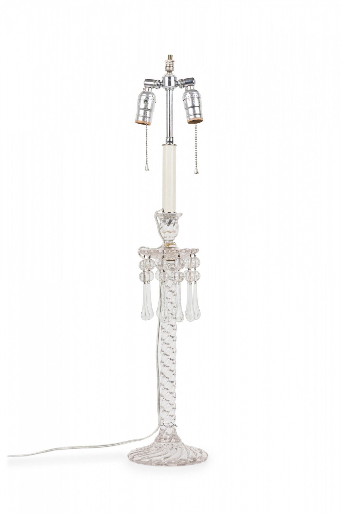 2 English Victorian style crystal glass table lamps featuring two adjustable silver metal light sockets, supported by a machine cut glass faux rope form column which includes sphere/teardrop ornaments suspended from an upturned flower form bowl ending in a circular base. (PRICED EACH)